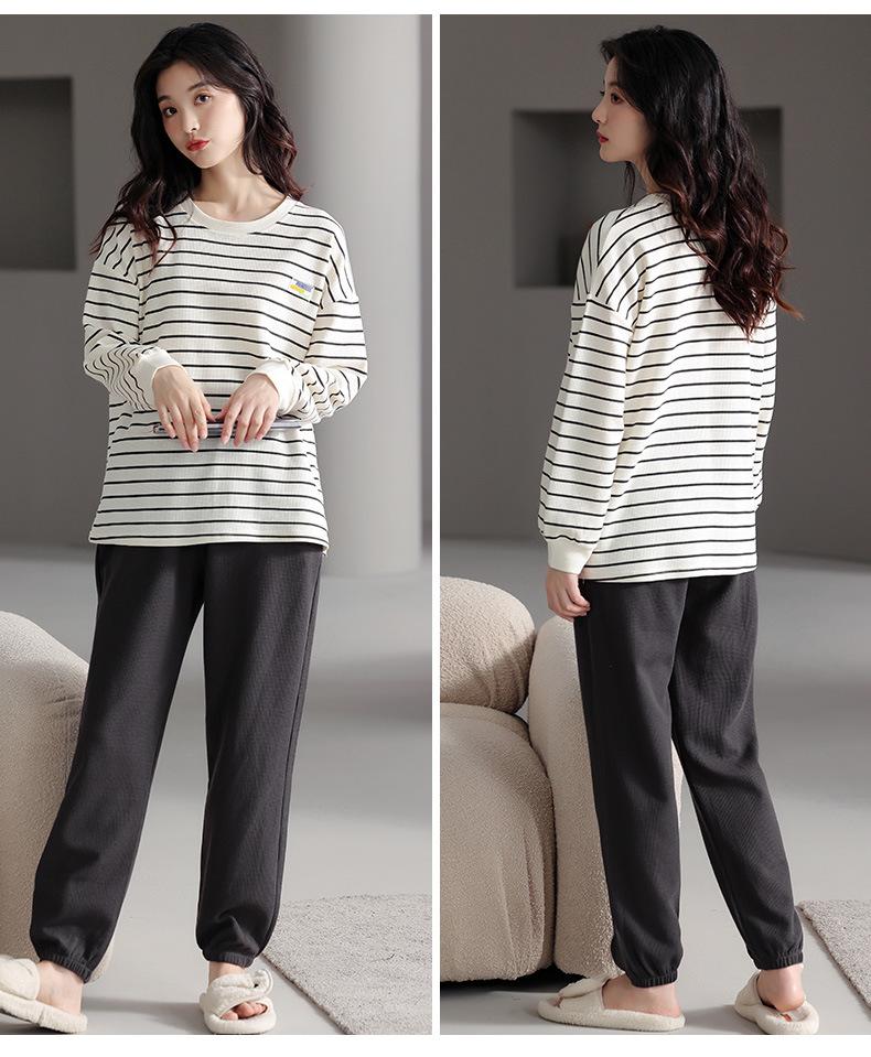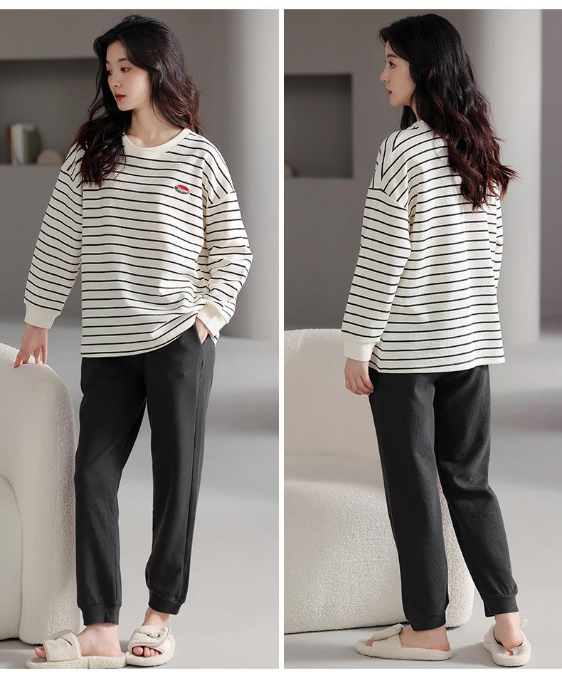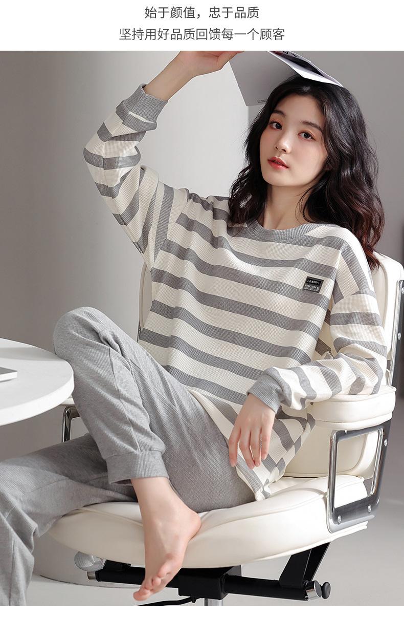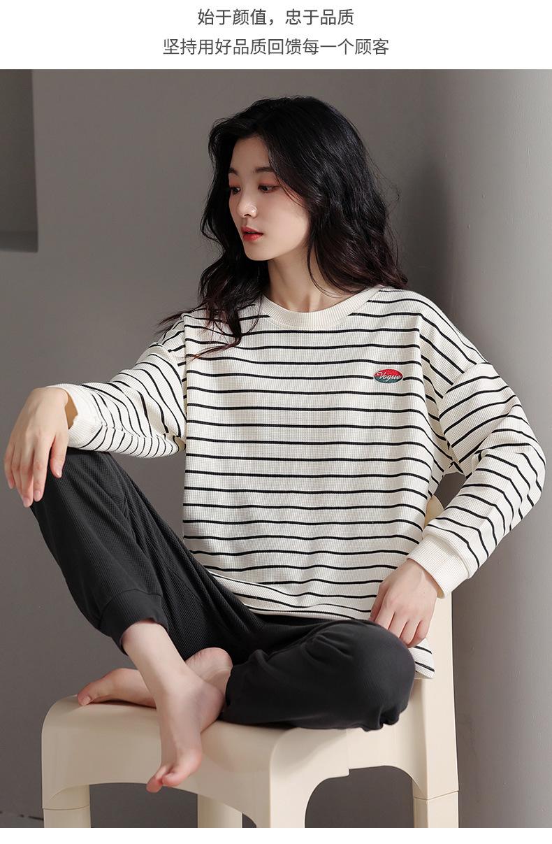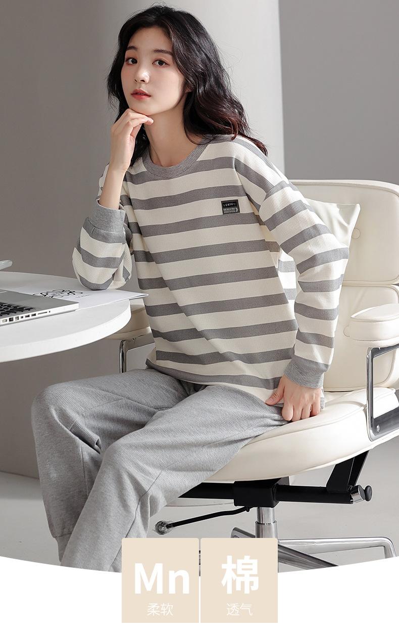 Pijamas de mujer de primavera y otoño de algodón puro de manga larga a rayas con cuello de gofre, ropa informal para el hogar, traje de primavera de talla grande