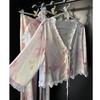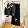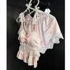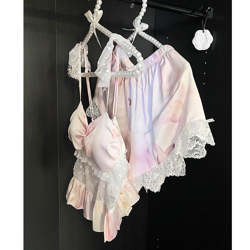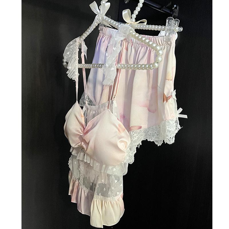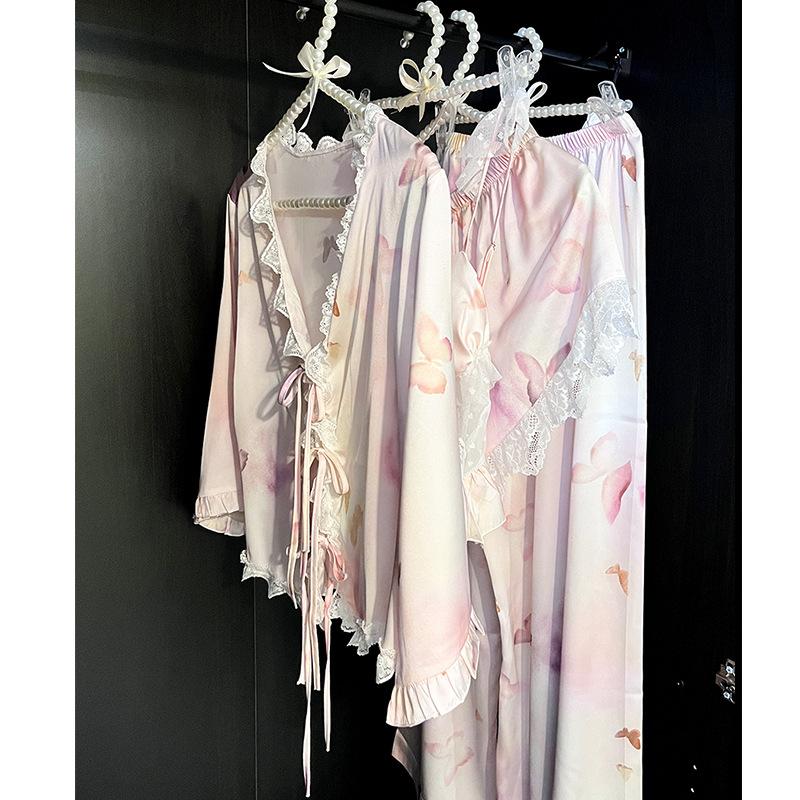 Pijama de encaje de mariposa dulce de hadas de cuatro piezas para mujer, primavera y otoño, seda de hielo suave, ropa para el hogar de seda