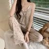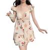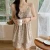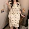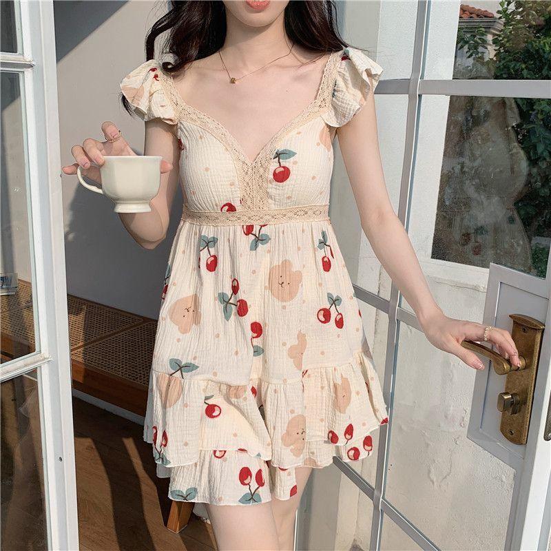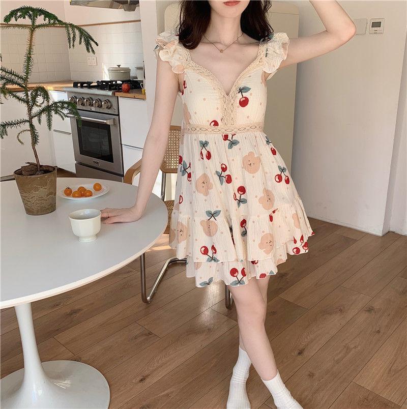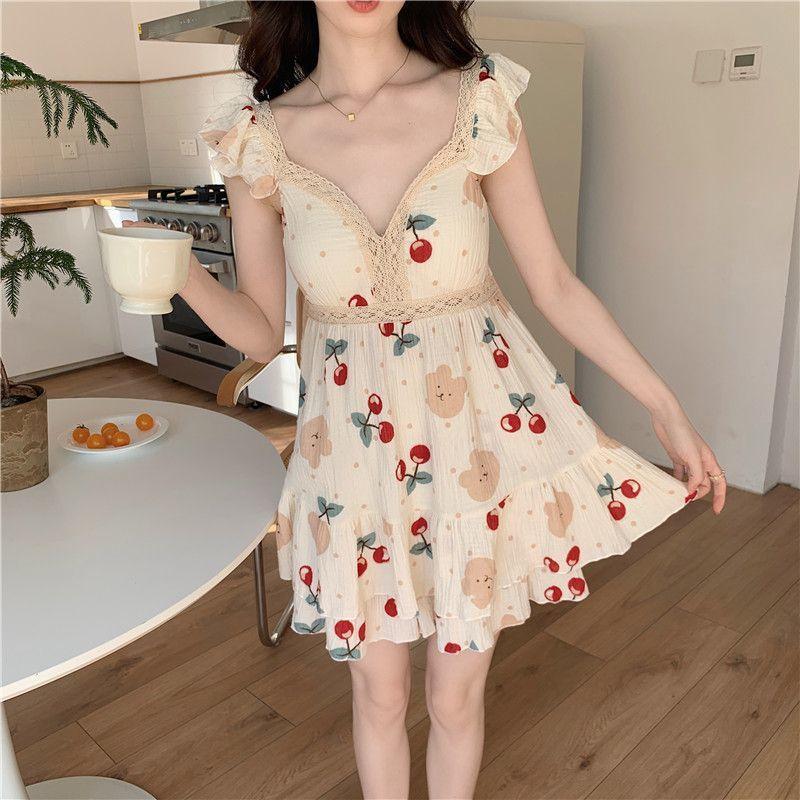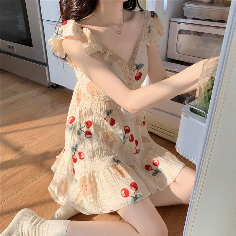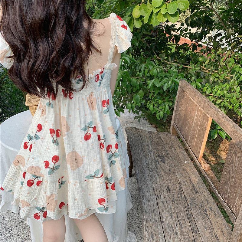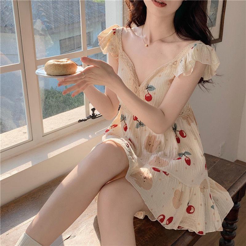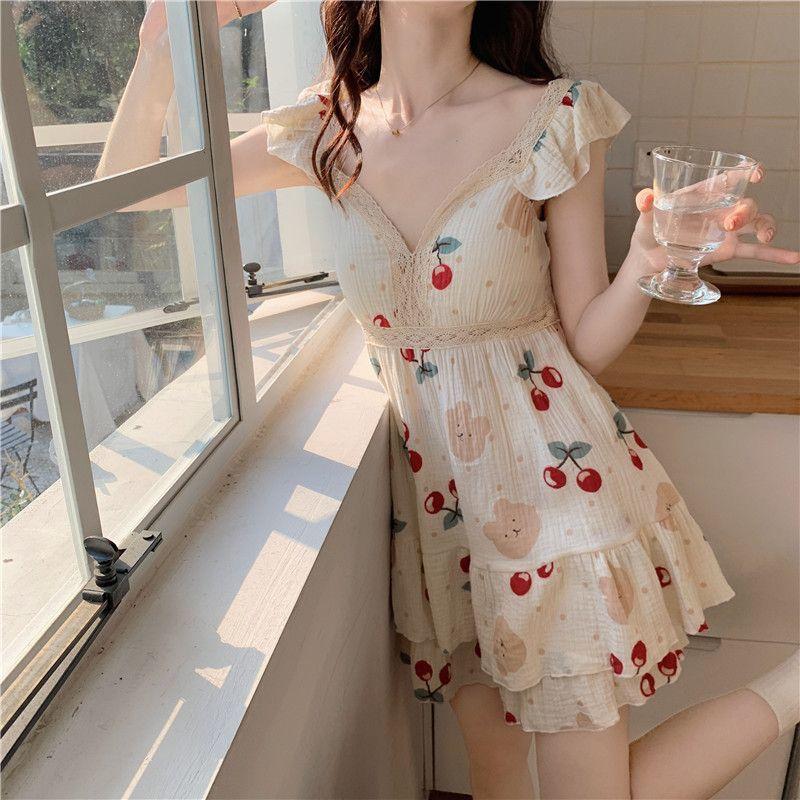 Camisón estilo Pure Lust con protectores de pecho, bonito camisón de largo medio con osito de cereza y tirantes, ropa de casa fina de verano.