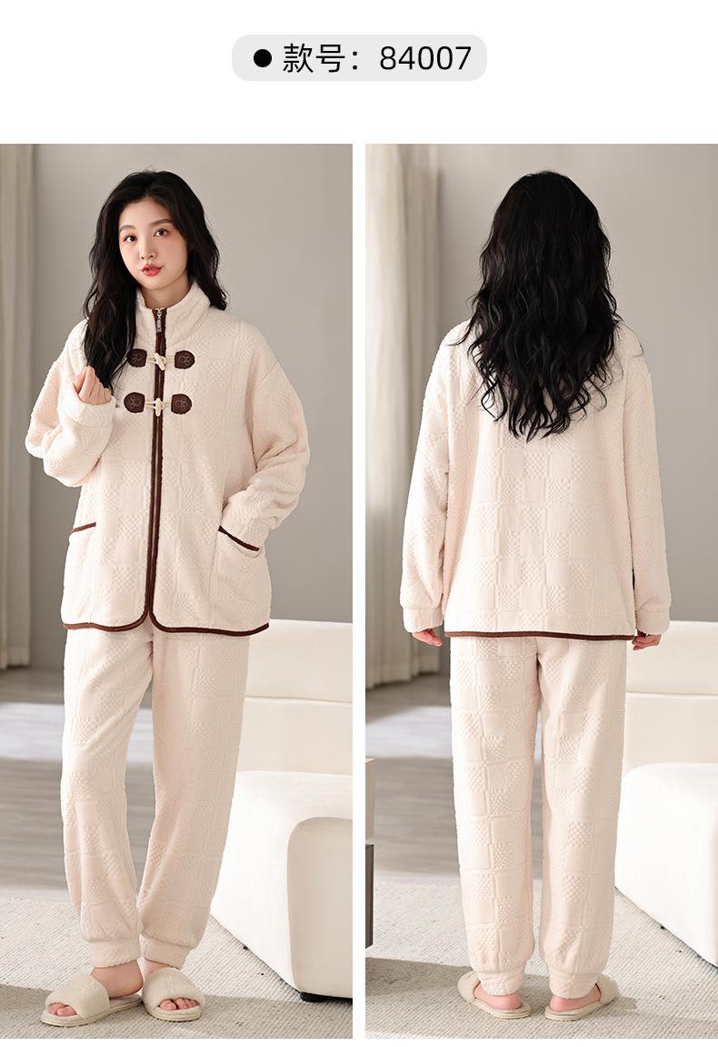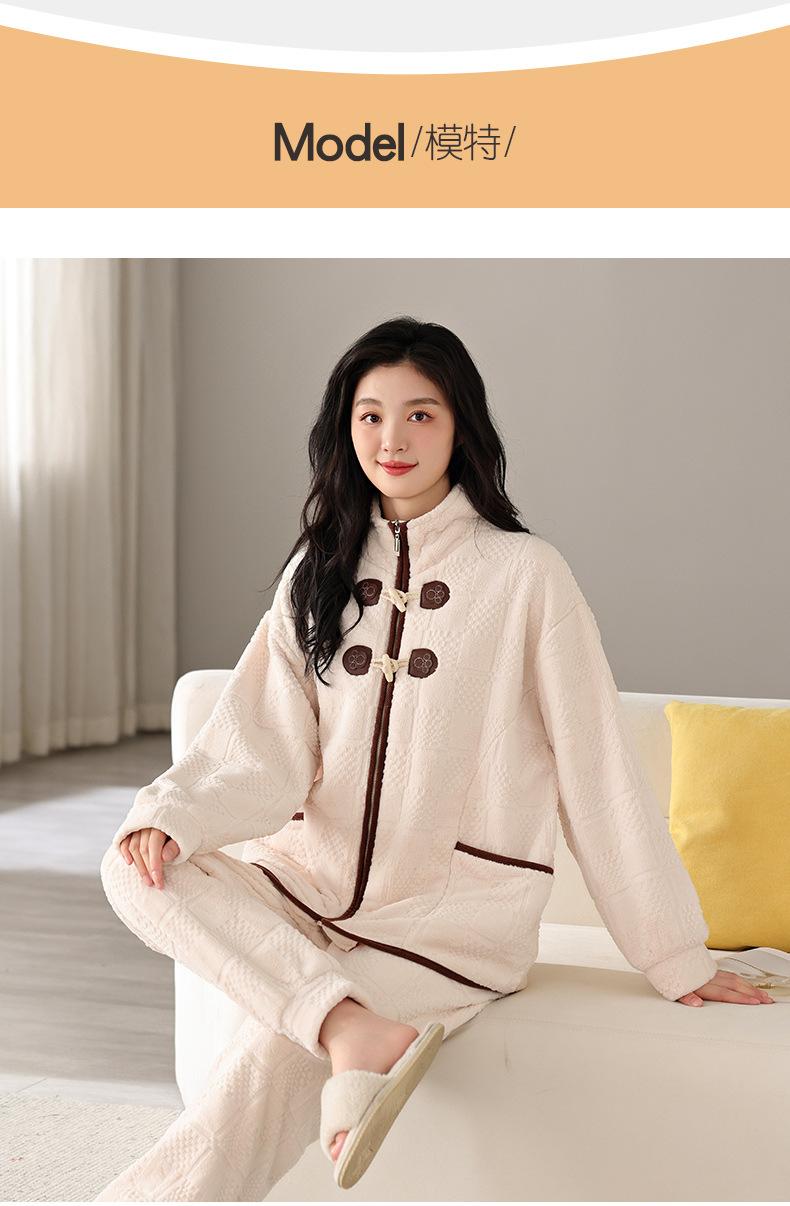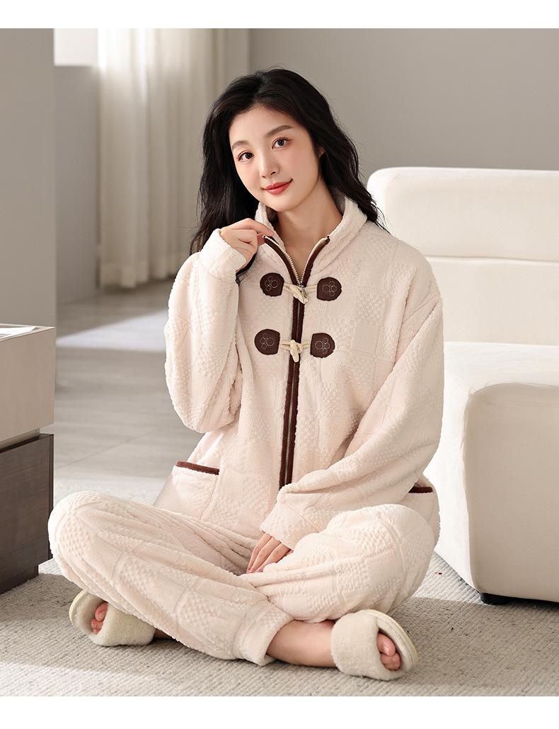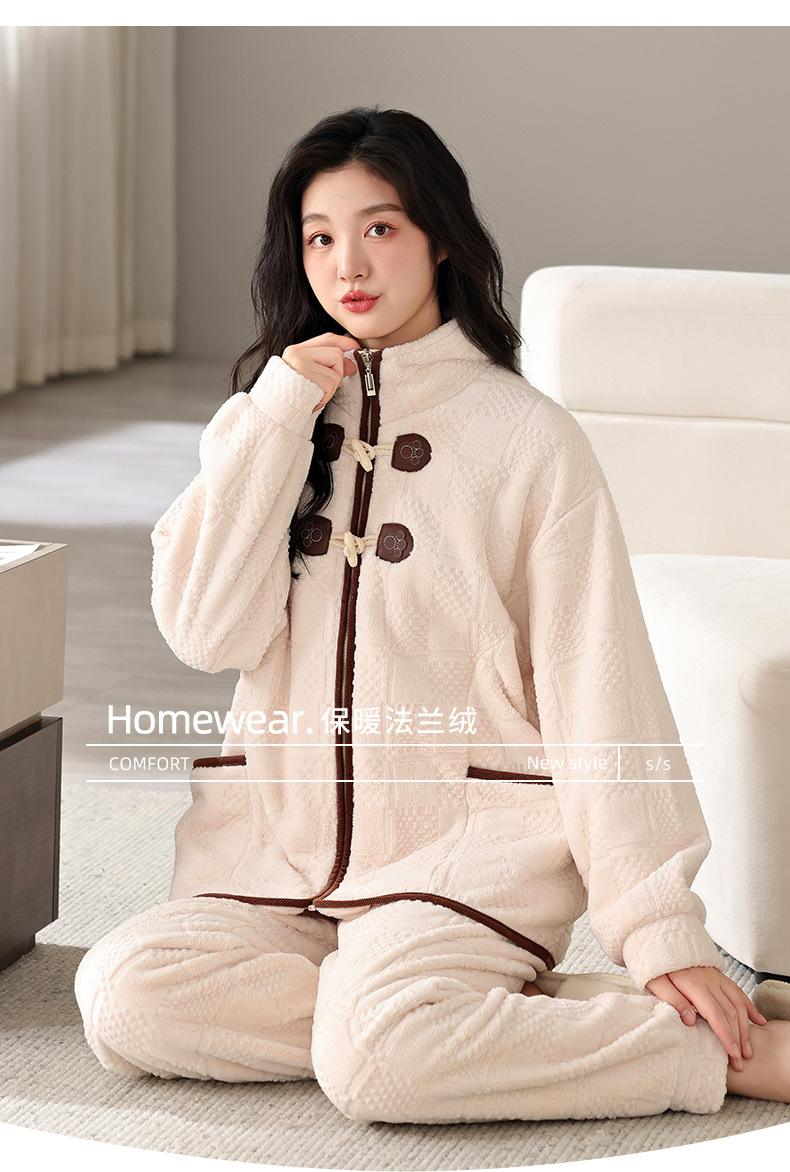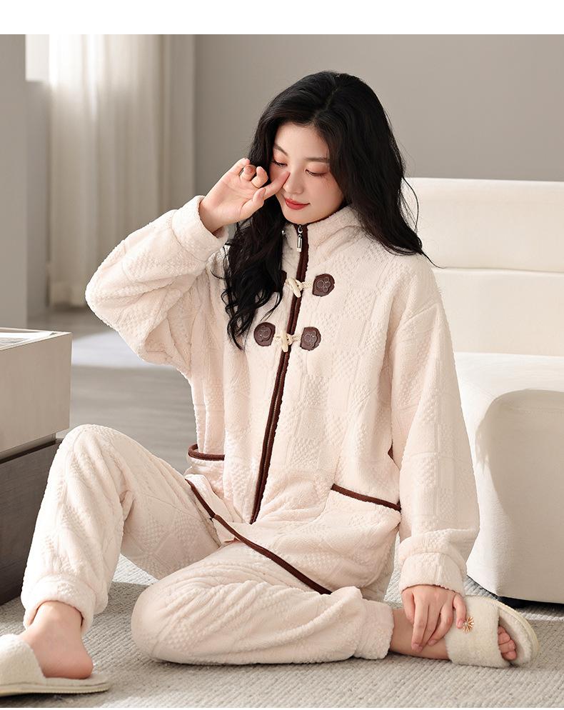 Pijamas de mujer de invierno de forro polar coral grueso con forro polar cálido para otoño e invierno, franela de estilo perezoso, retro con hebilla de cuernos, ropa para el hogar