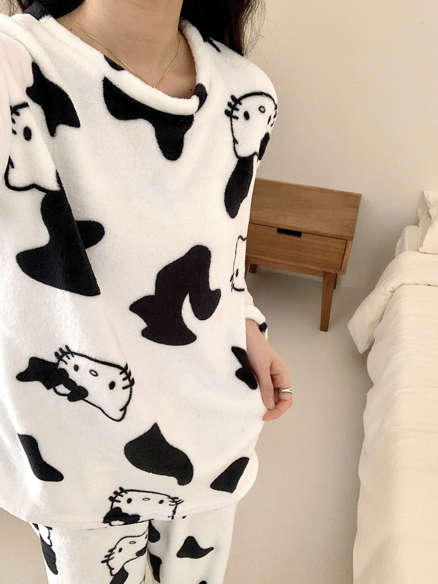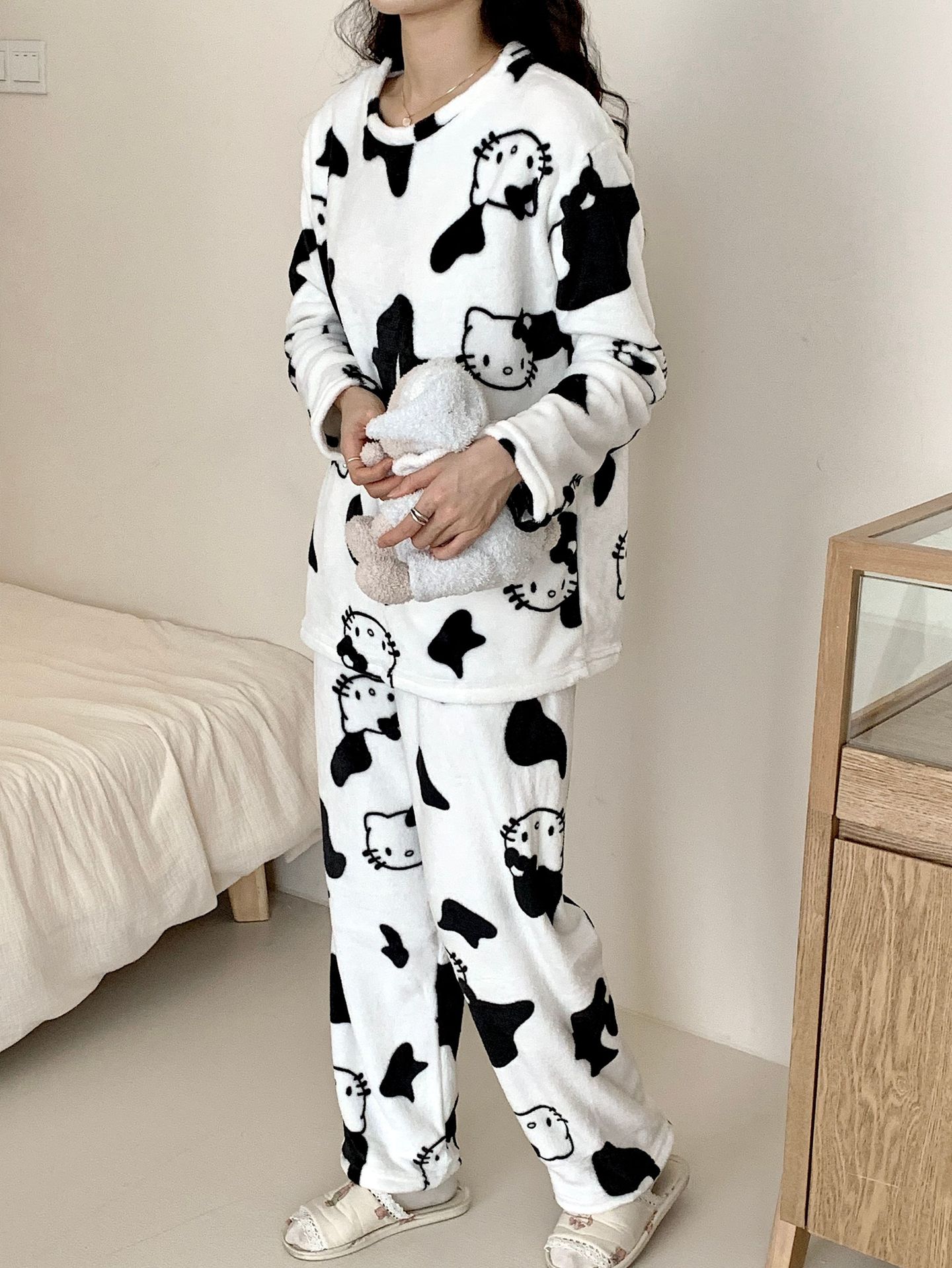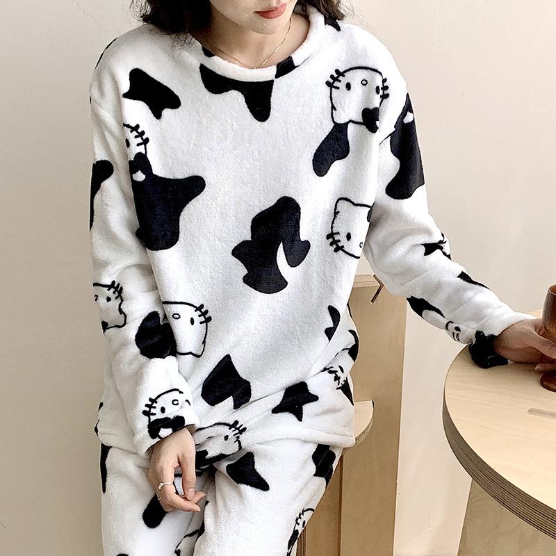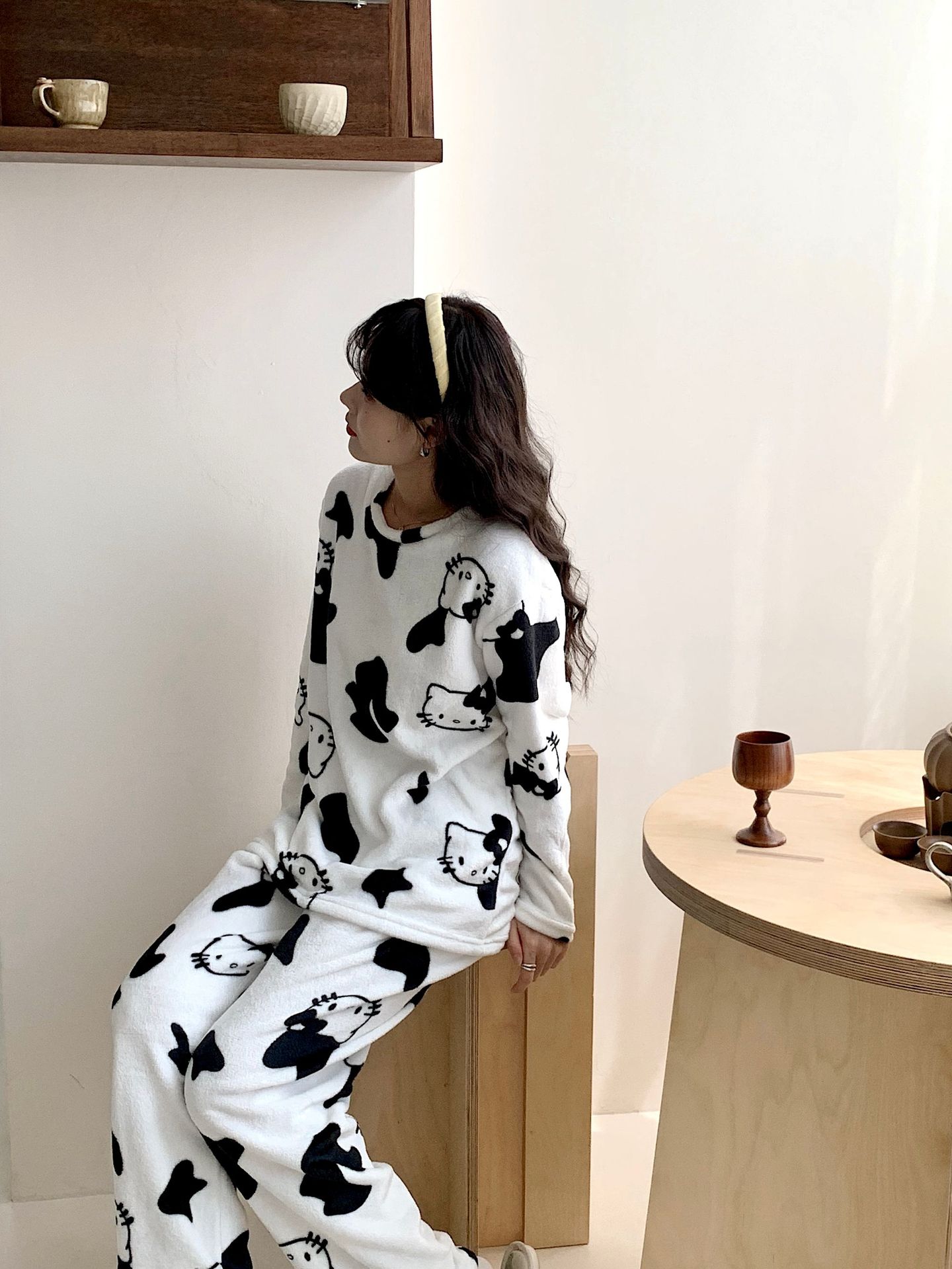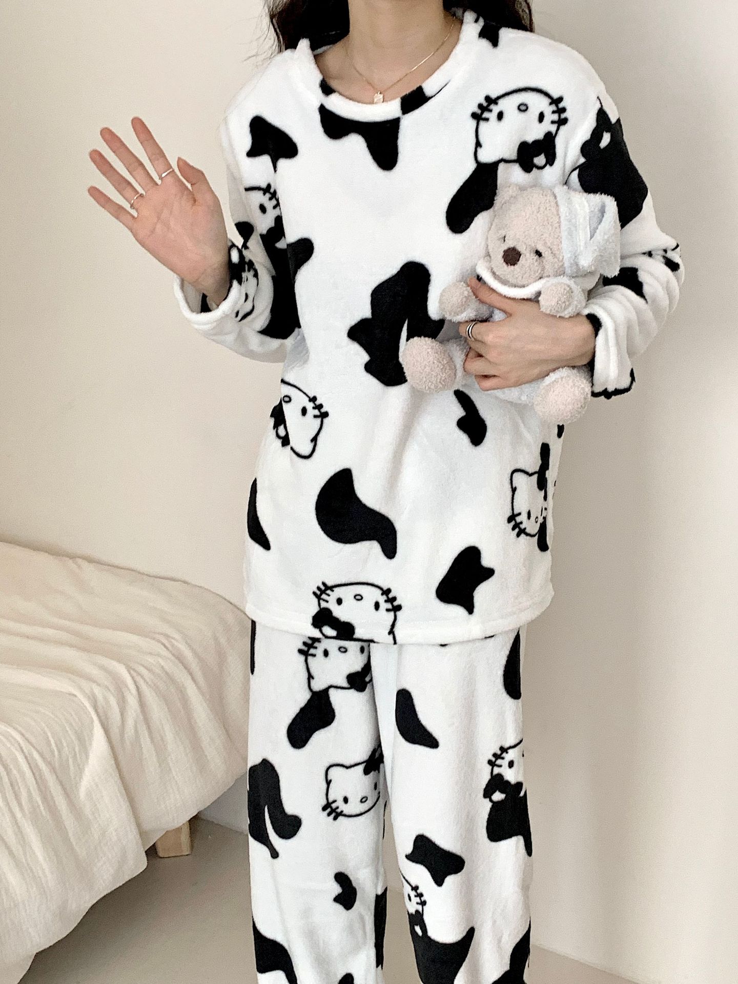 Conjunto de Pijama Cálido de Otoño e Invierno para Mujer Franela Gruesa Suelta Estilo Coreano Dibujos Animados Kt Cat Casual Ropa de Casa de Invierno