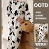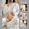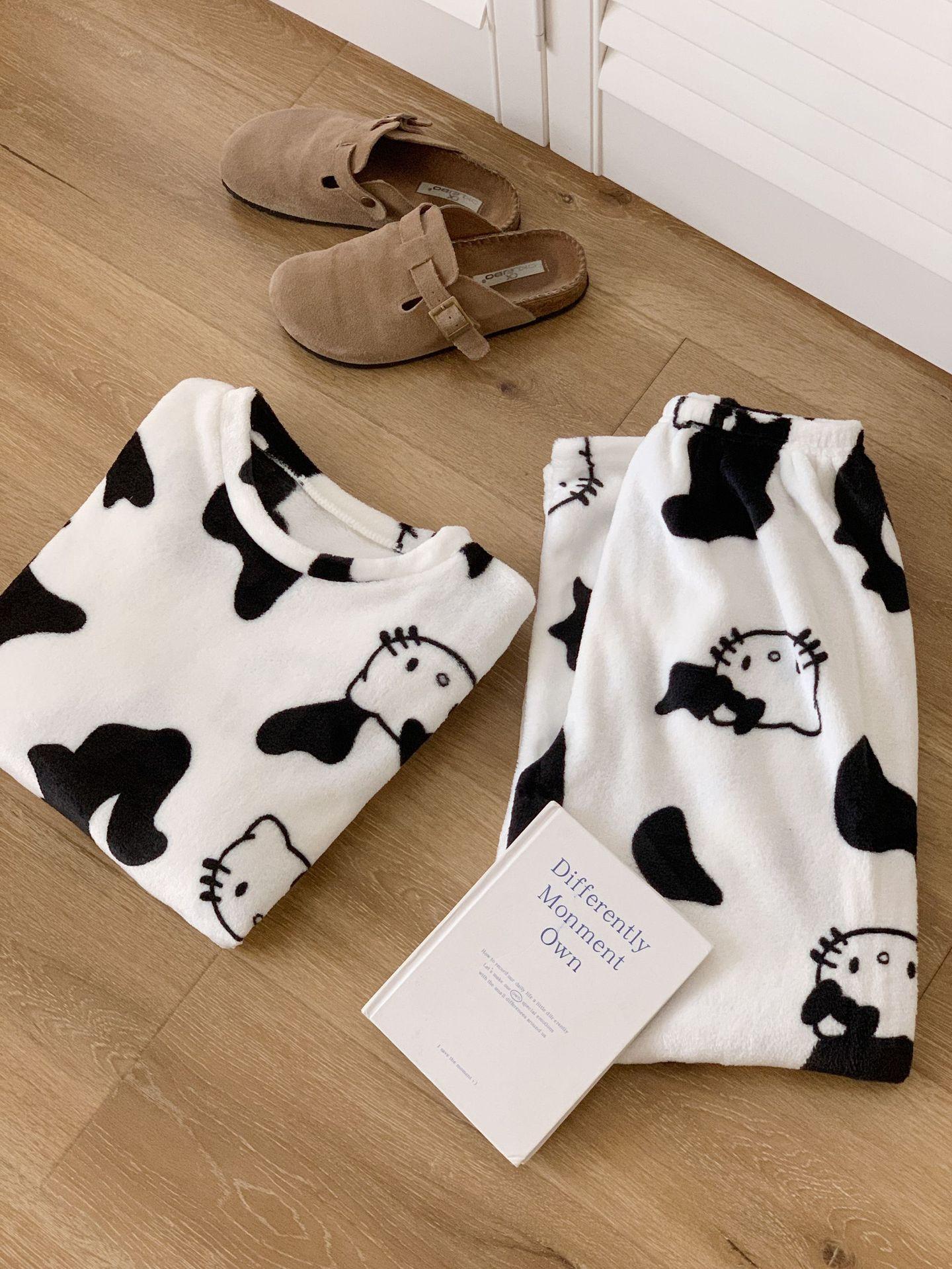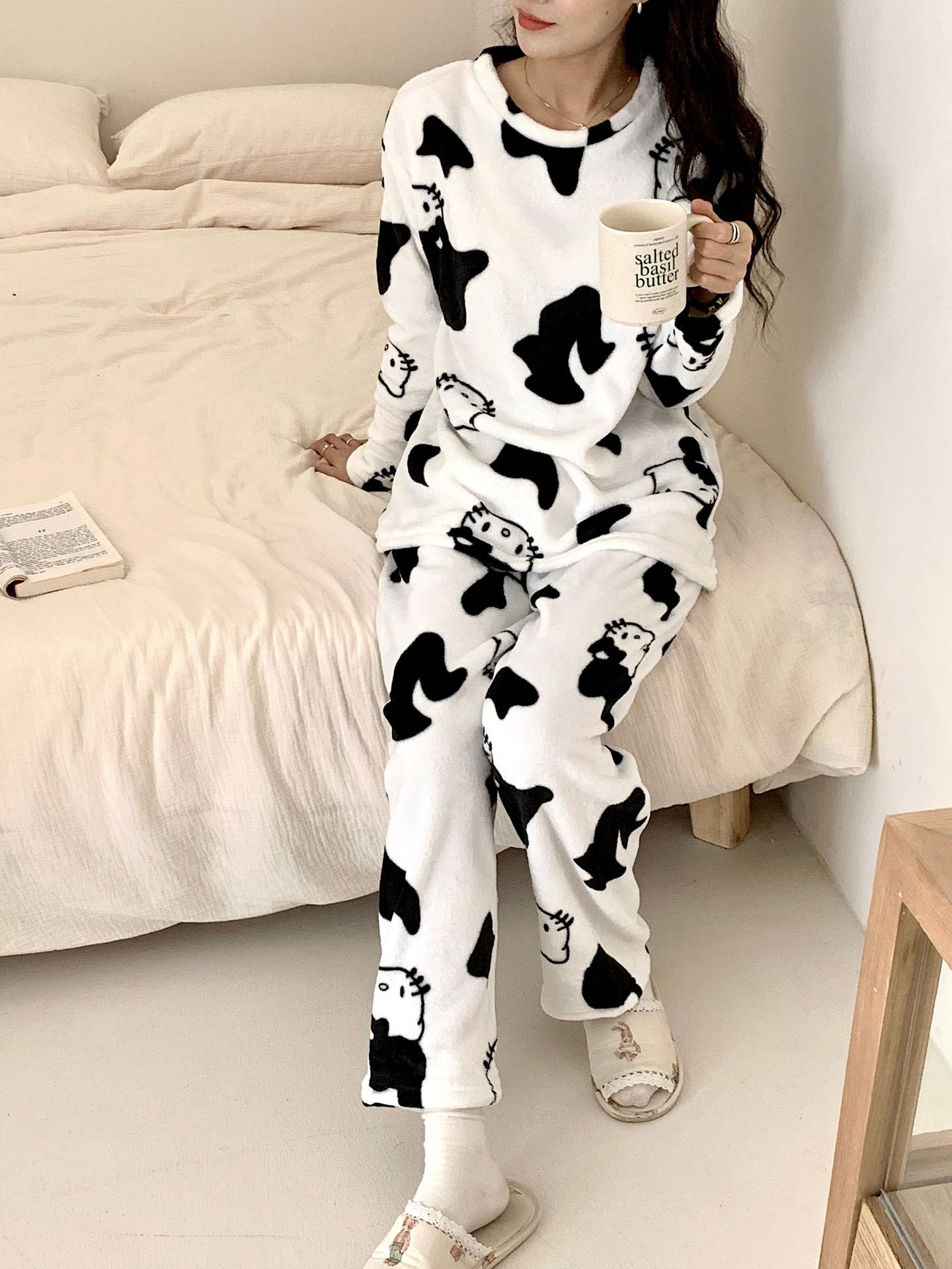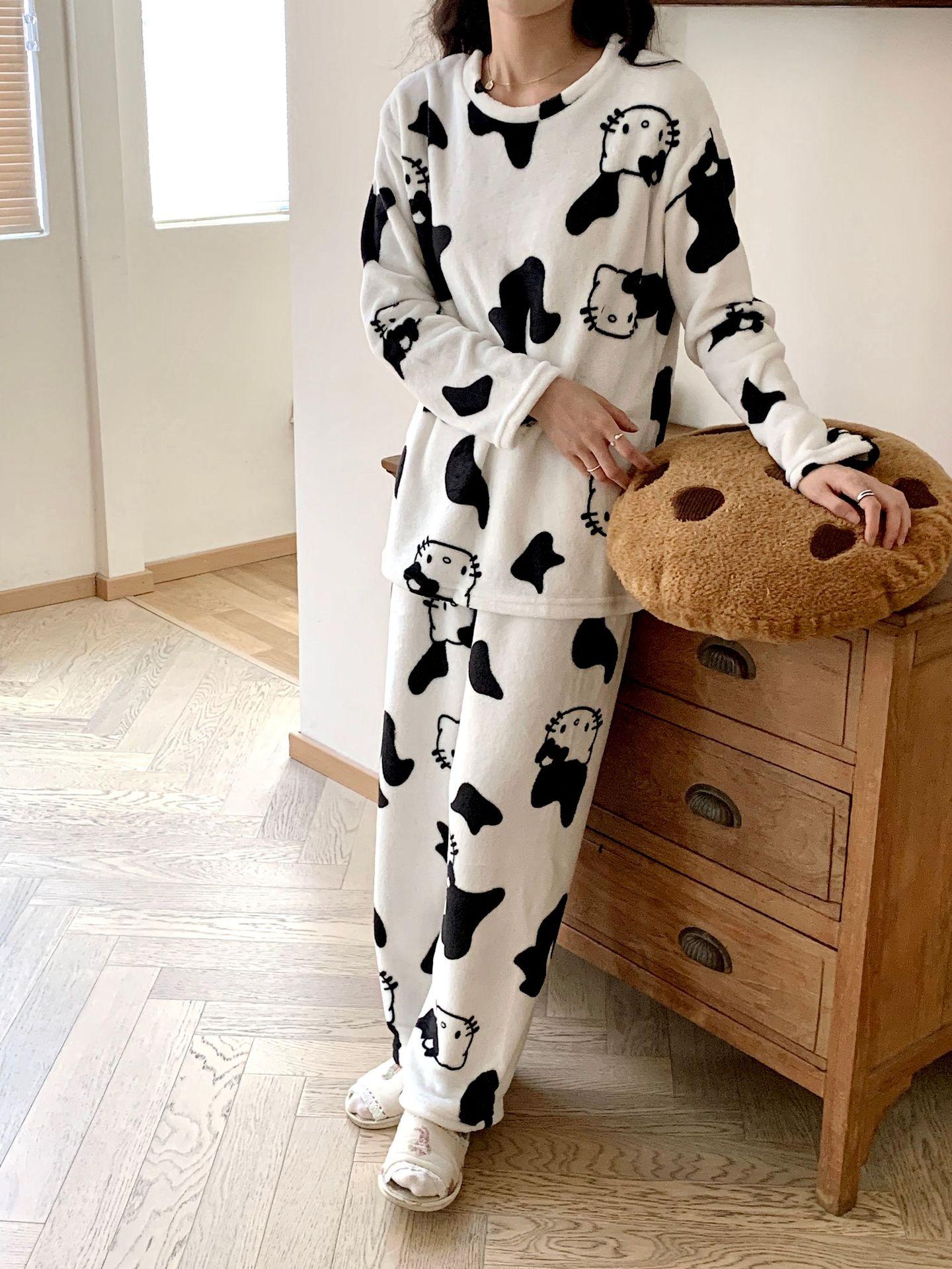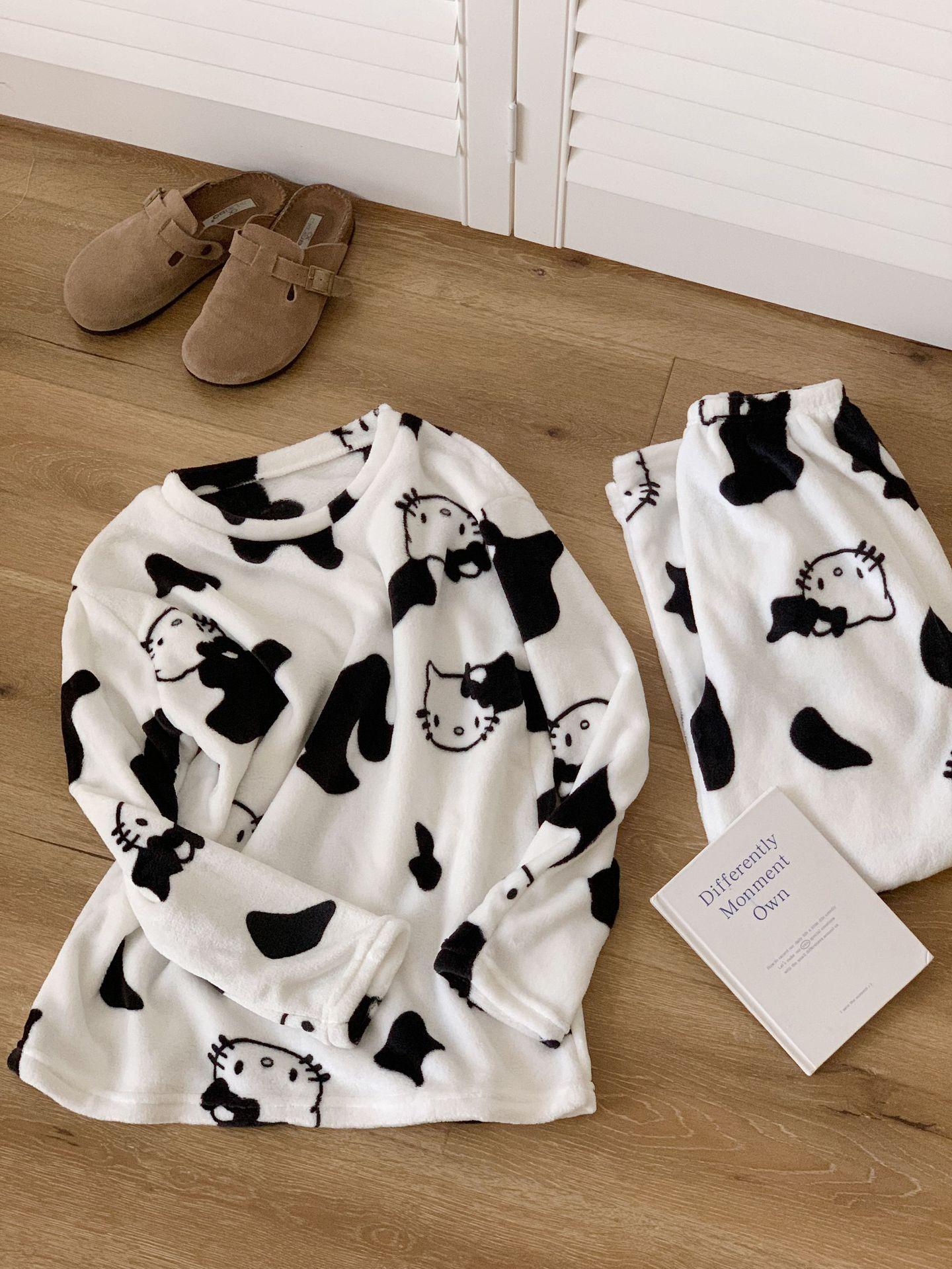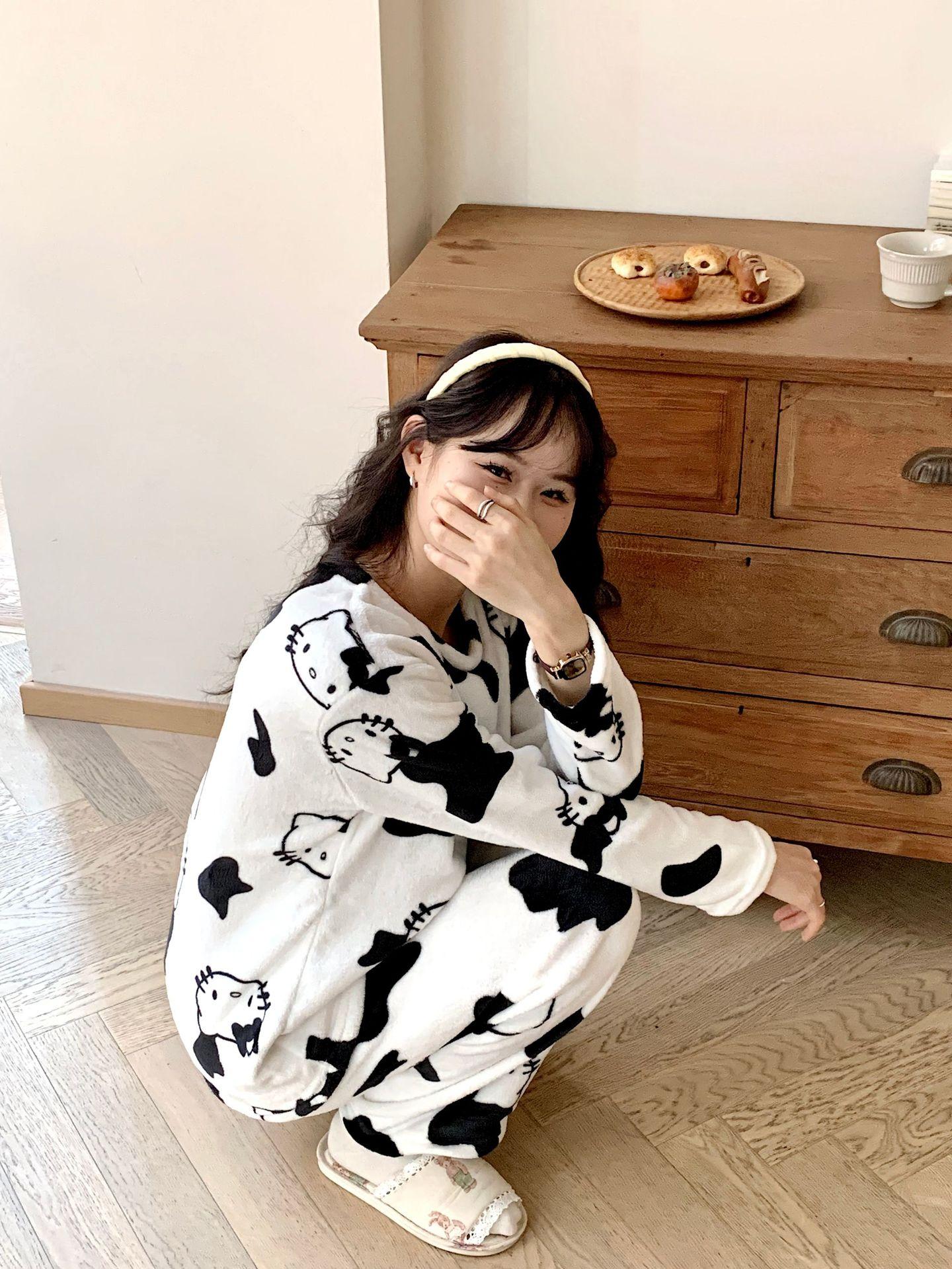 Conjunto de Pijama Cálido de Otoño e Invierno para Mujer Franela Gruesa Suelta Estilo Coreano Dibujos Animados Kt Cat Casual Ropa de Casa de Invierno