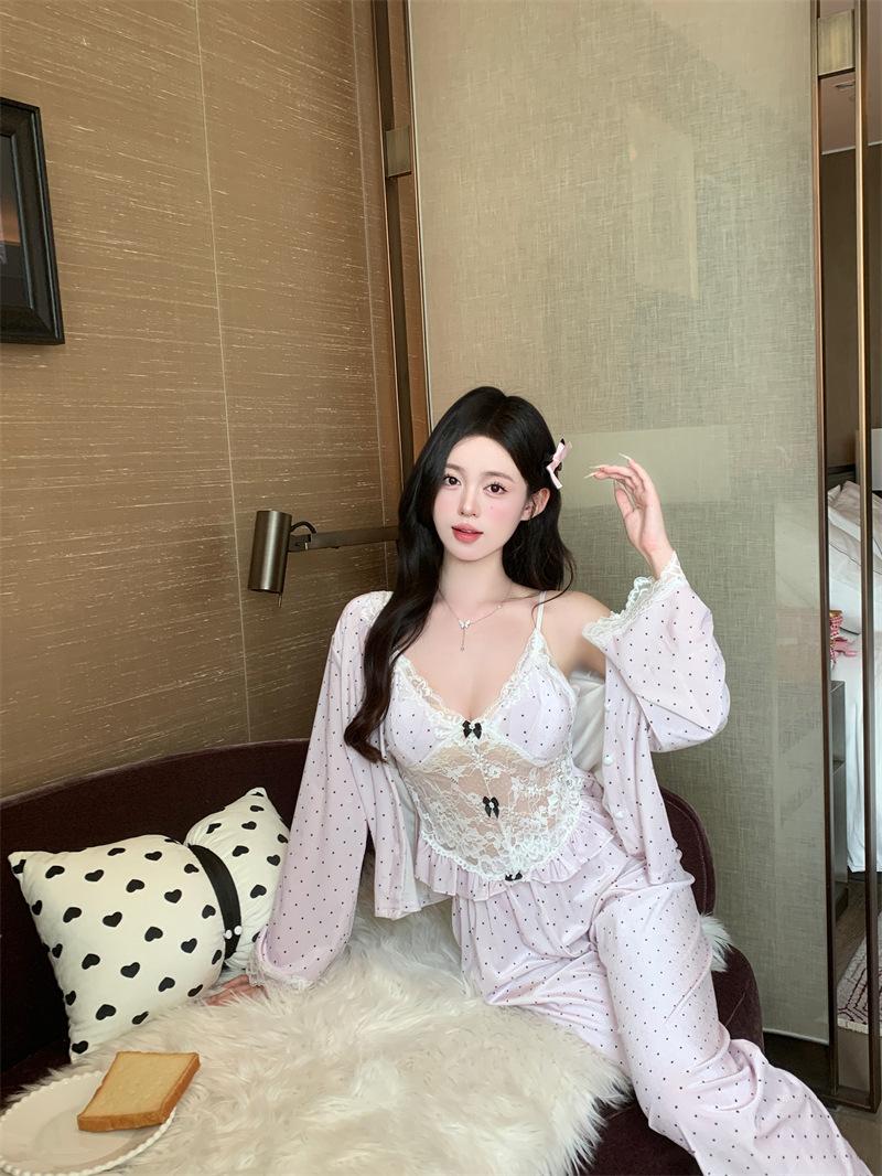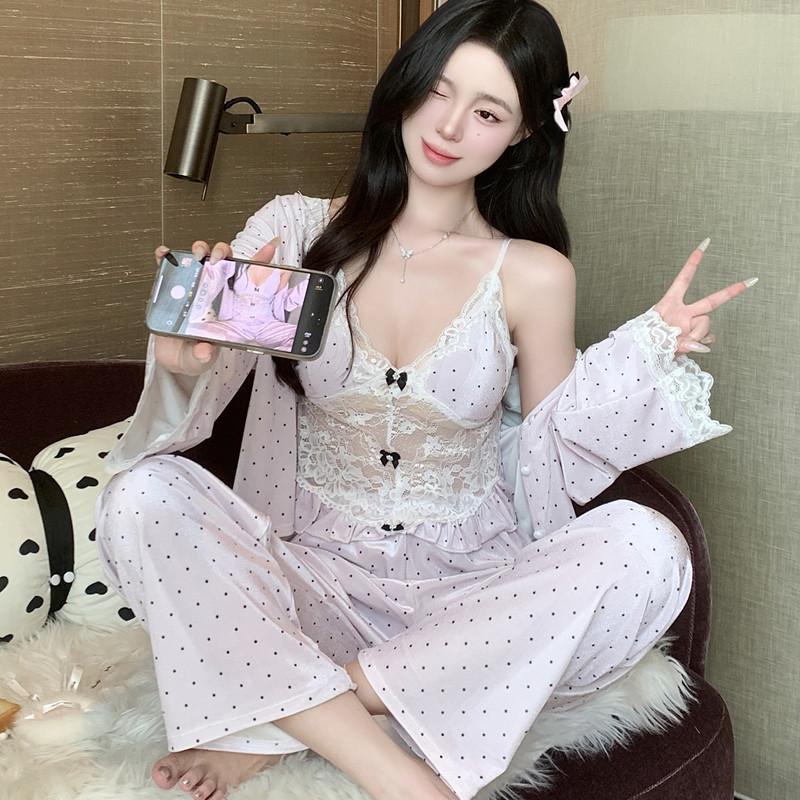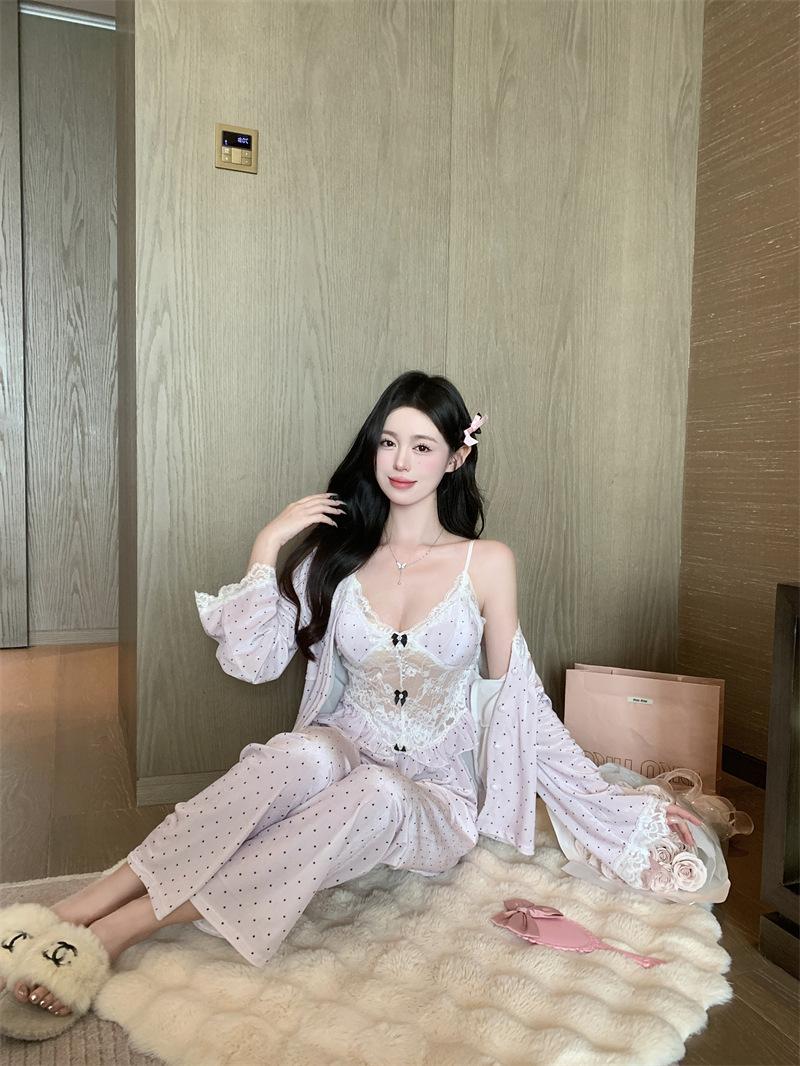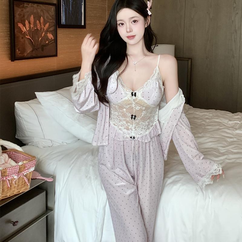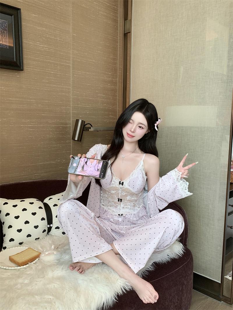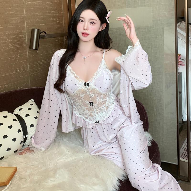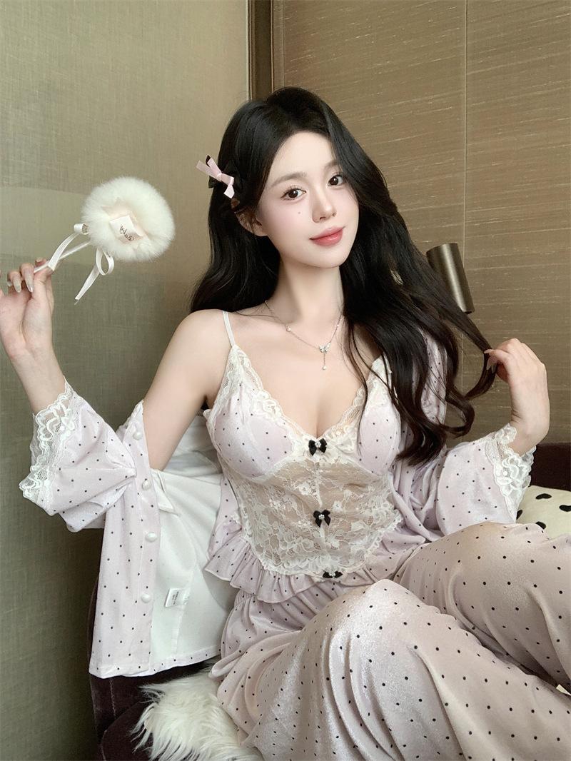 Pijama de Terciopelo Dorado con Lunares Ondulados Transfronterizo Traje de Mujer Pijama Sexy con Tirantes y Almohadilla en el Pecho Conjunto de Tres Piezas Ropa para el Hogar