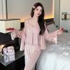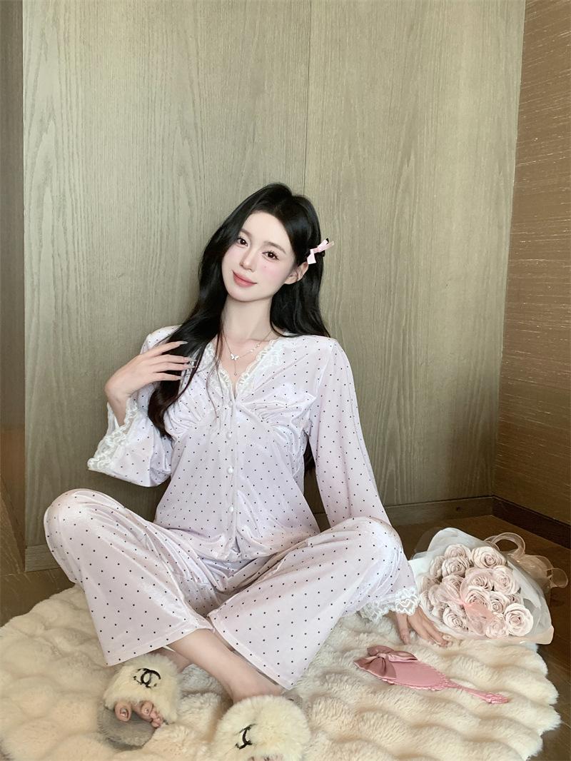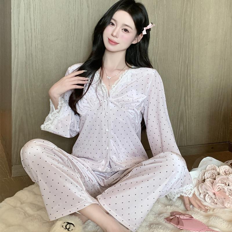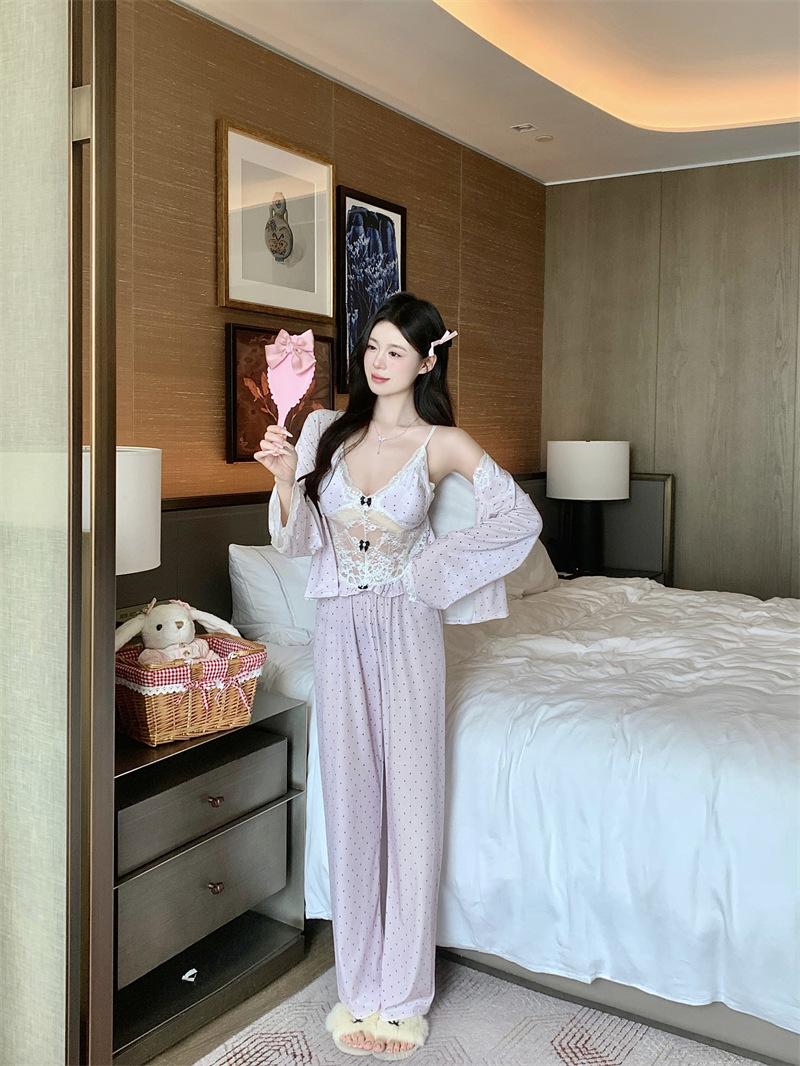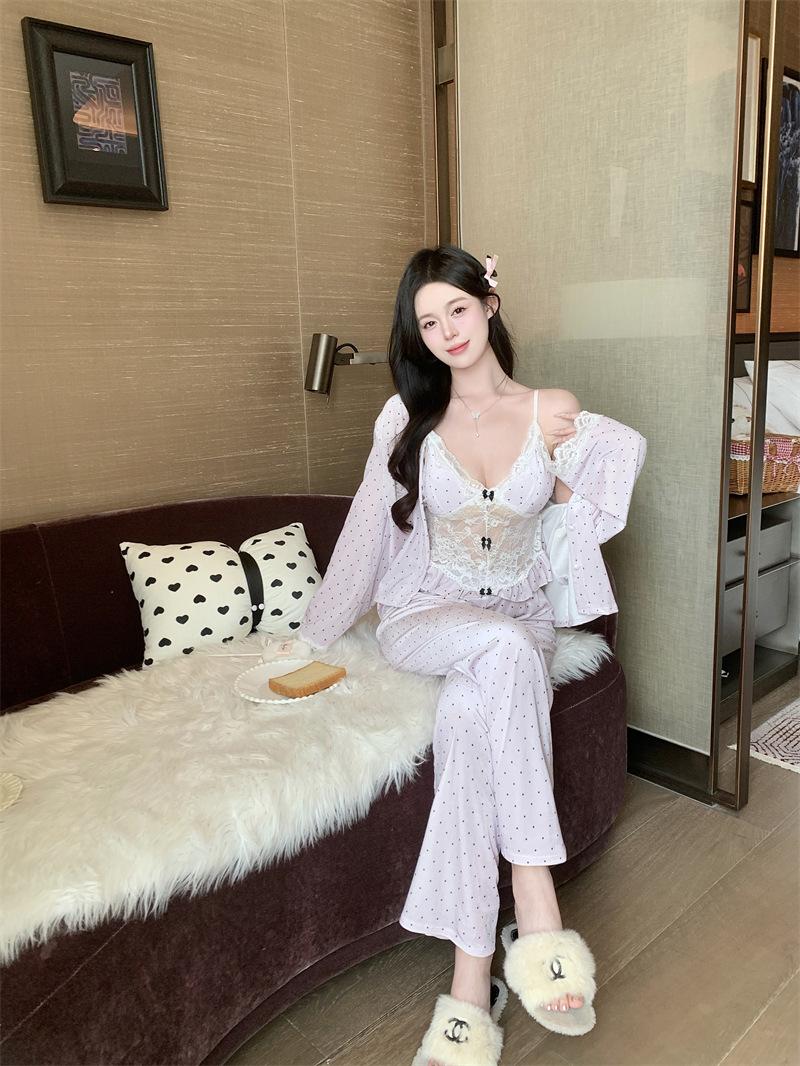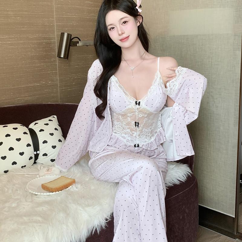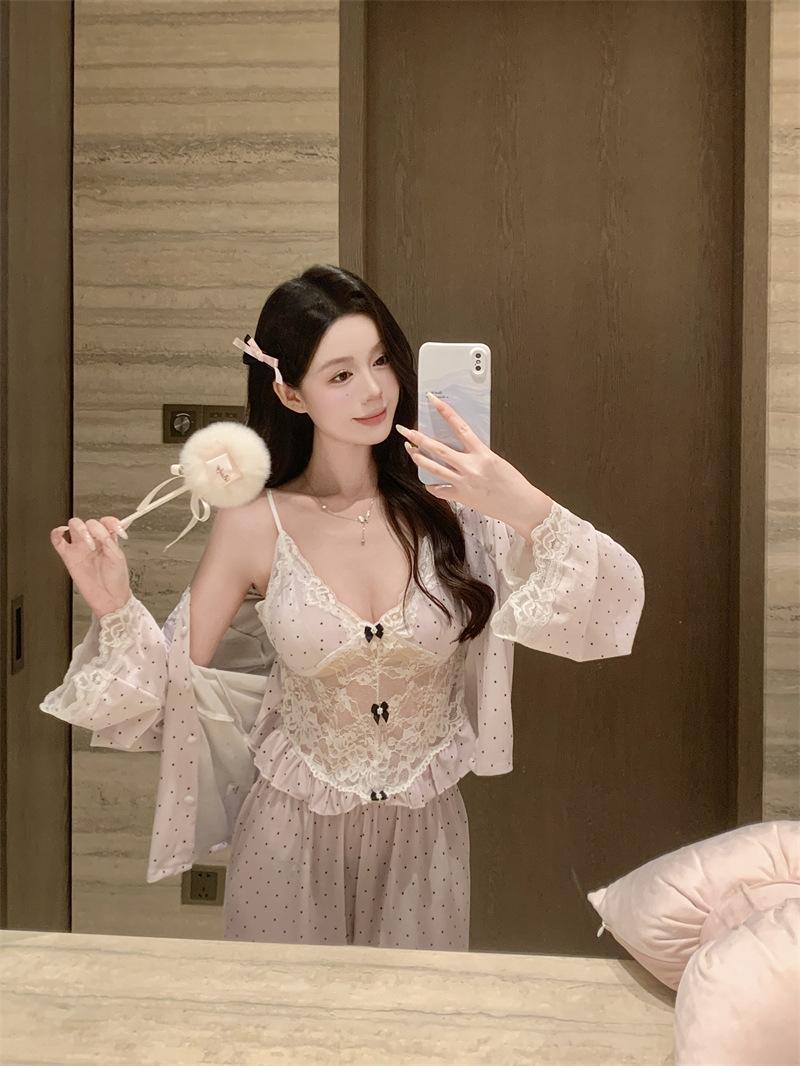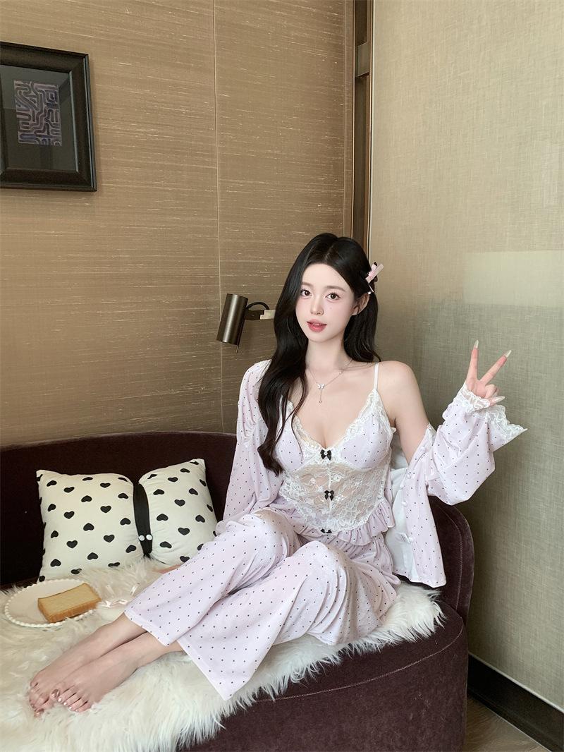 Pijama de Terciopelo Dorado con Lunares Ondulados Transfronterizo Traje de Mujer Pijama Sexy con Tirantes y Almohadilla en el Pecho Conjunto de Tres Piezas Ropa para el Hogar