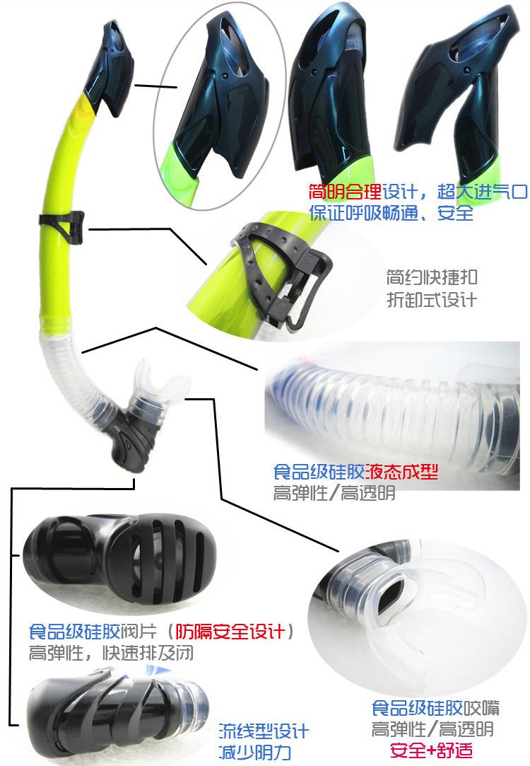 Al usar, el tubo de respiración y la máscara están atados juntos, coloque la boquilla entre sus labios y dientes, cierre los labios firmemente y coloque el cuerpo del tubo frente a sus orejas para evitar que la boquilla le raspe la boca o cause fatiga en la mandíbula.