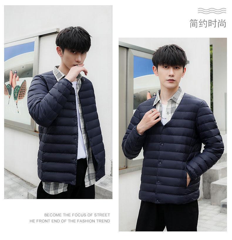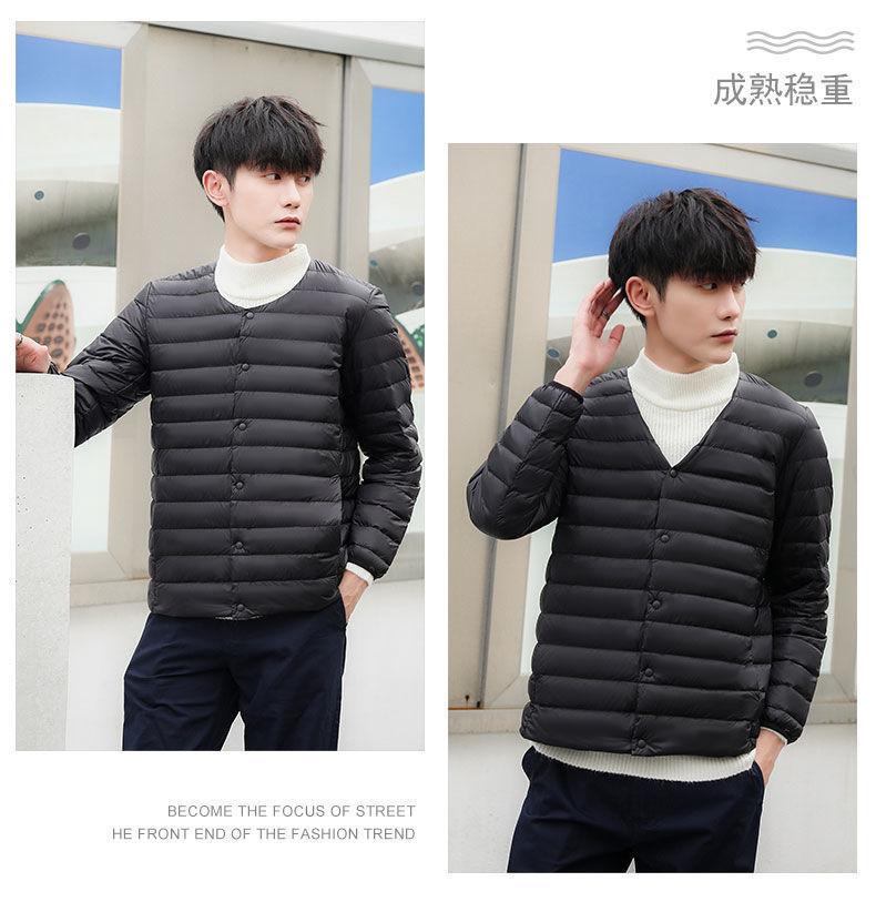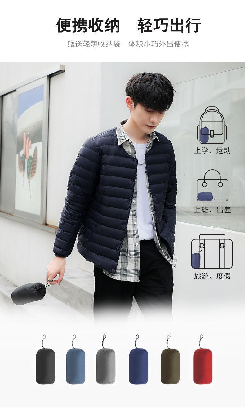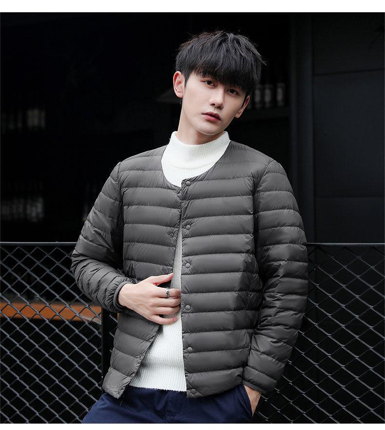 2025 Nueva Chaqueta de Plumas Ligera para Hombre Corta Cuello Redondo Cálida Forro Manga Larga Ajustada Delgada Talla Grande Chaqueta de Invierno