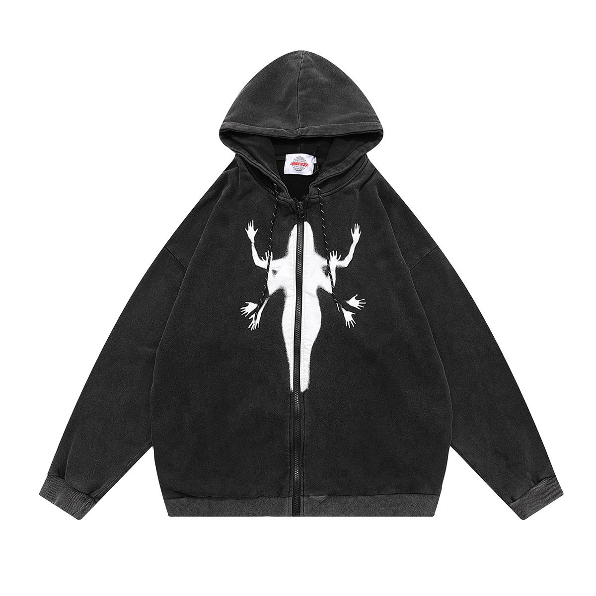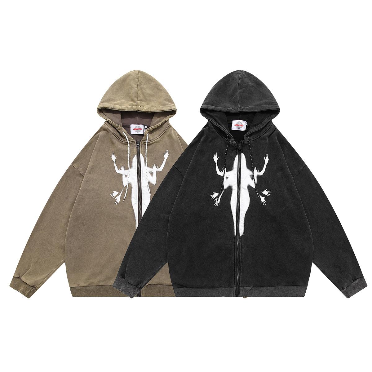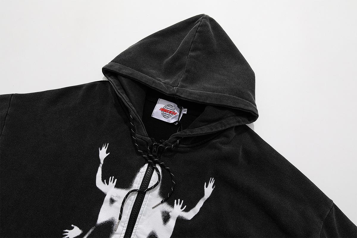 Marca de moda Jiayiku High Street Americano cárdigan suéter abrigo otoño e invierno Nuevo Figura fantasma sudadera con capucha lavado pesado