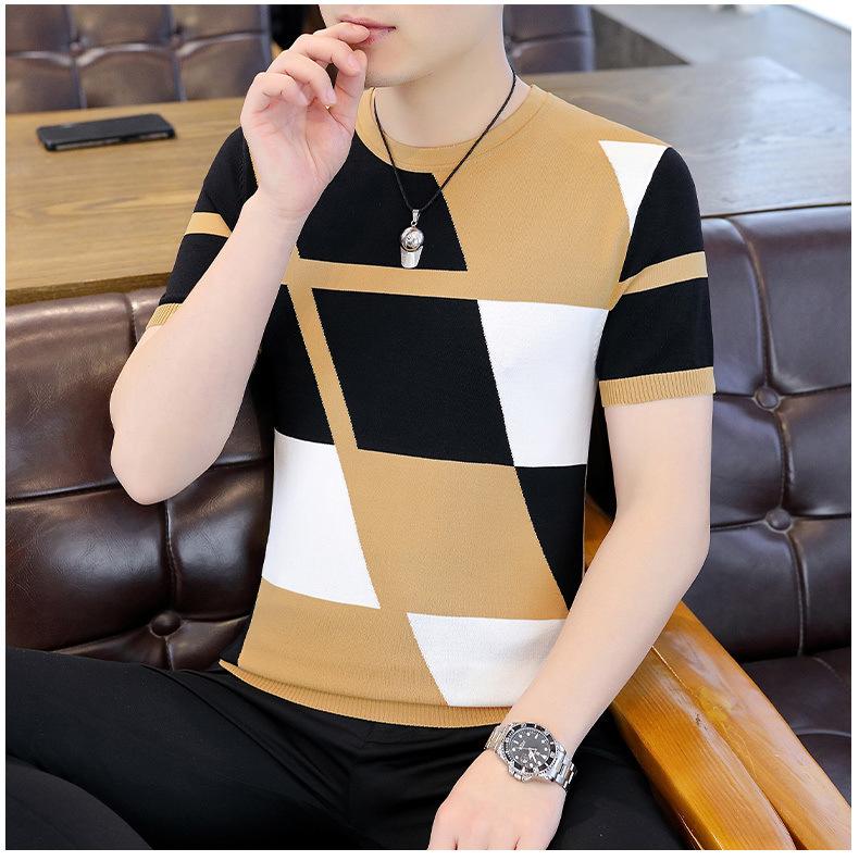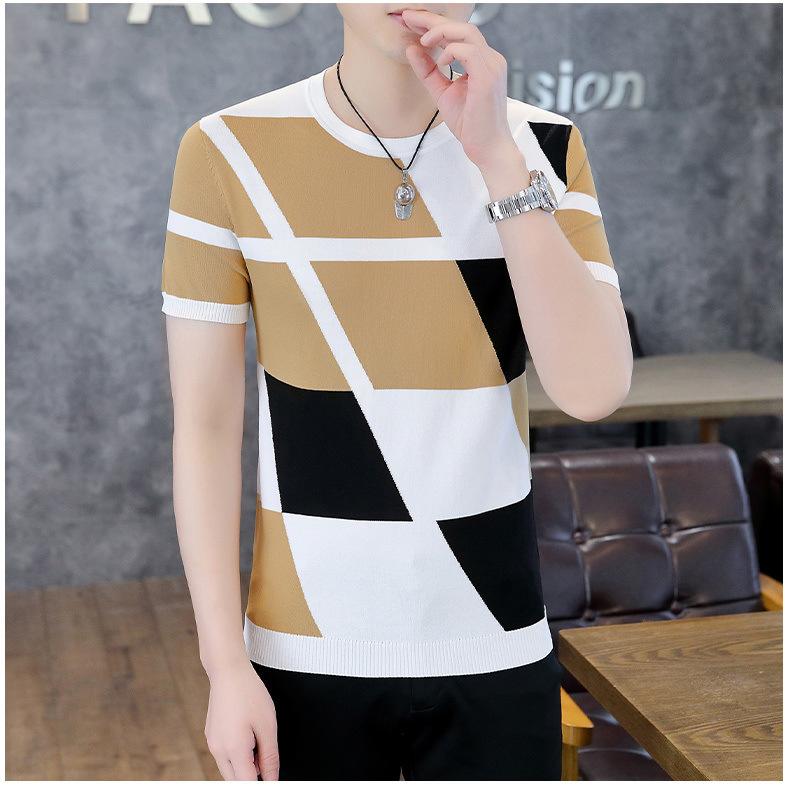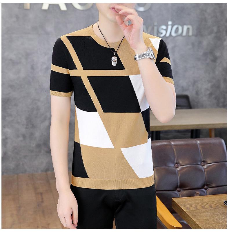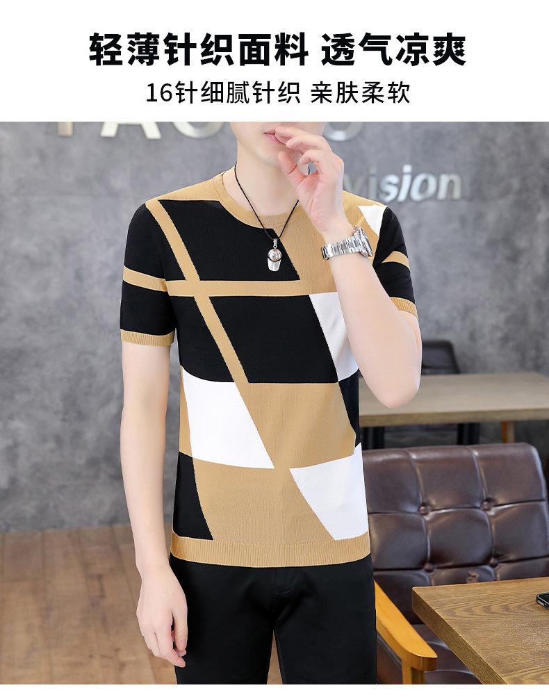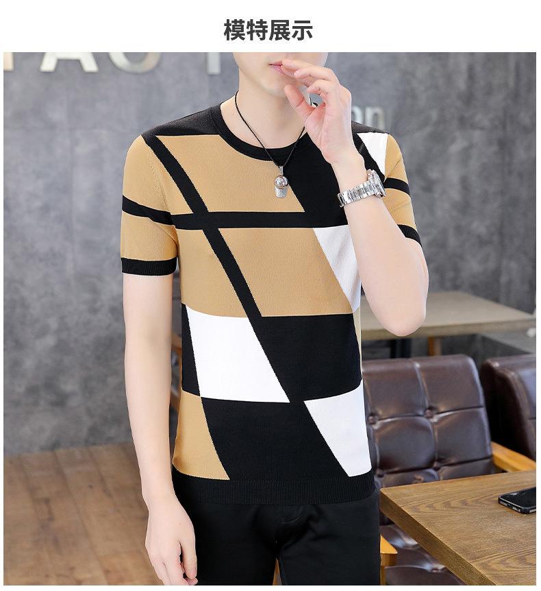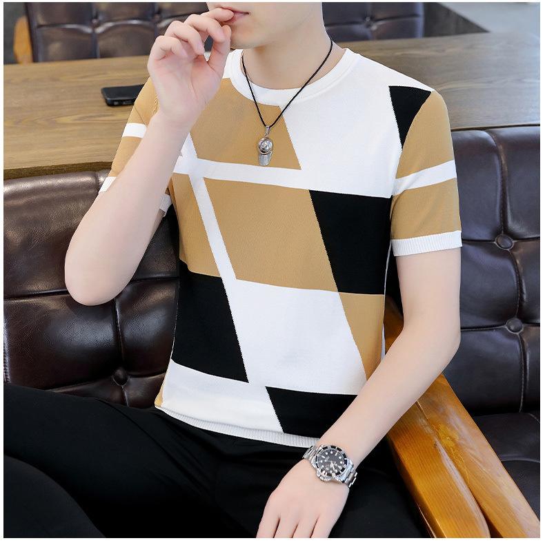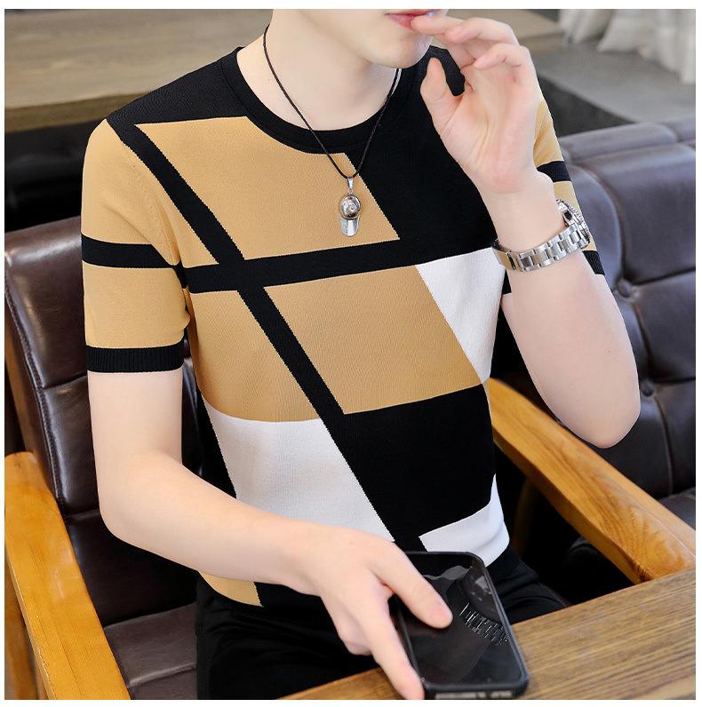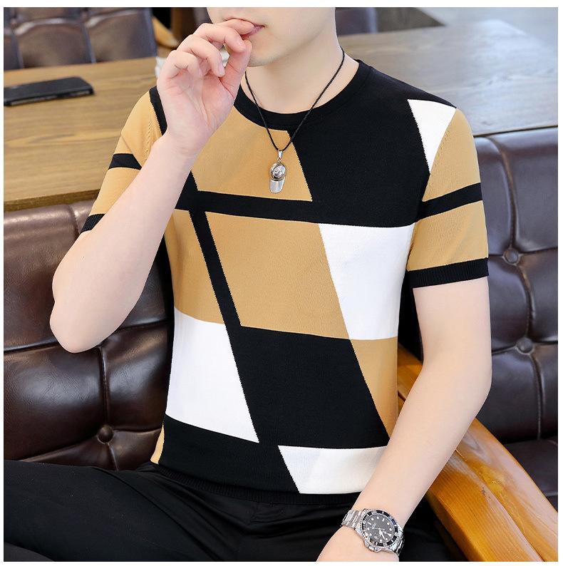 Camiseta de manga corta a rayas de seda helada para hombre, estilo europeo, de verano, fina y moderna.