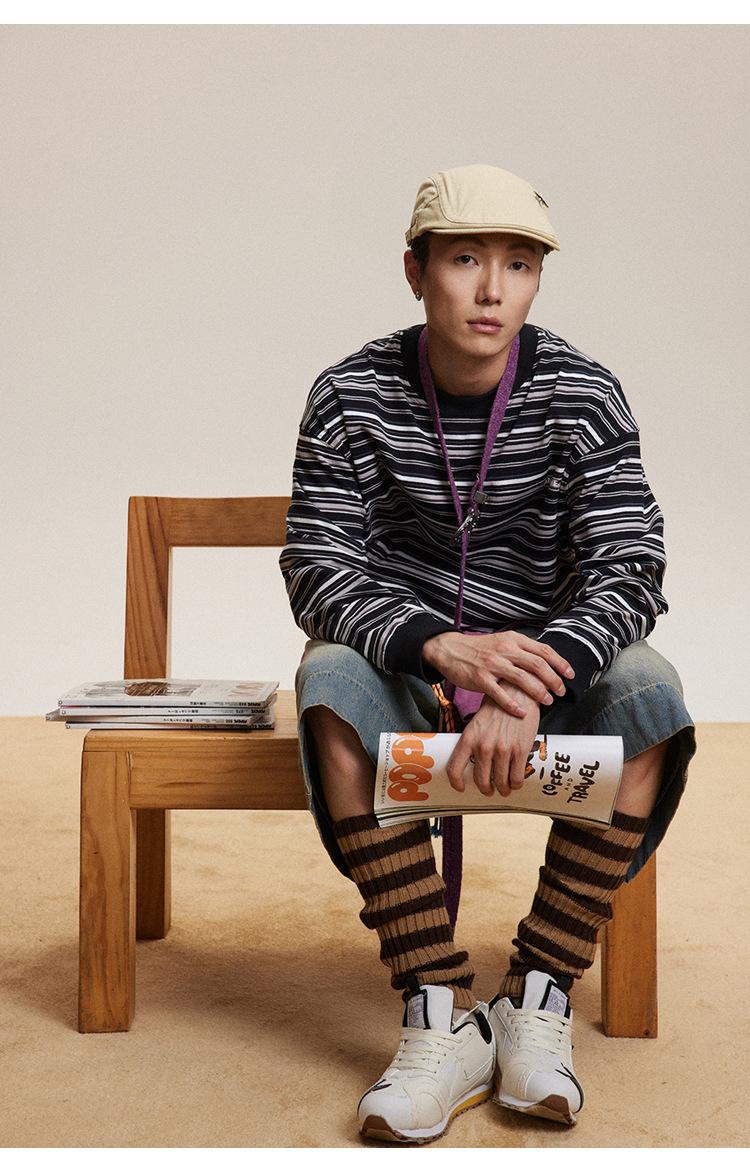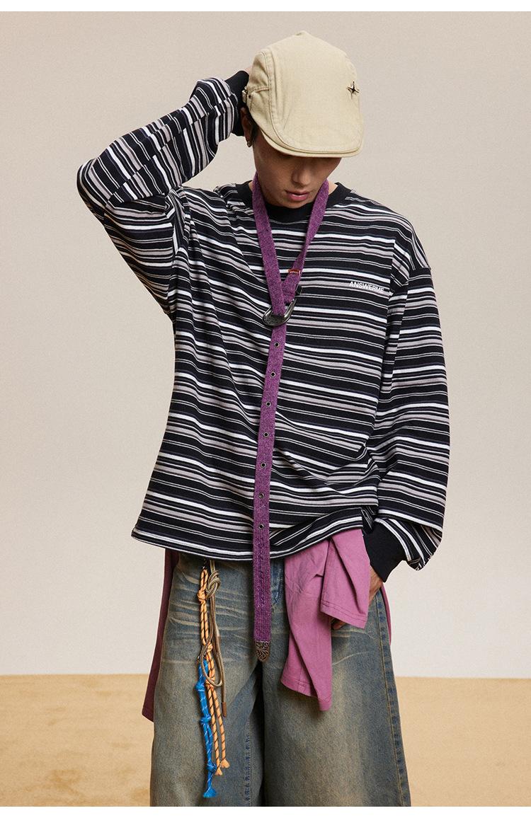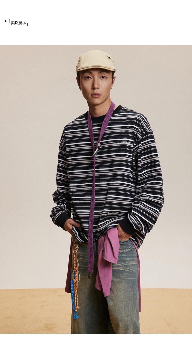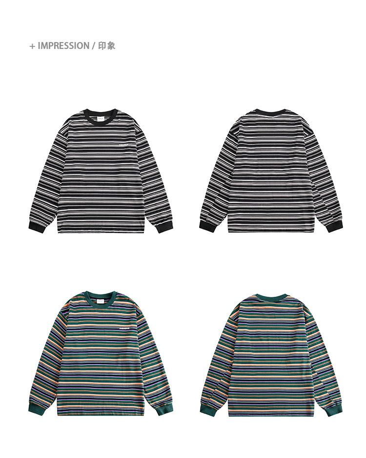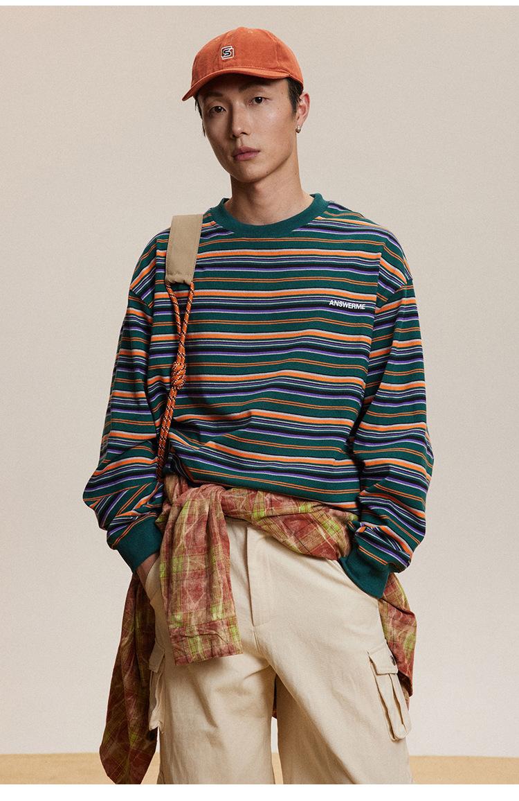 Camiseta de Manga Larga a Rayas Tendencia Urbana Americana Pareja Suéter Holgado Casual Cuello Redondo Pulóver Nacional de Moda
