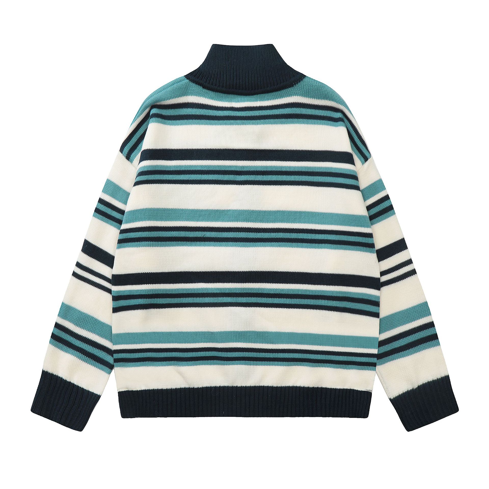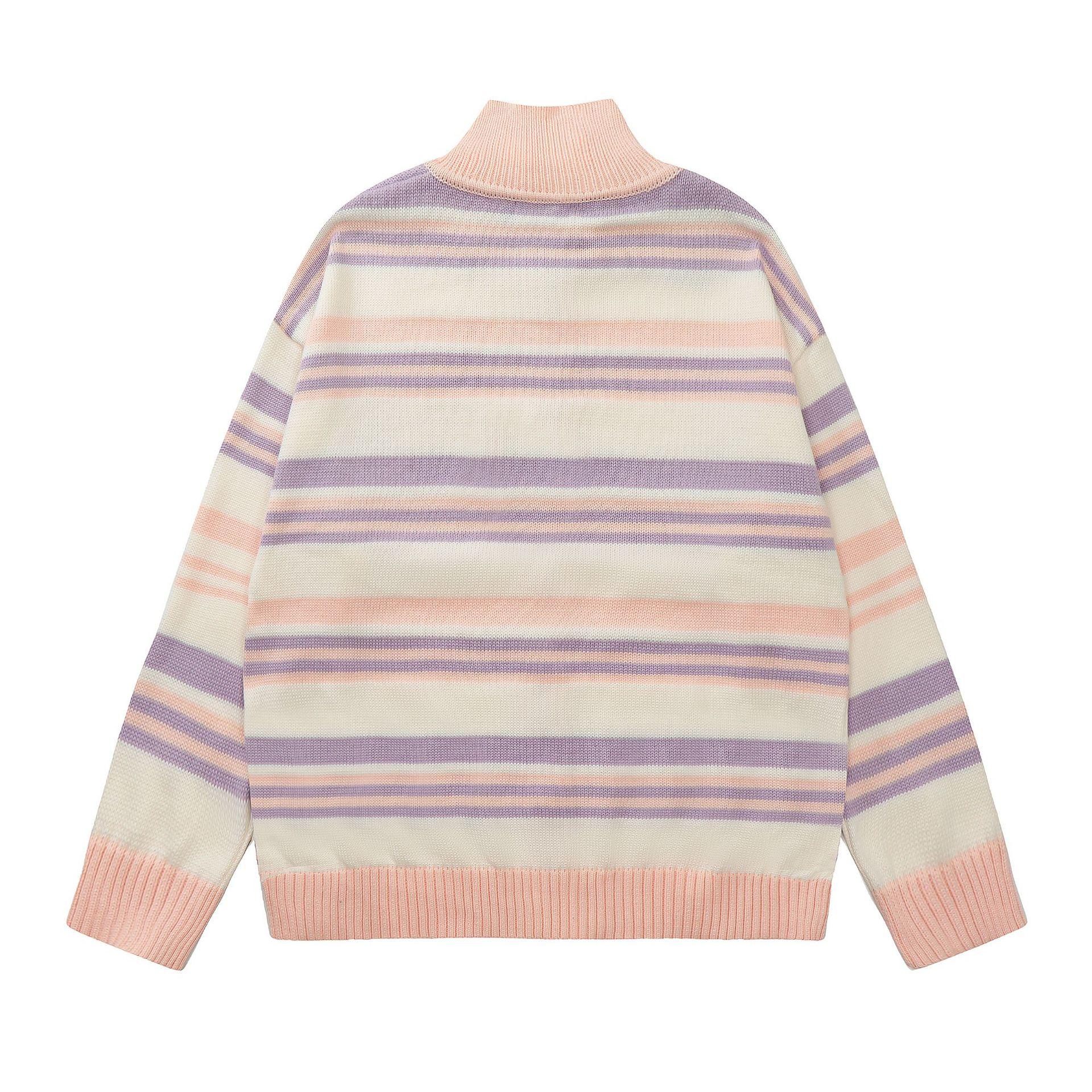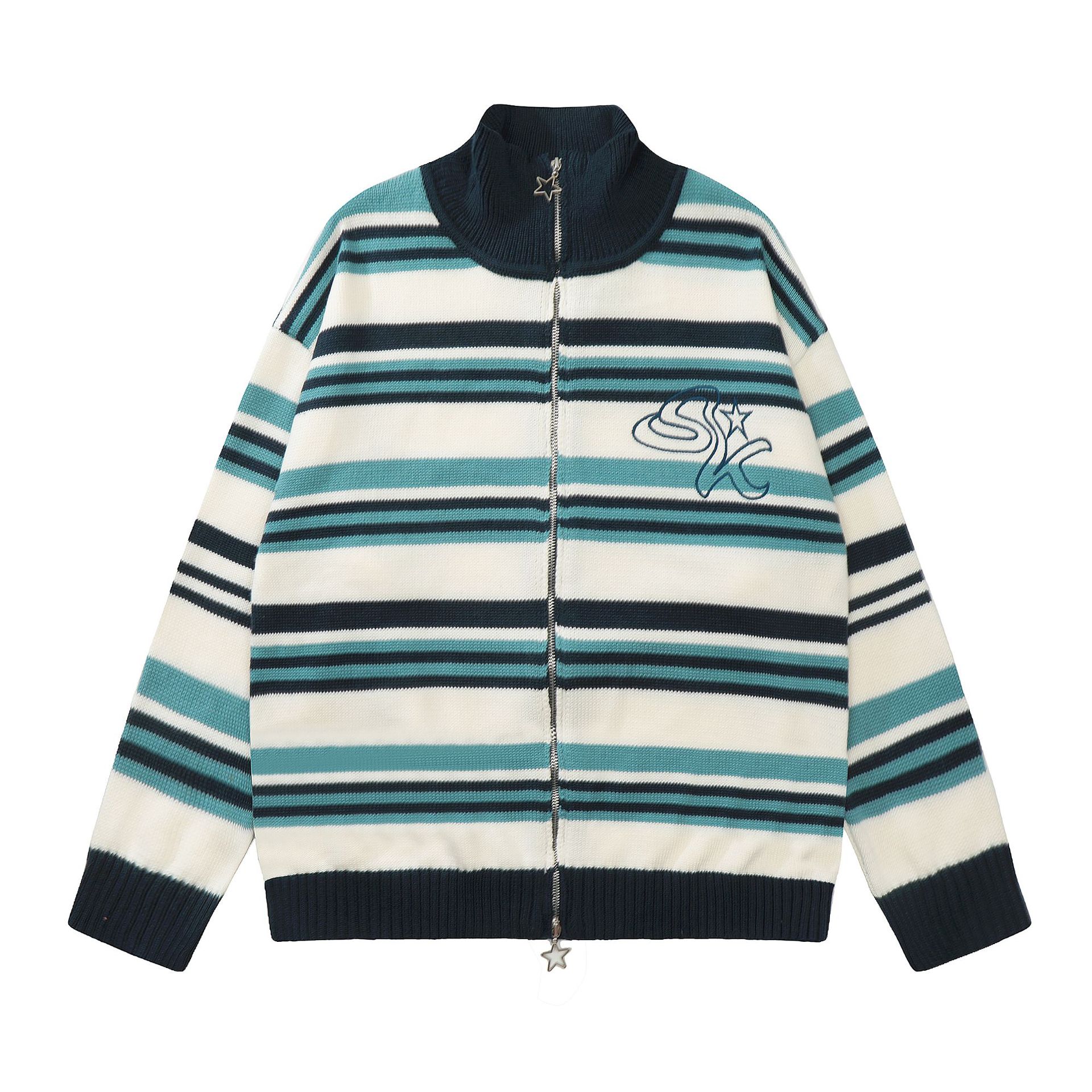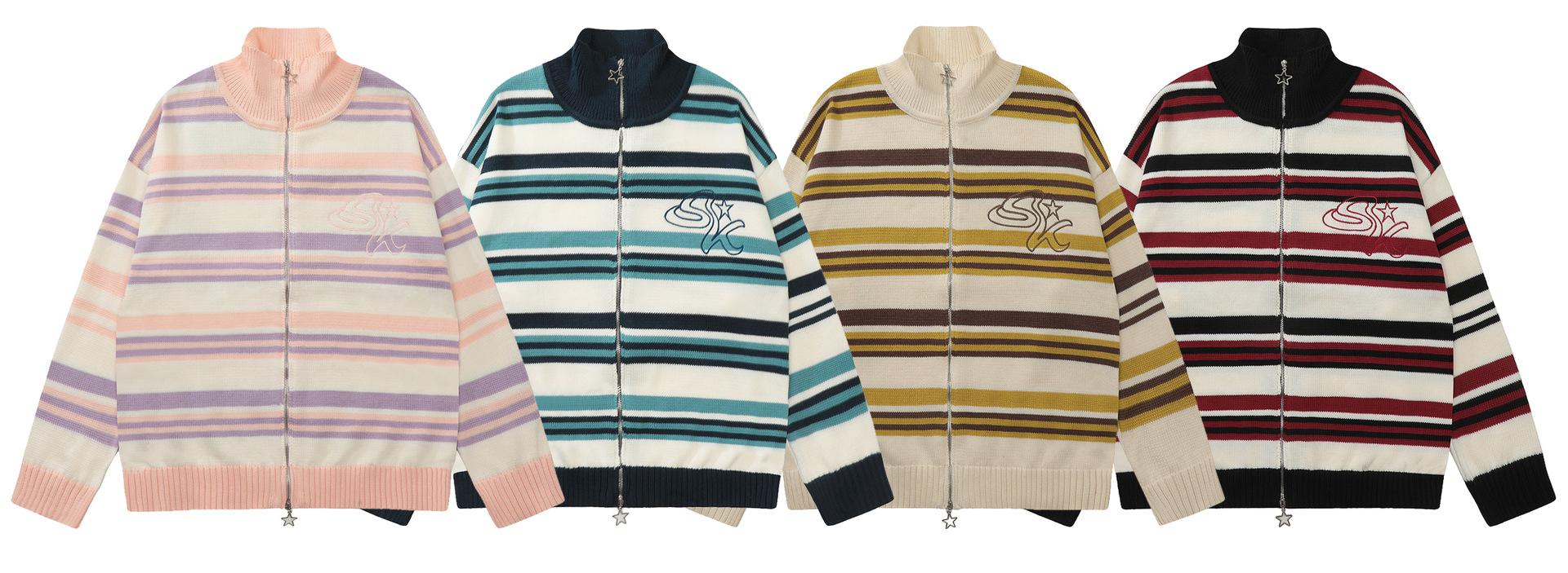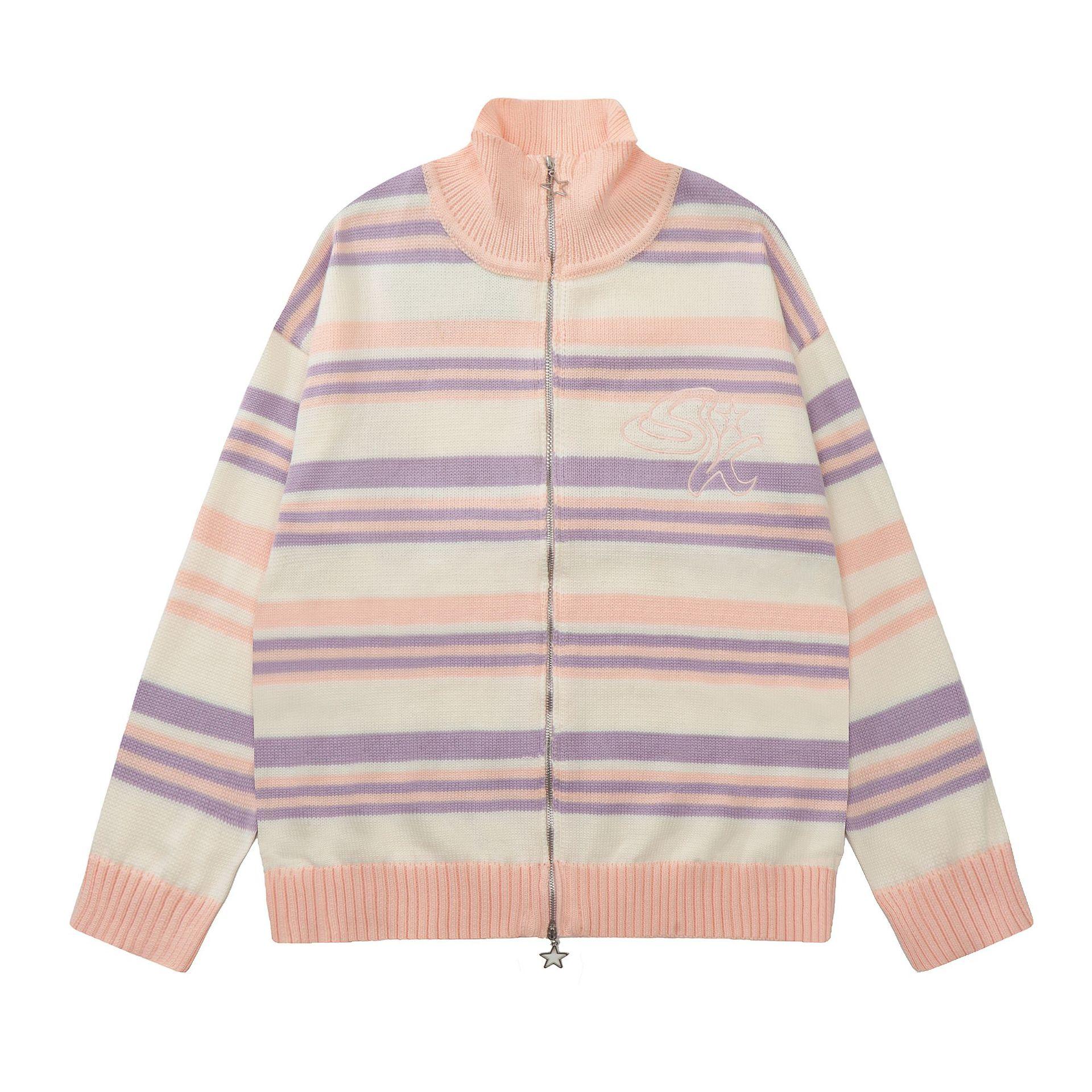 Suéter a rayas con costuras de colores contrastantes para hombre y mujer, chaqueta de otoño e invierno estilo retro americano holgado con cremallera y cuello vertical