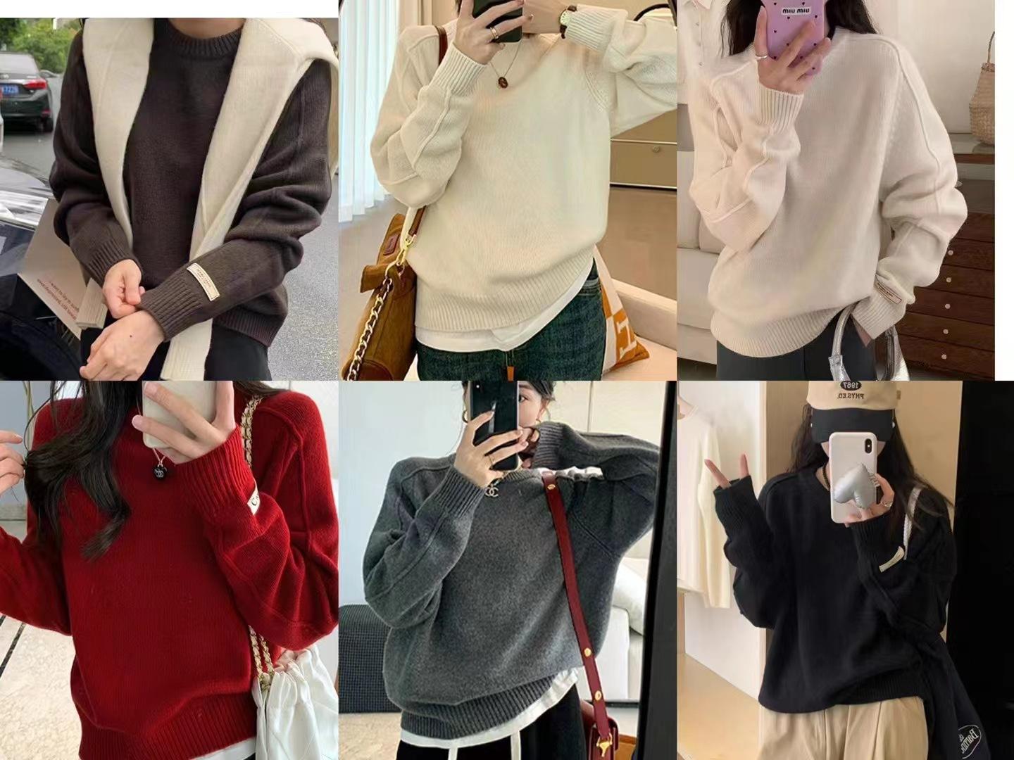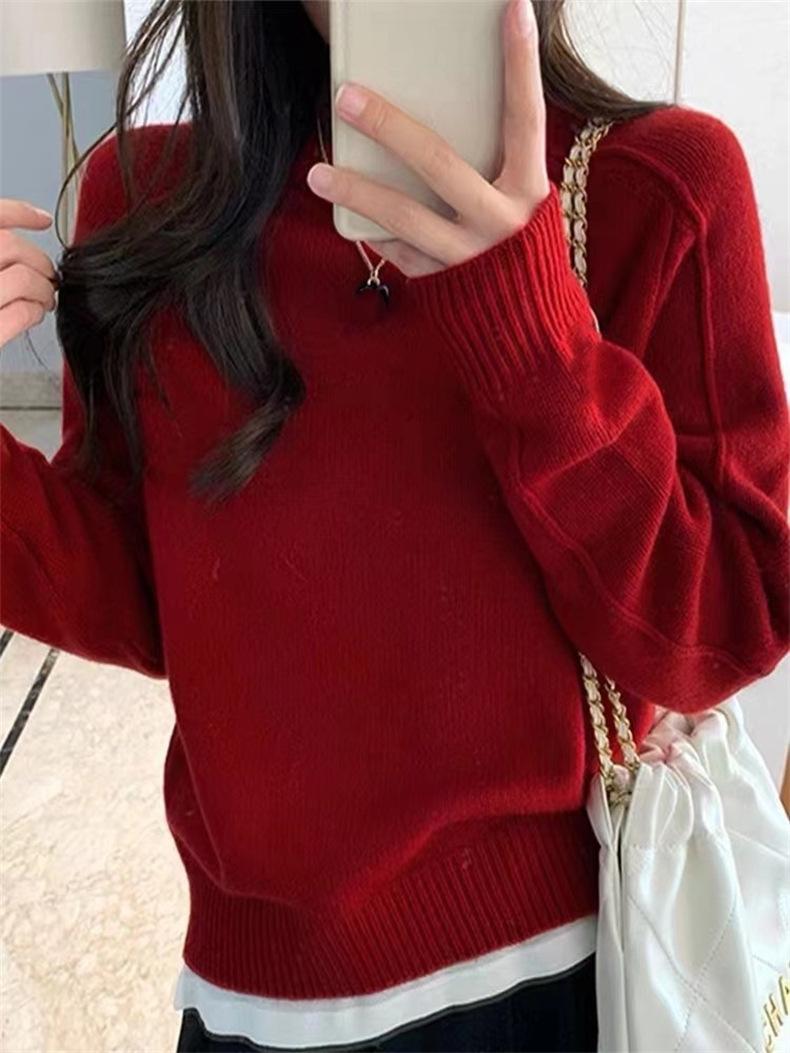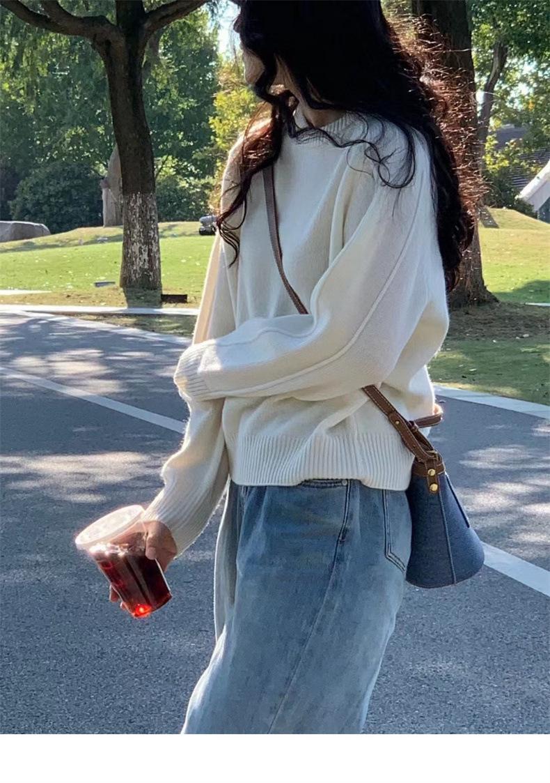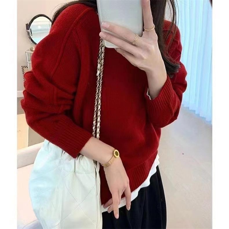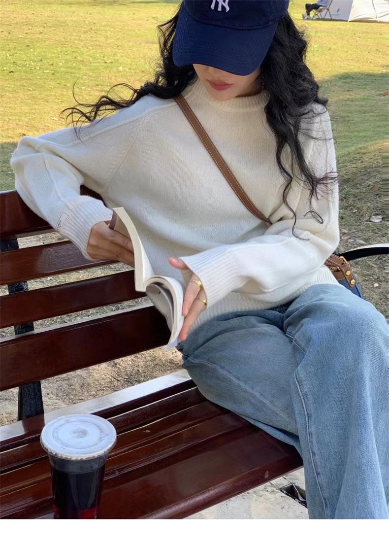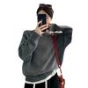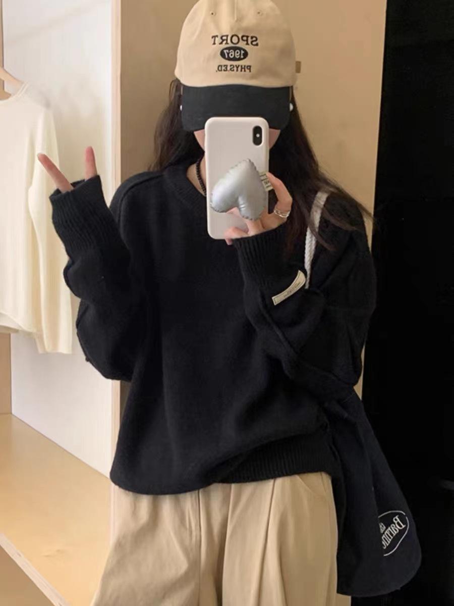 Otoño e Invierno Nuevo Jersey de Cuello Redondo Color Sólido Tejido Camiseta Base para Mujer, Estilo Holgazán Suéter Holgado Adelgazante Top de Mujer