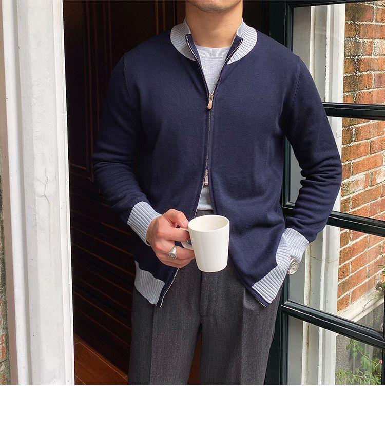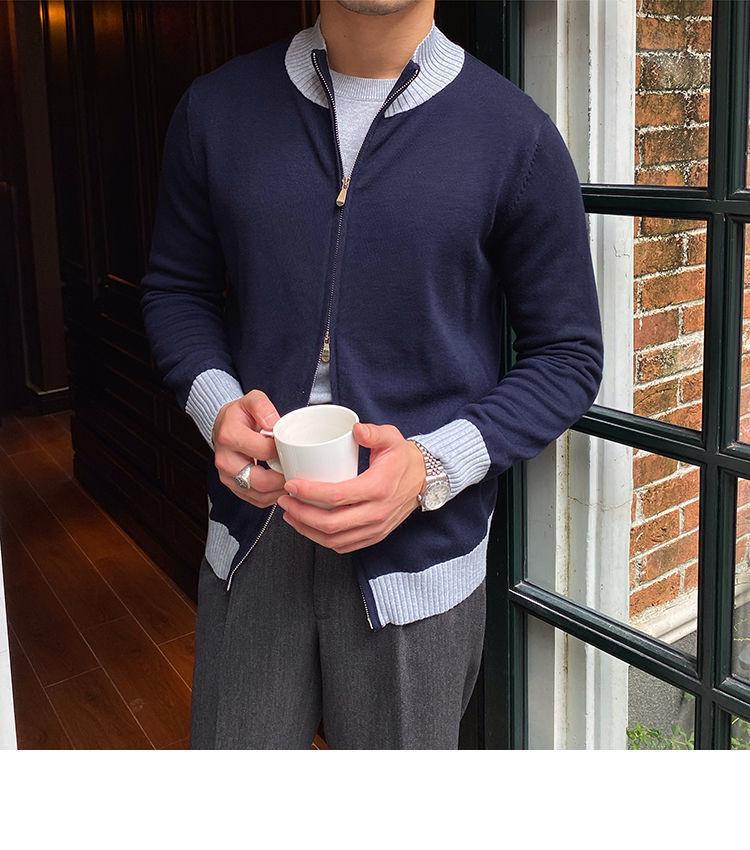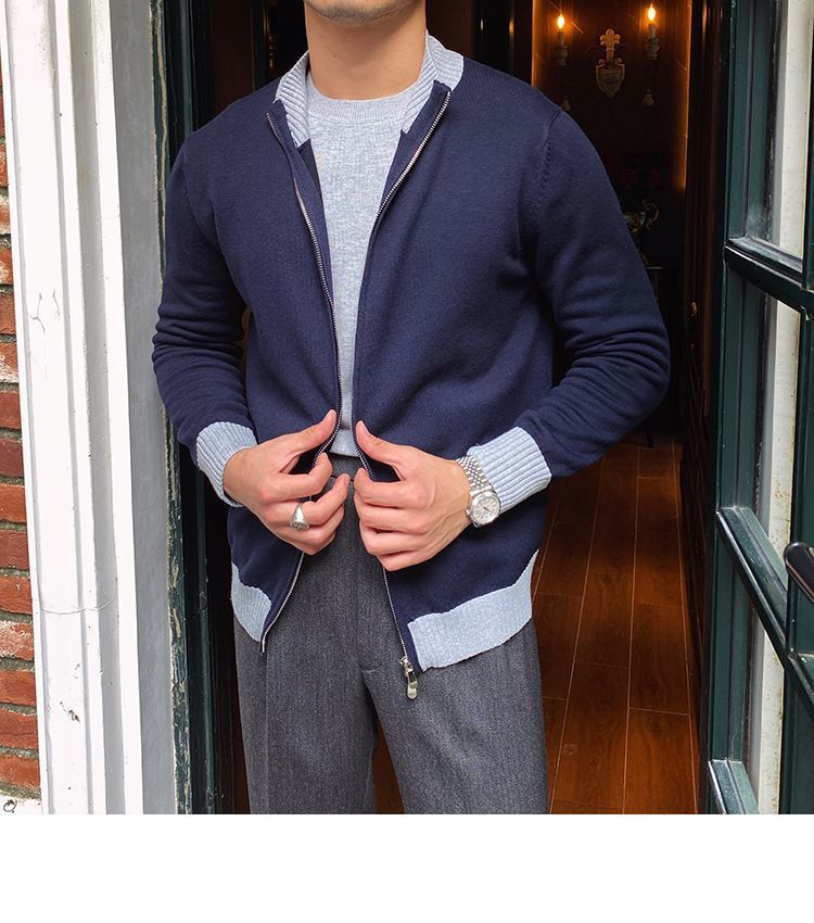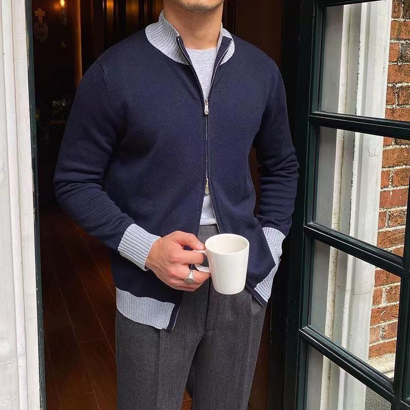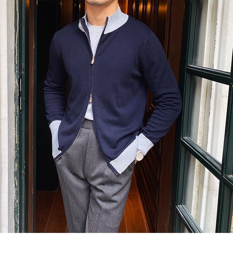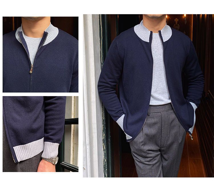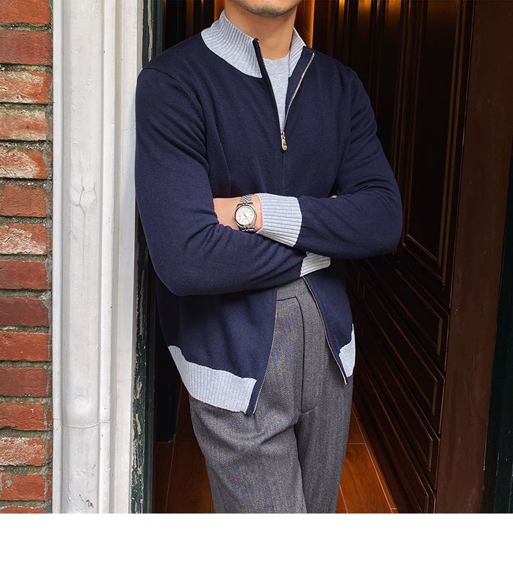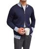 Suéter cárdigan de punto para hombre con doble cremallera y bloques de color, abrigo para hombre británico con cuello alto, suéter ajustado casual