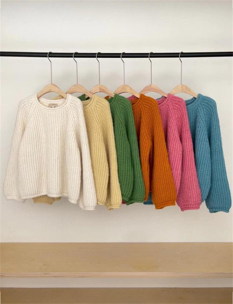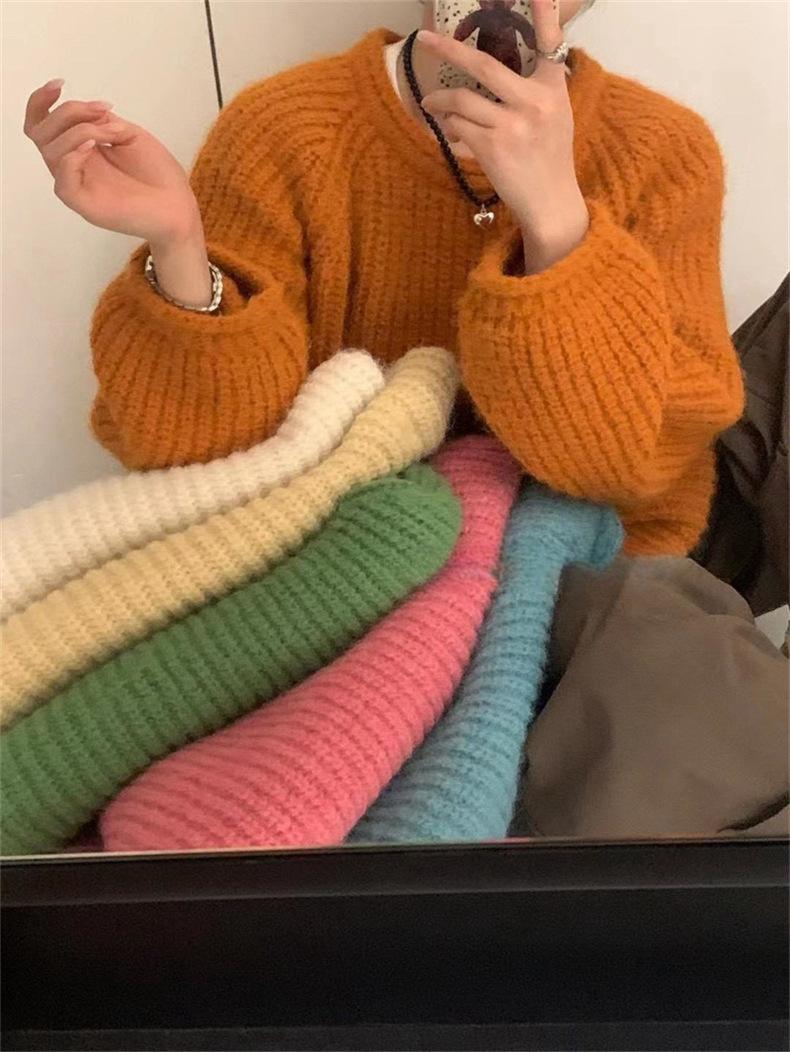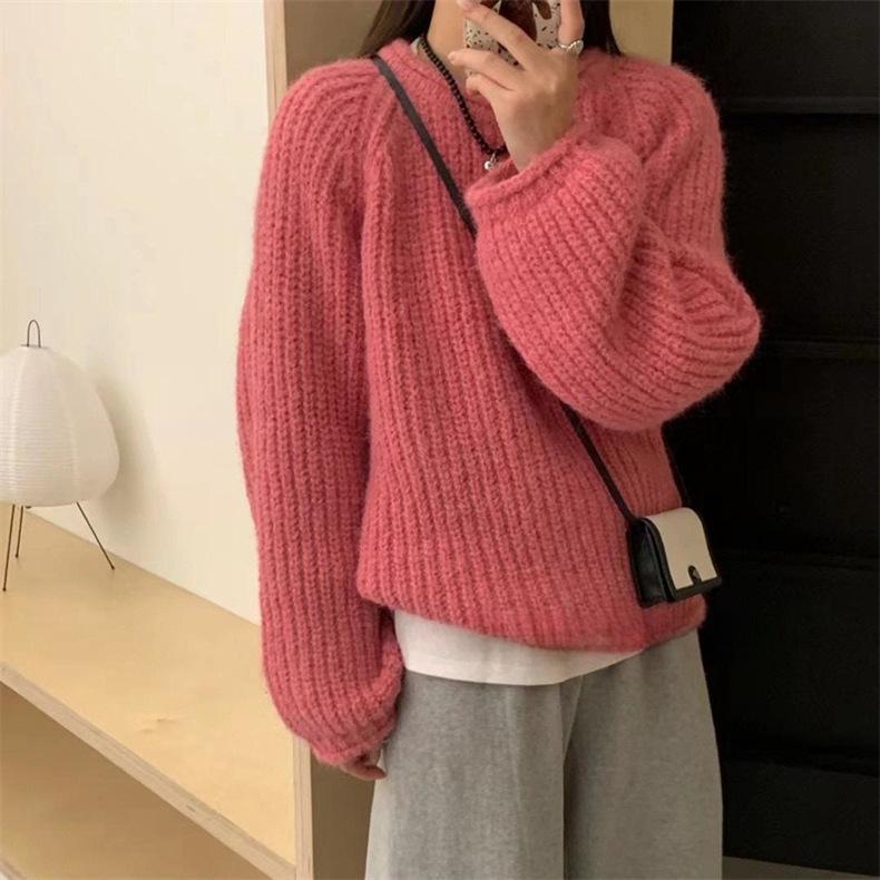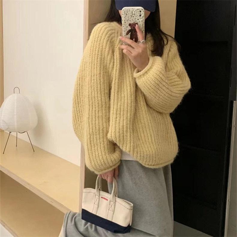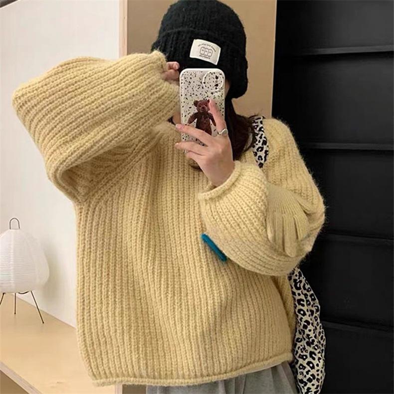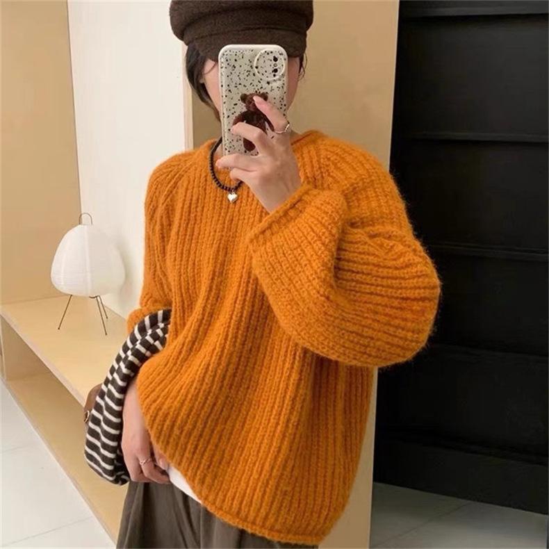 2024 Otoño e Invierno Nuevo Suéter Pulóver Japonés Retro de Línea Gruesa de Color Sólido para Mujer Estilo Lazy Color Caramelo Tejido