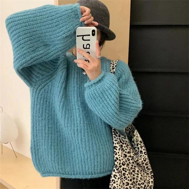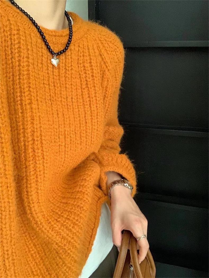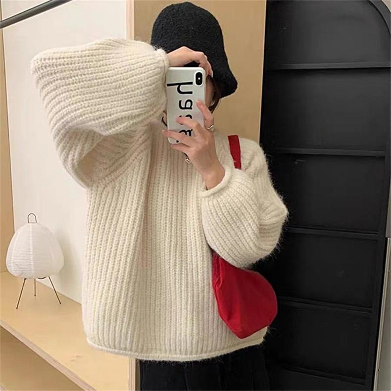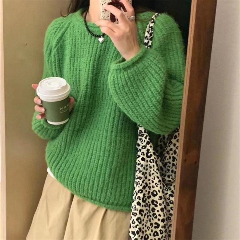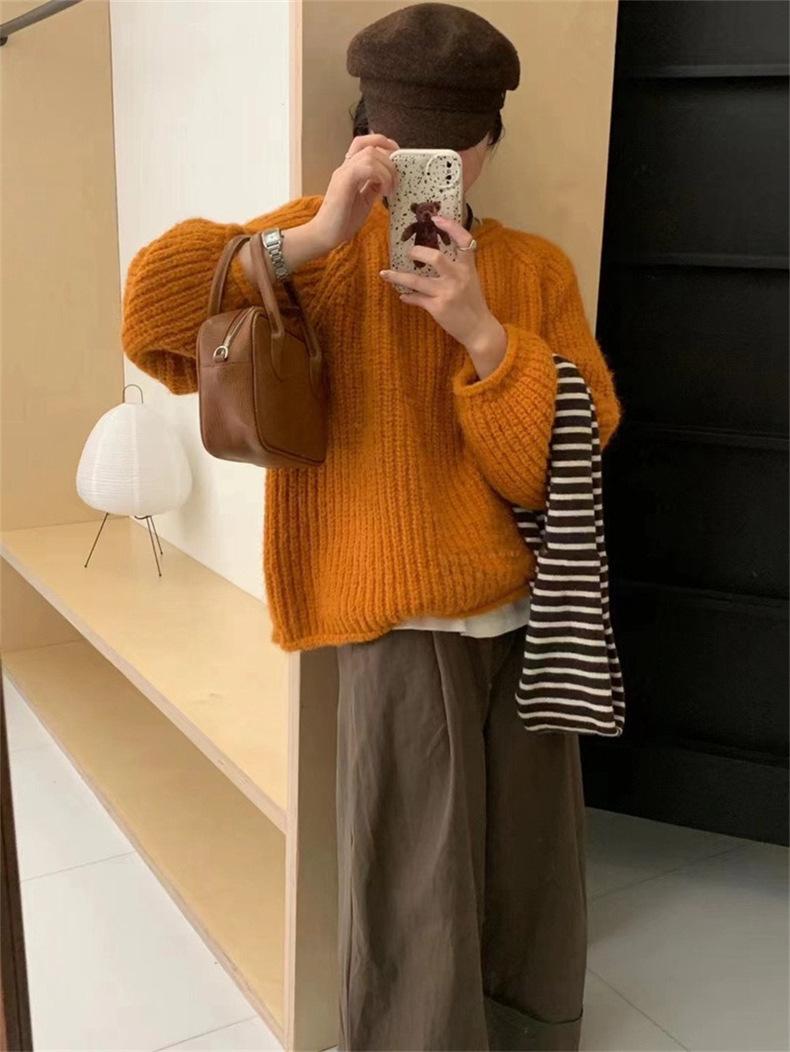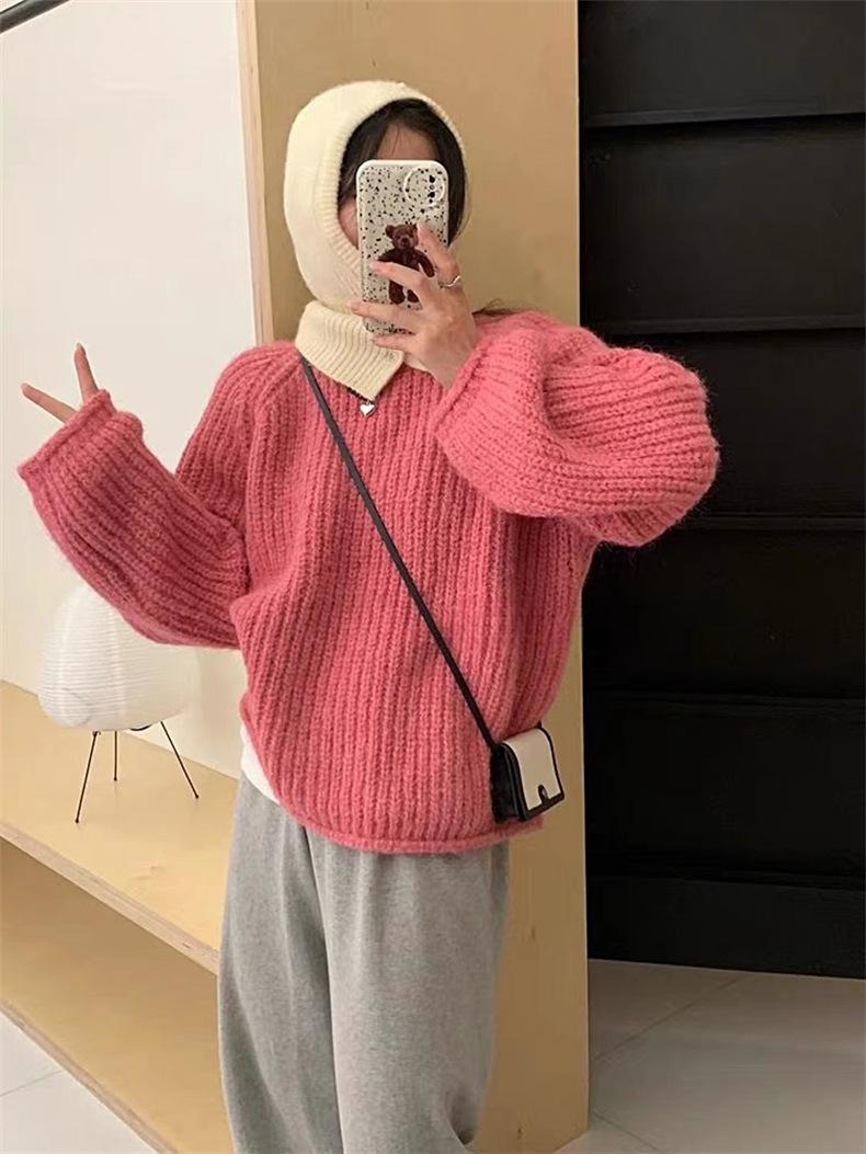 2024 Otoño e Invierno Nuevo Suéter Pulóver Japonés Retro de Línea Gruesa de Color Sólido para Mujer Estilo Lazy Color Caramelo Tejido