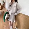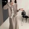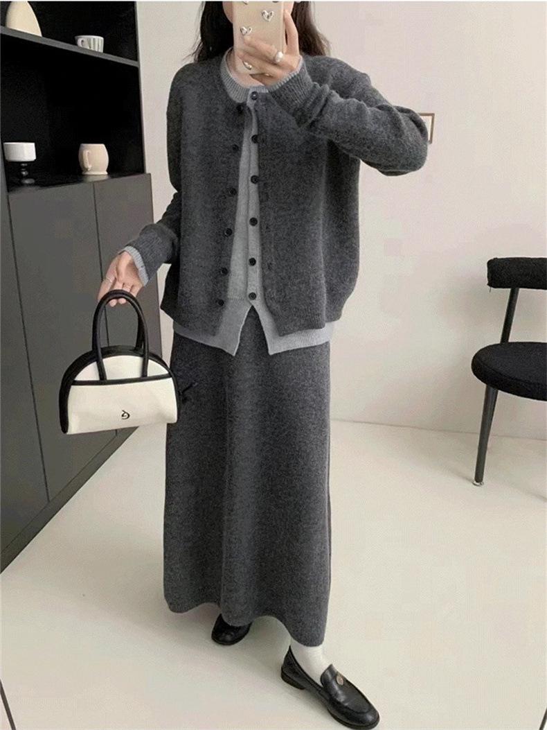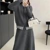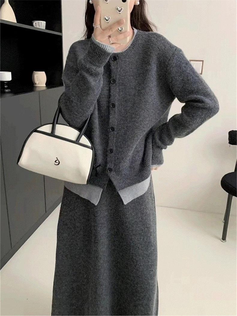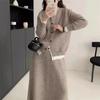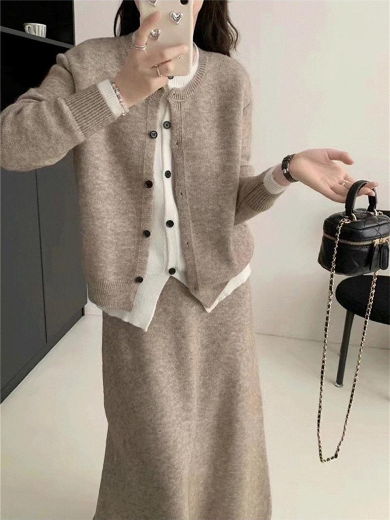 Traje de Falda Tejida de Dos Piezas Falso de Comercio Exterior para Mujer, Nuevo Cárdigan con Bloques de Color de Moda Otoño e Invierno + Conjunto de Dos Piezas de Falda