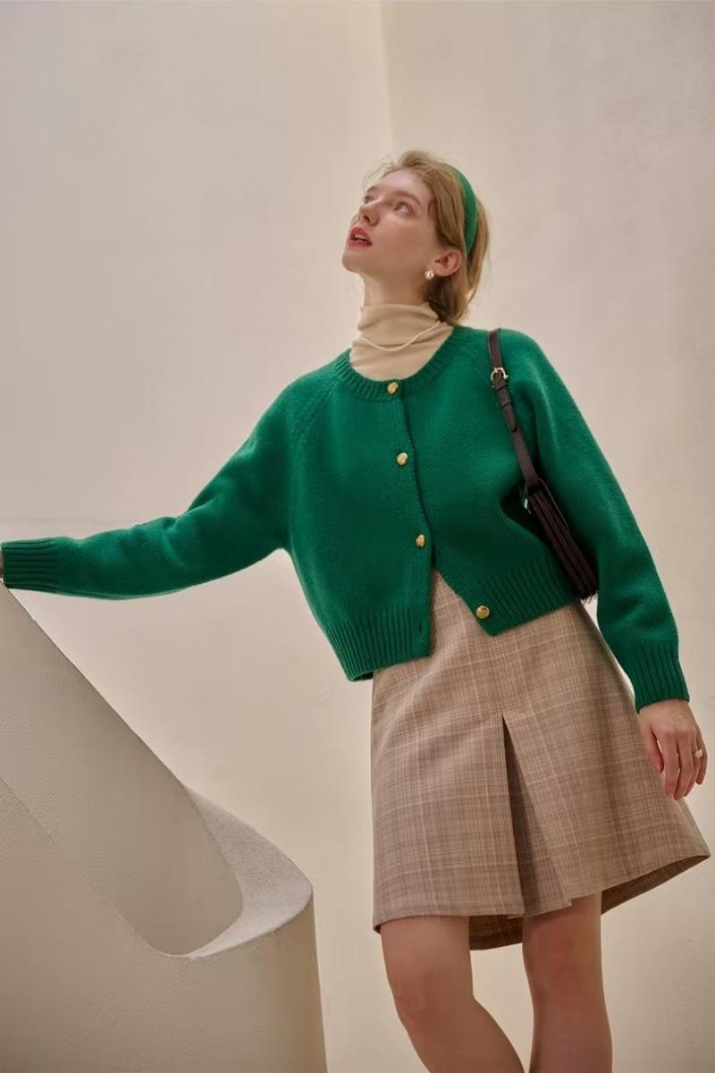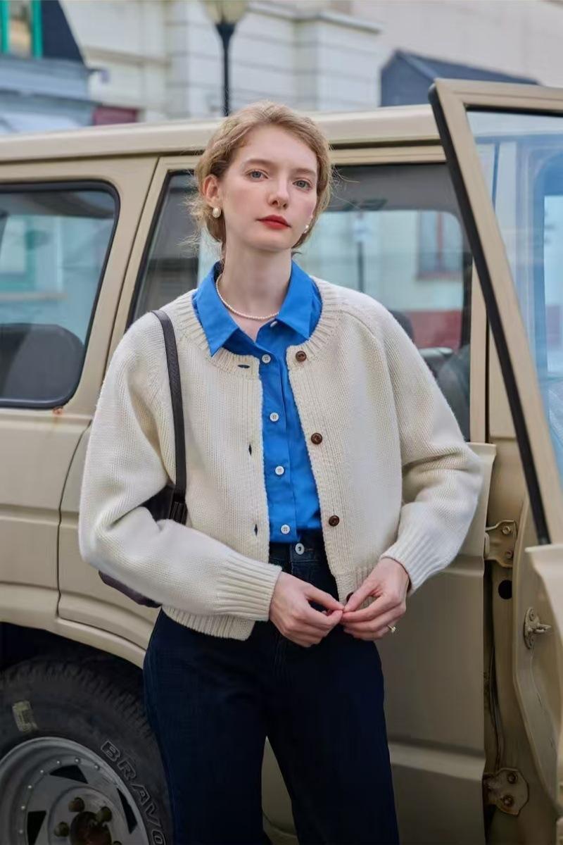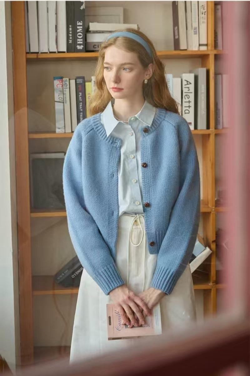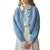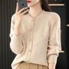 Cárdigan de punto de lana 100% con cuello redondo sencillo para mujer, otoño e invierno 2024, corto, holgado, vintage, con botones de metal