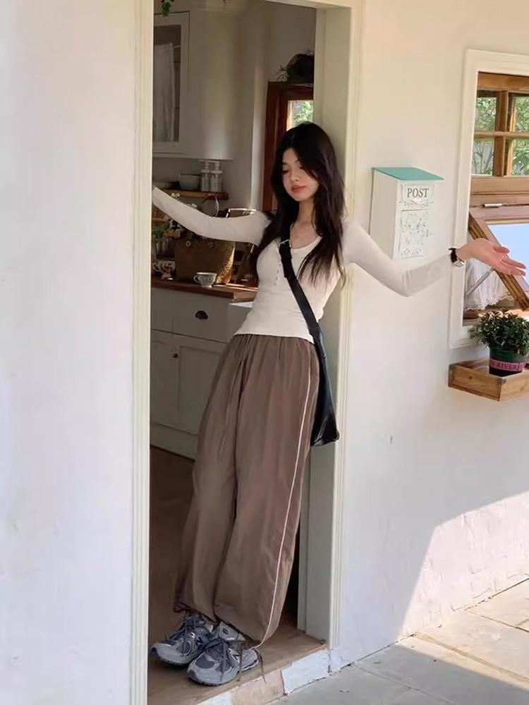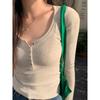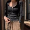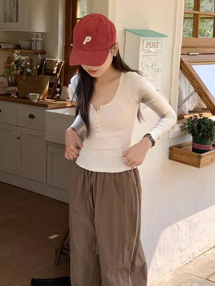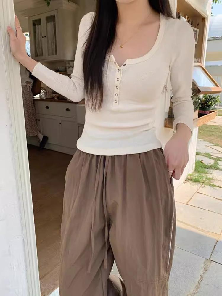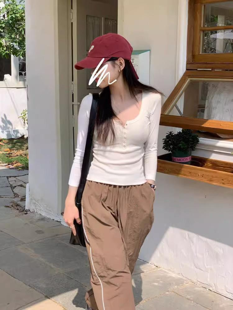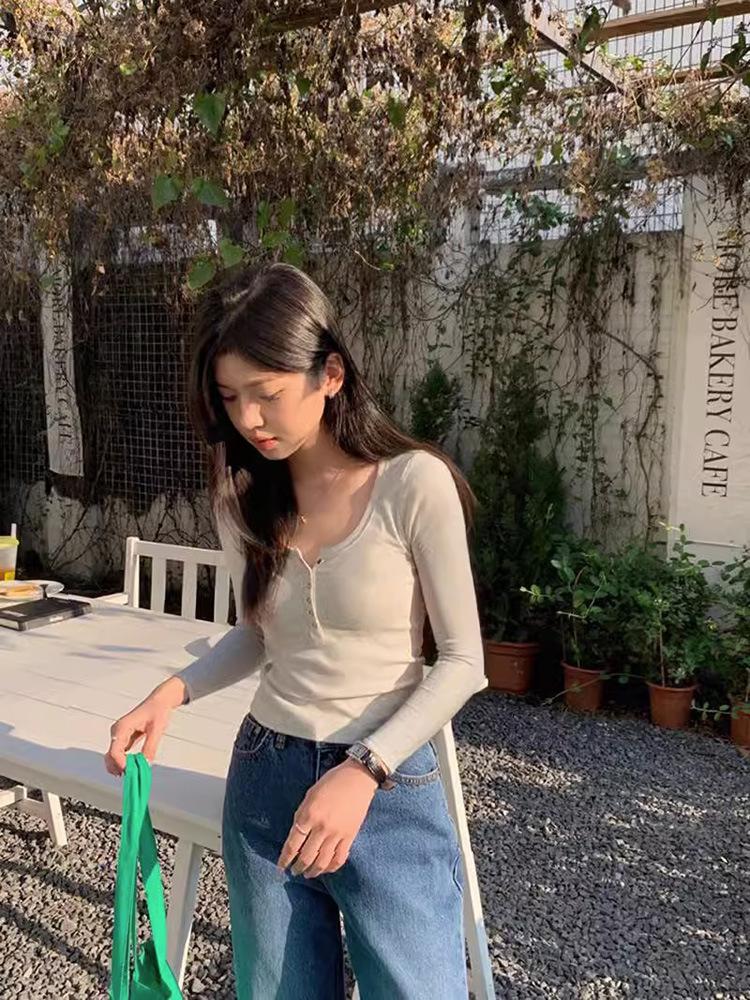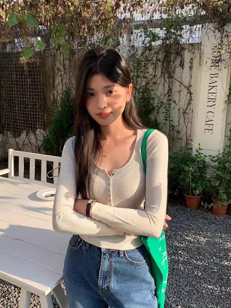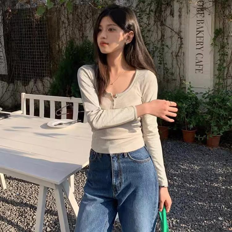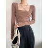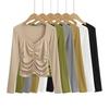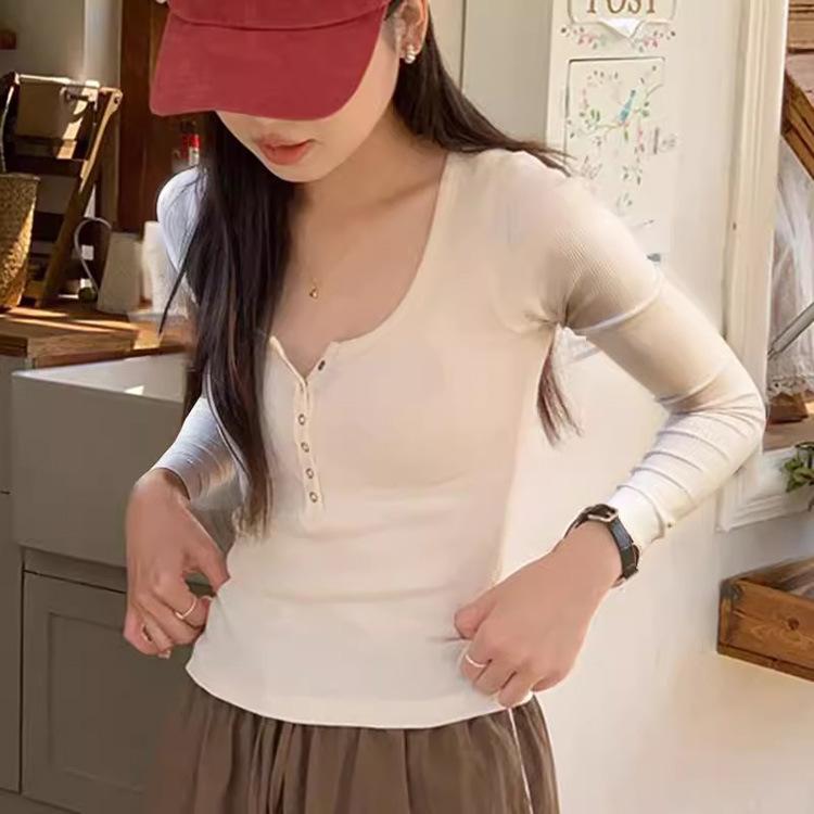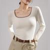 Playera de Manga Larga de Algodón Puro con Cuello Cuadrado para Mujer 2024 Primavera y Otoño Nuevo Look Adelgazante Color Puro Simple Básica Top