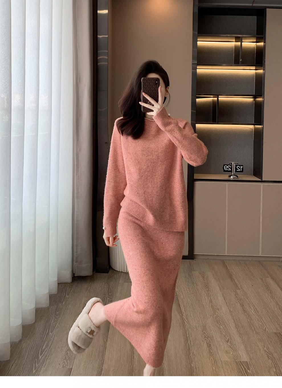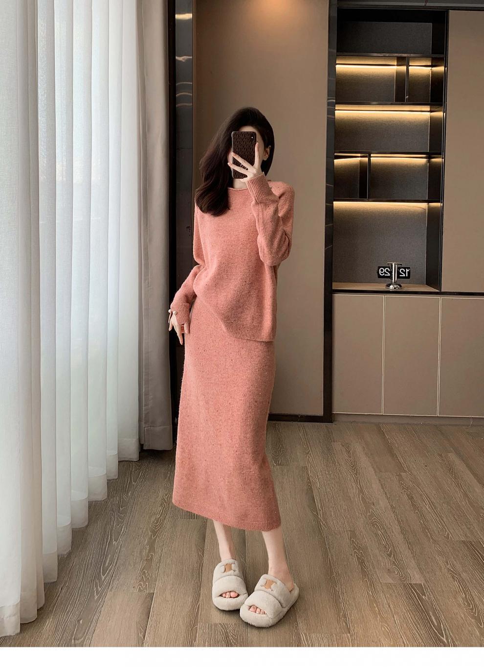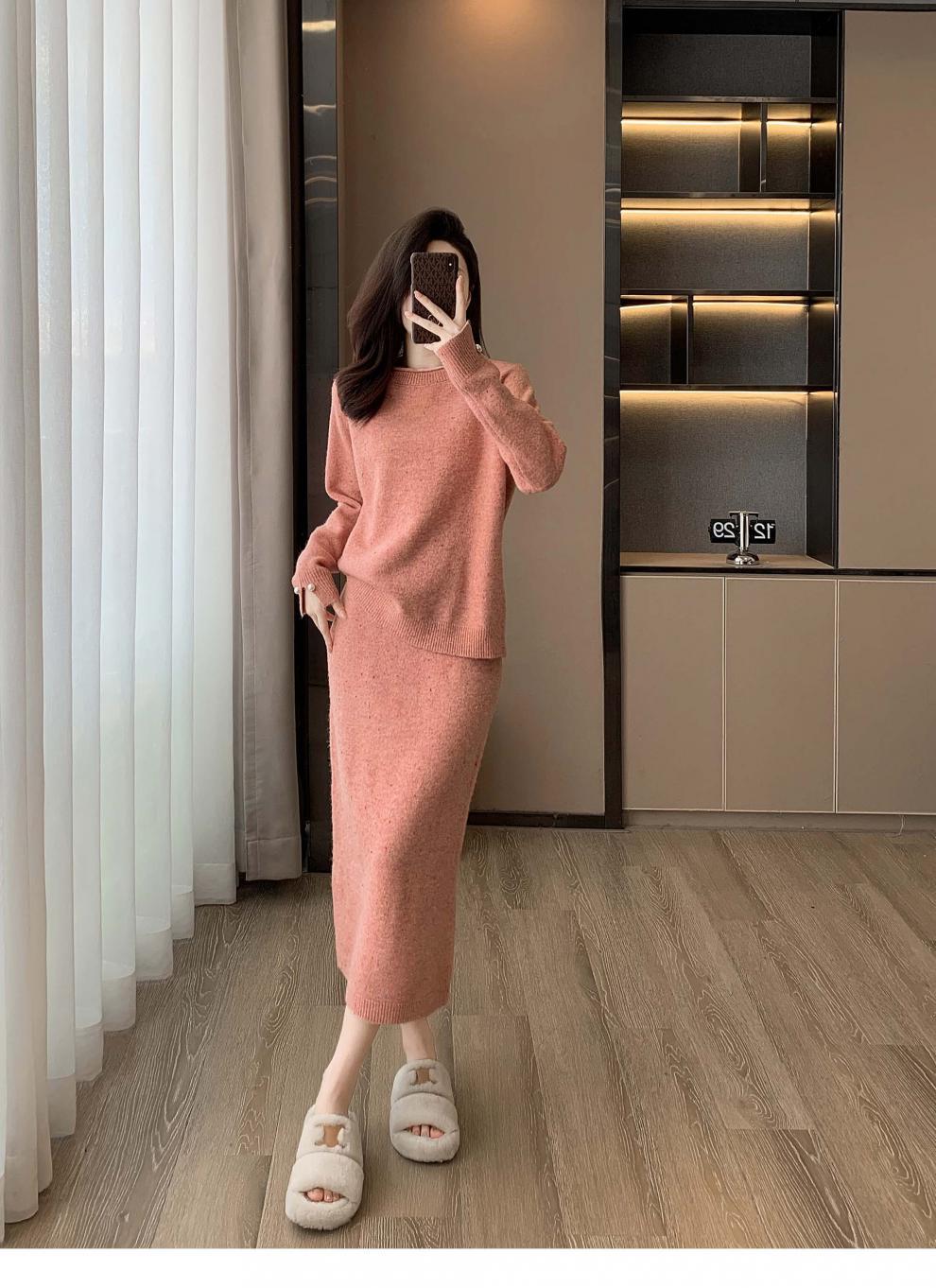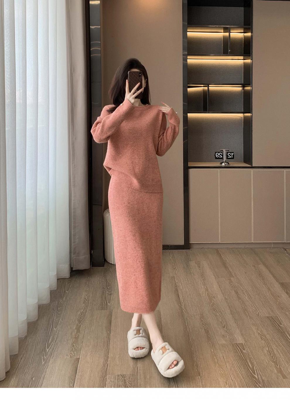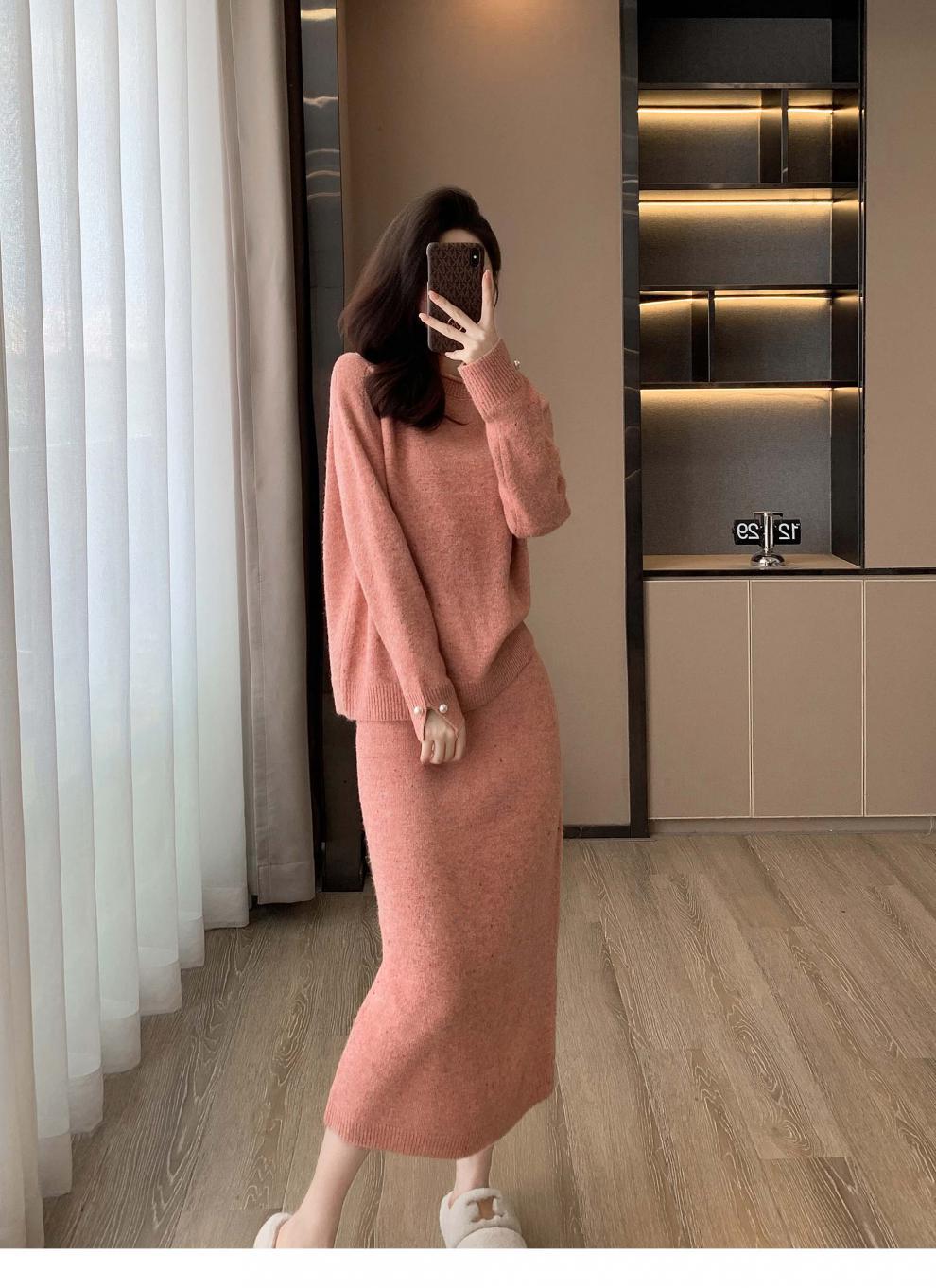 Falda de Punto Estilo Perezoso Estilo Francés para Mujer Otoño e Invierno Nuevo Estilo Top y Falda Rosa Suave Falda de Dos Piezas