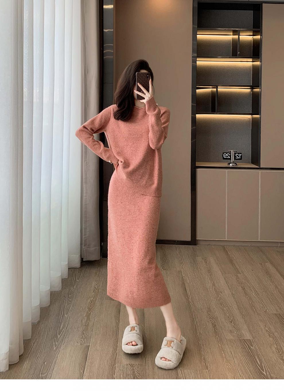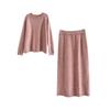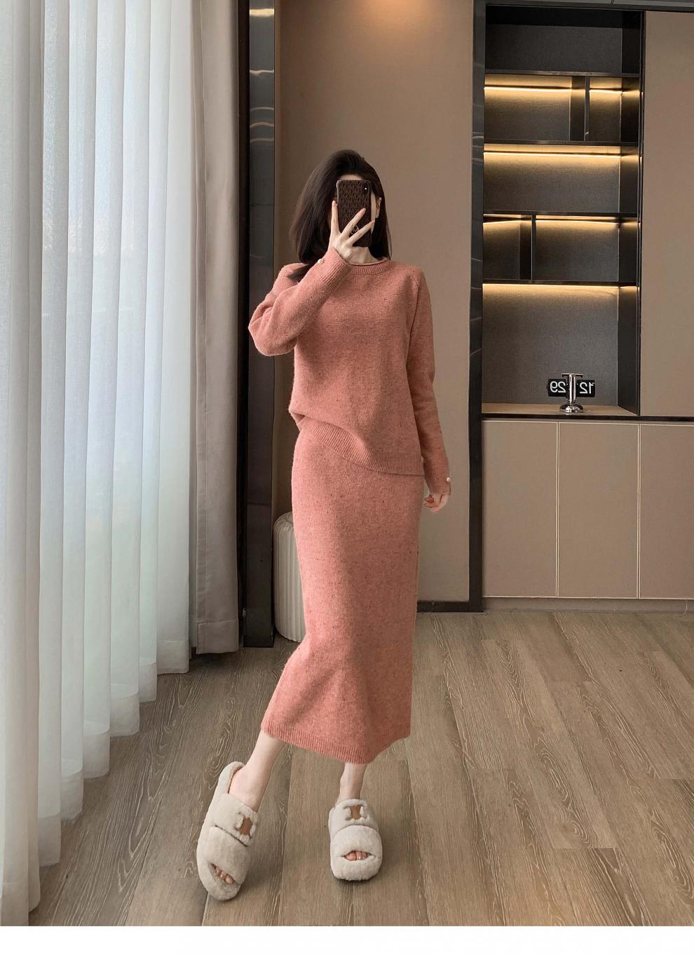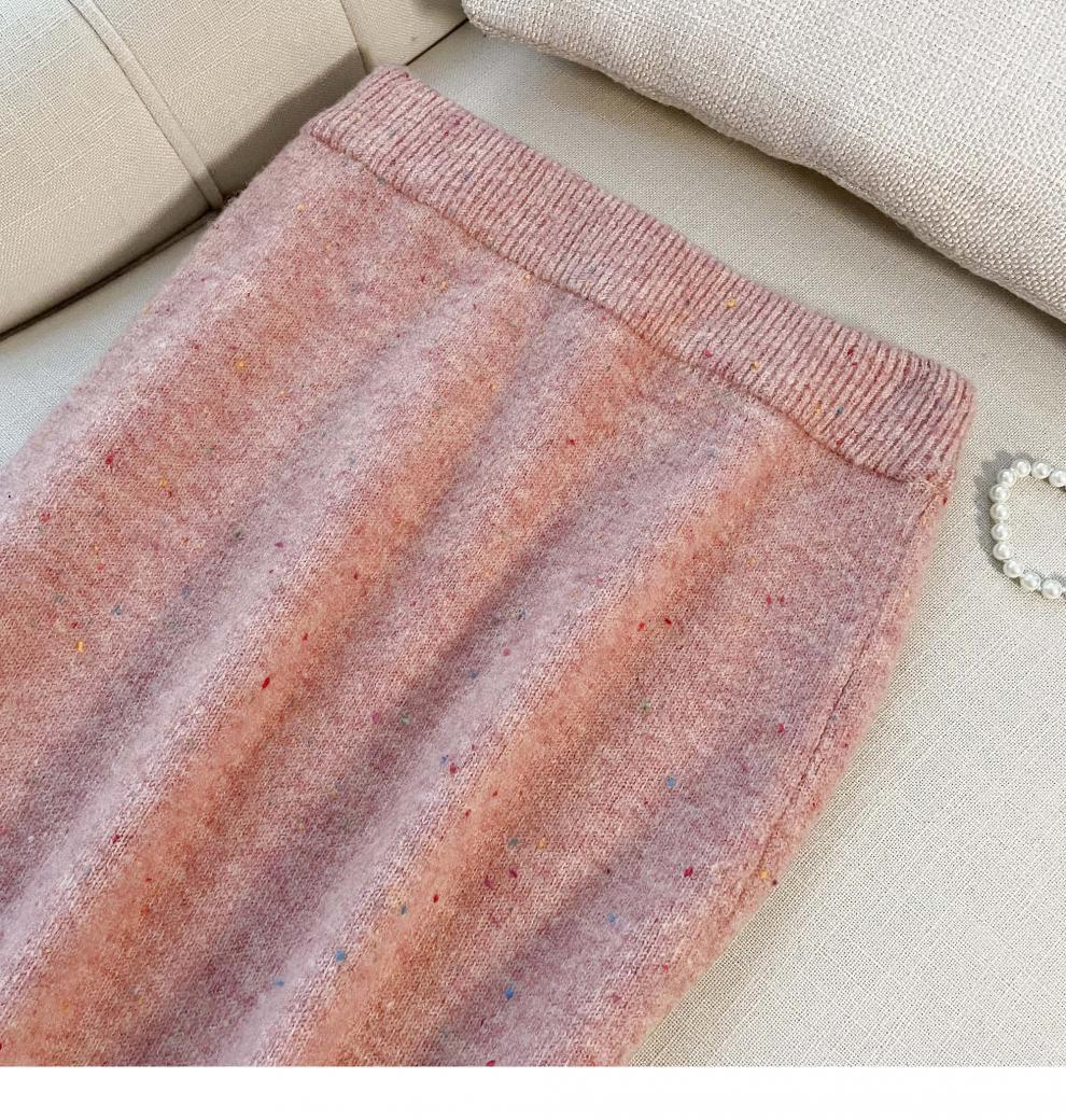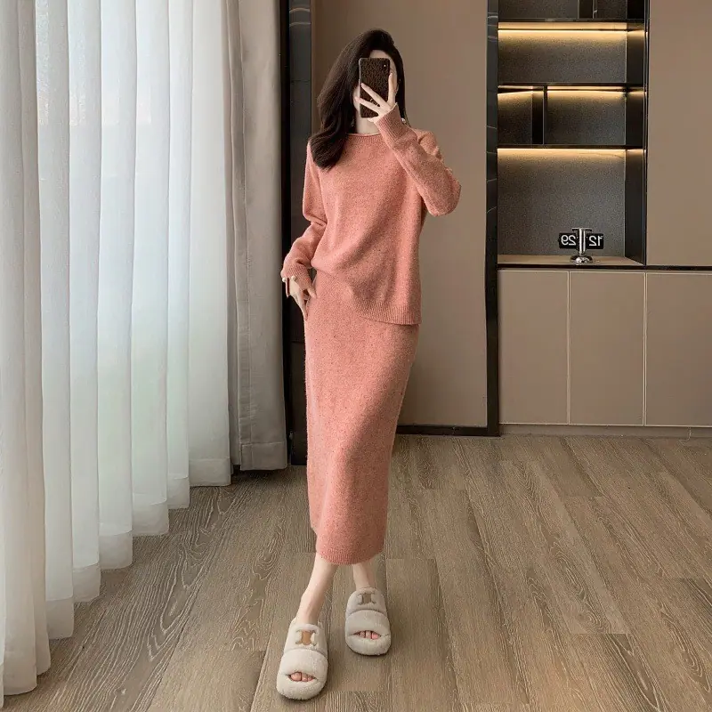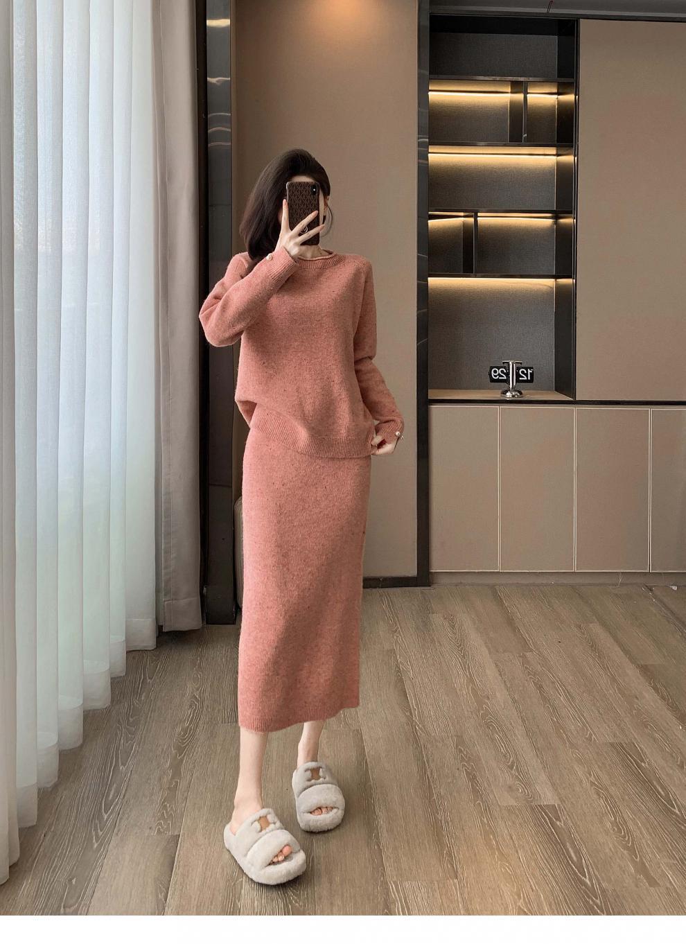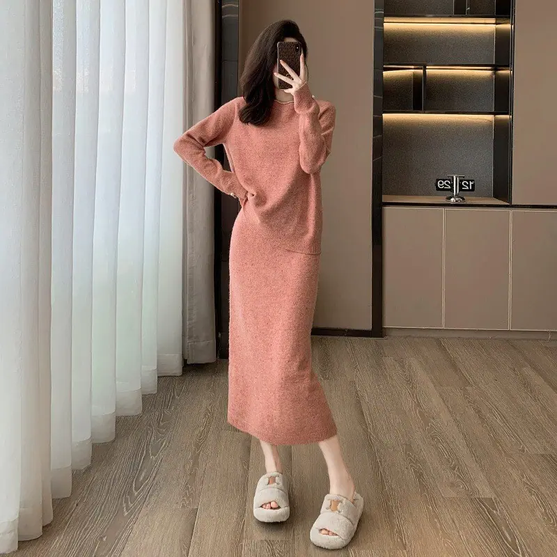 Falda de Punto Estilo Perezoso Estilo Francés para Mujer Otoño e Invierno Nuevo Estilo Top y Falda Rosa Suave Falda de Dos Piezas