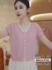 Camiseta de manga corta con hombros descubiertos y diseño de talla grande para mujer, de verano, con cuello en V, de punto de seda helada, que cubre el vientre y adelgaza.