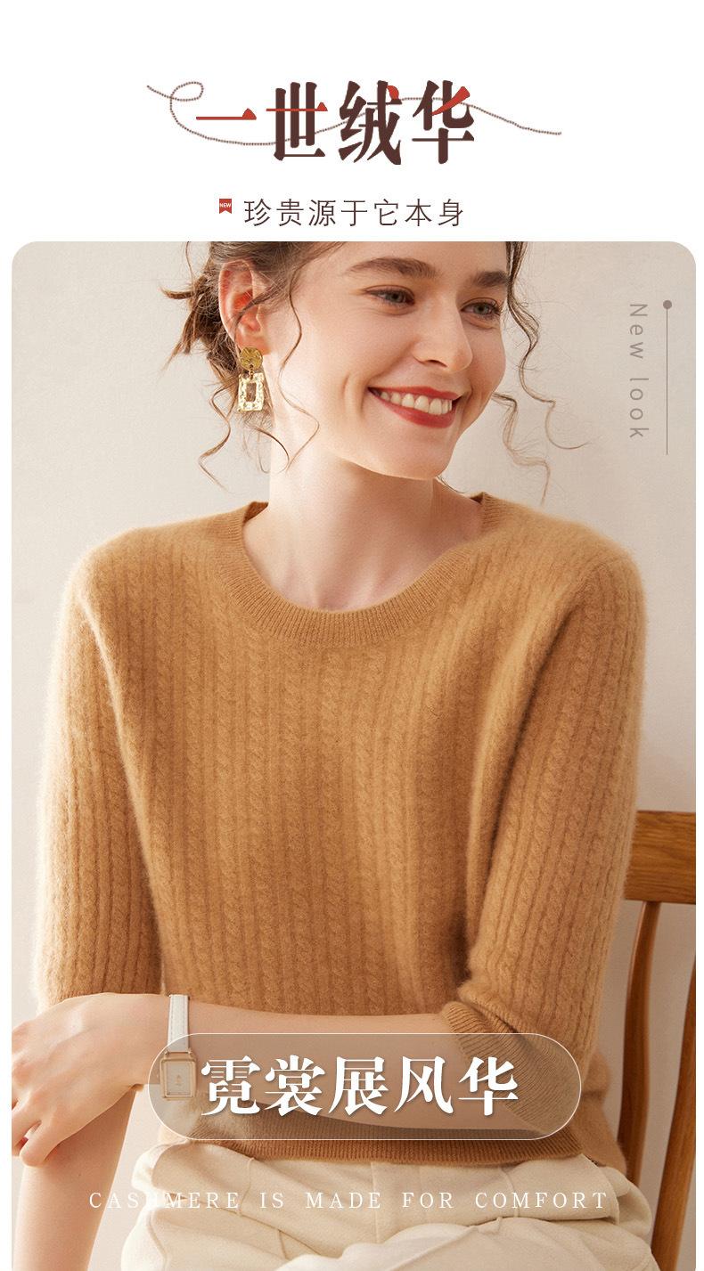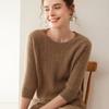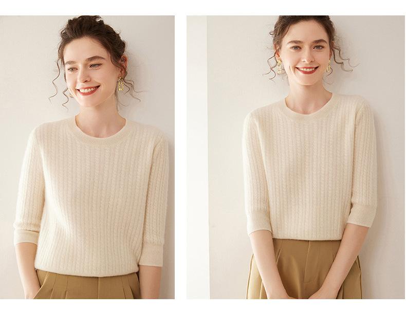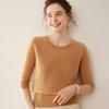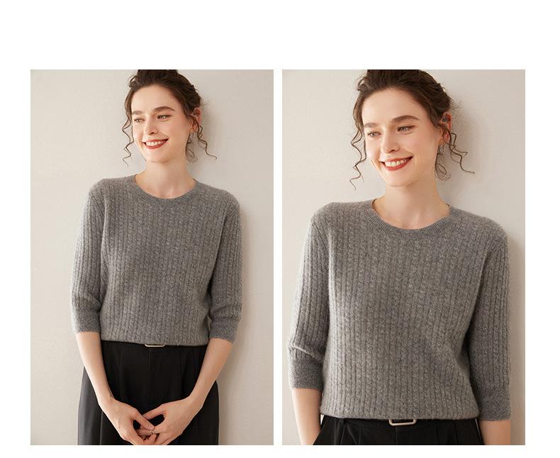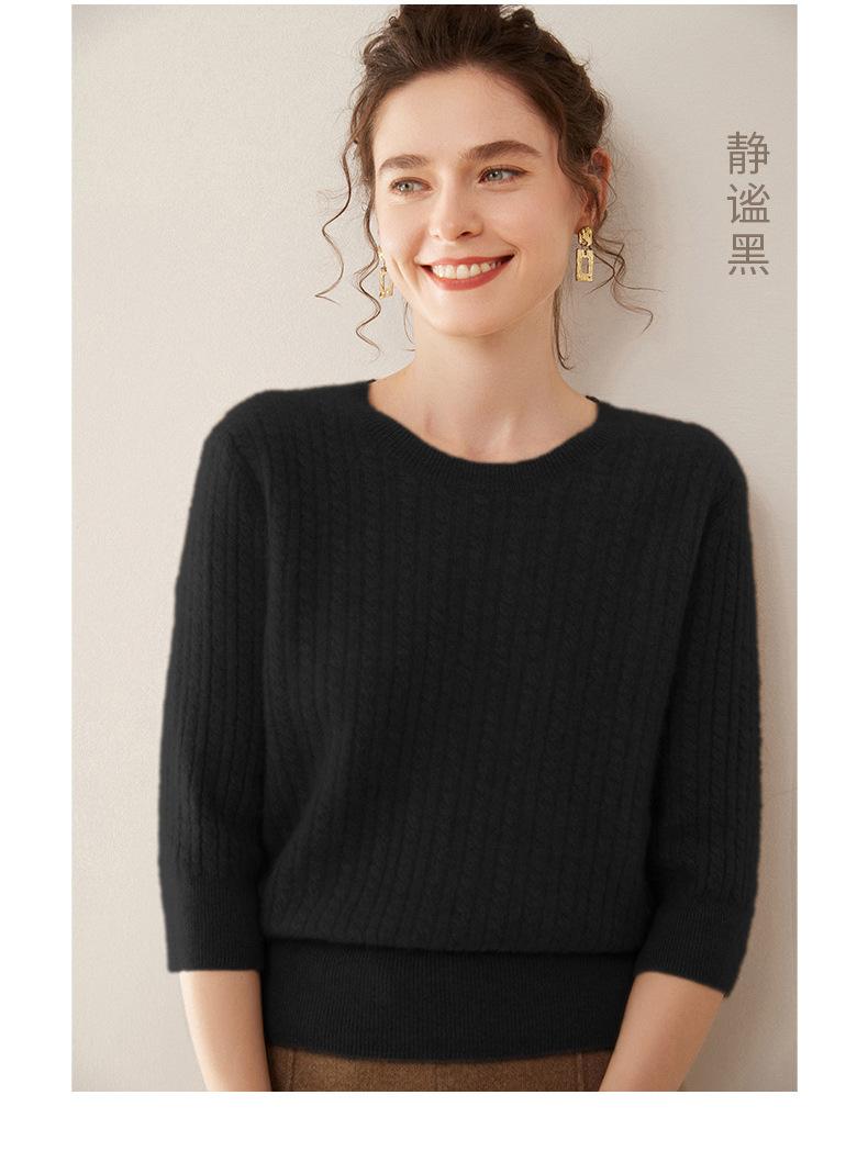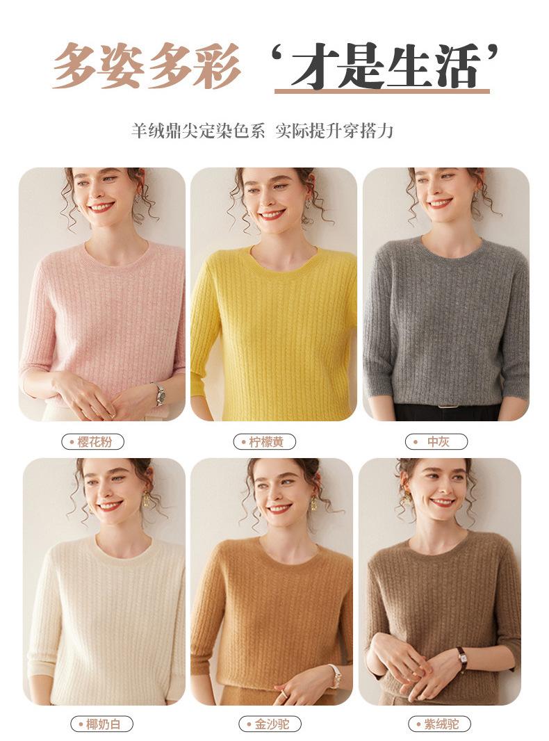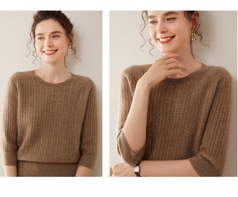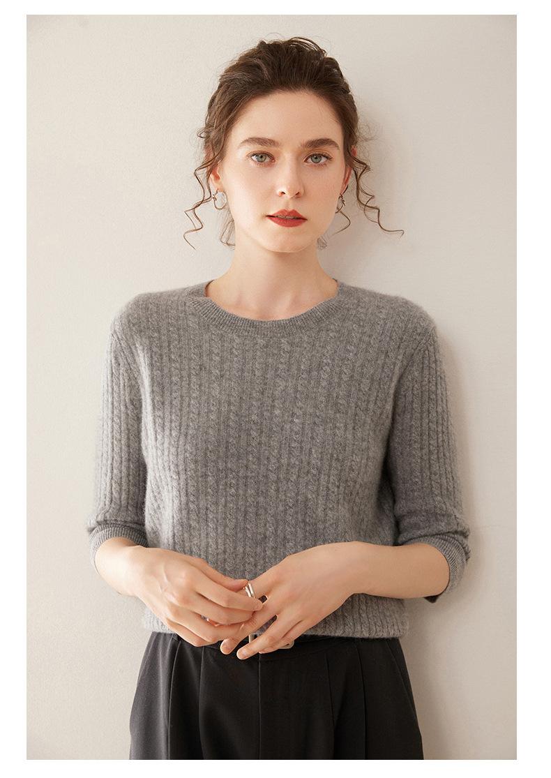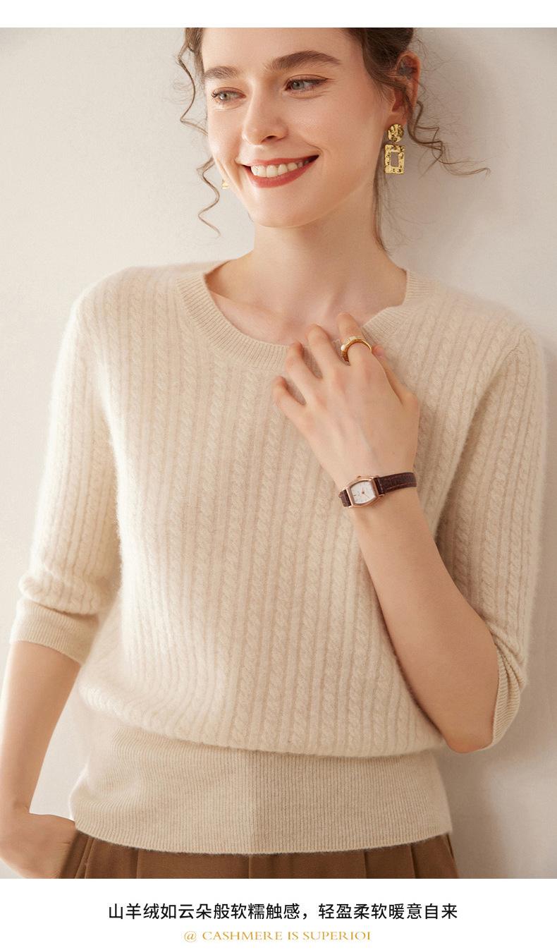 Camiseta Básica de Punto de Cachemira de Cuello Redondo de Doce Puntadas para Mujer Primavera y Otoño Manga Media Manga Siete Puntos Top Holgado Interior Suave Ceroso