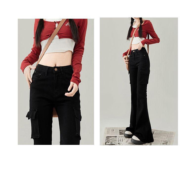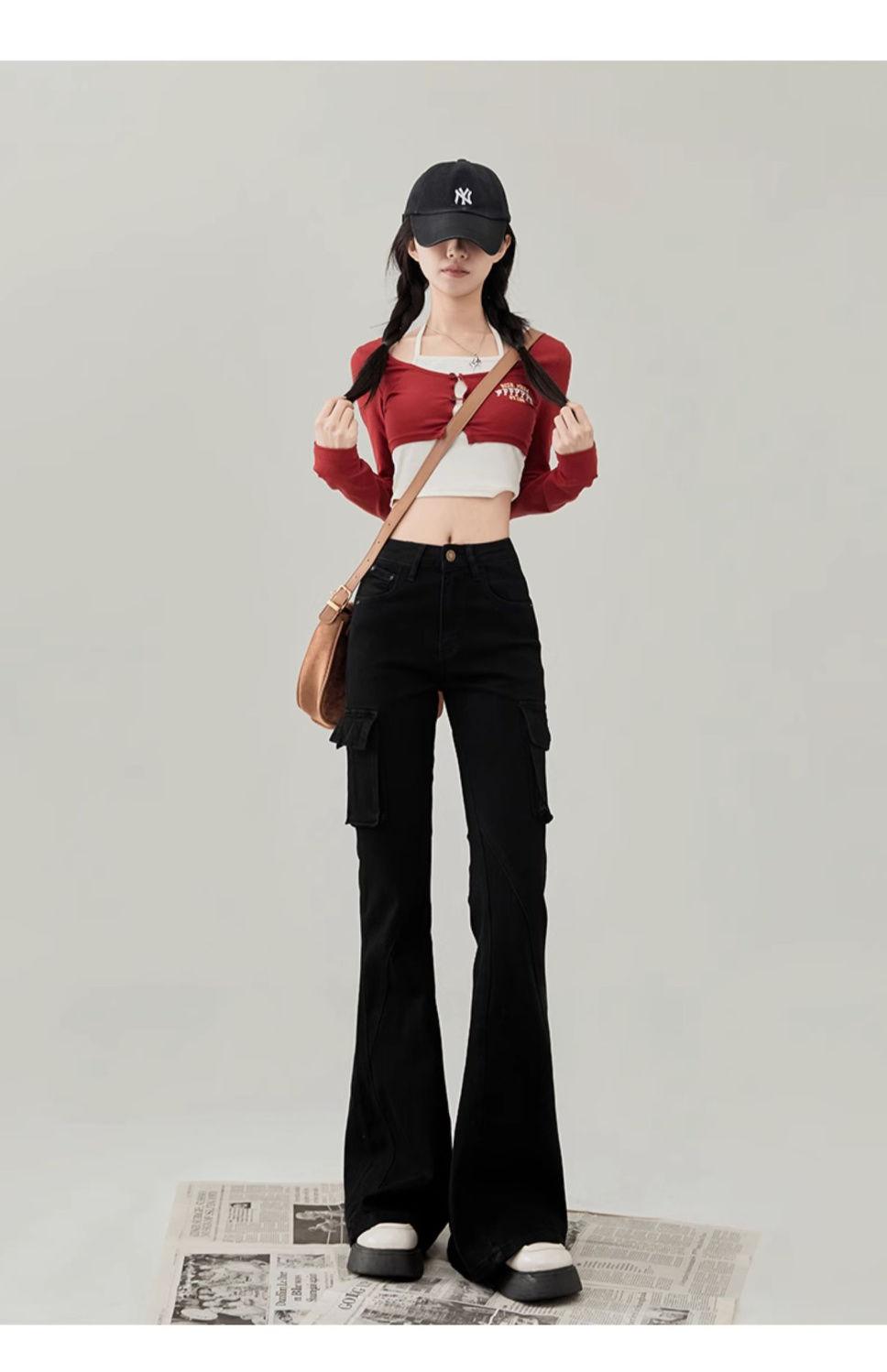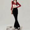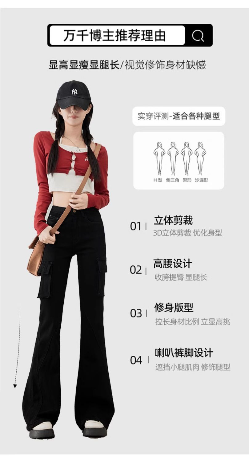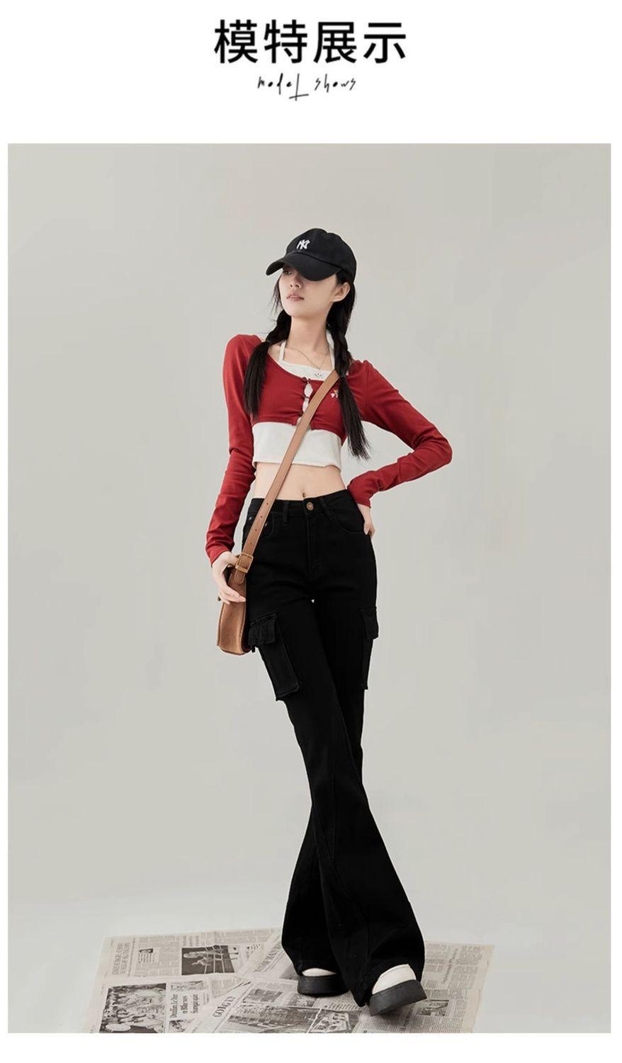 Pantalones cortos negros estilo americano para mujer, talla pequeña, primavera y otoño 2024, rectos, de cintura alta y ajustados, acampanados.