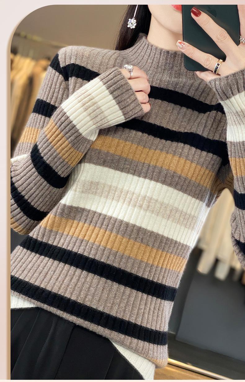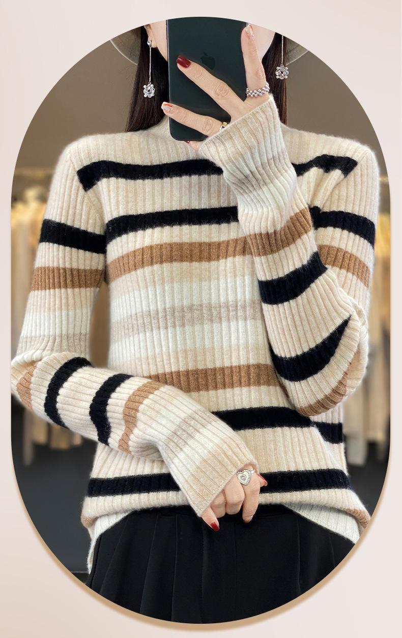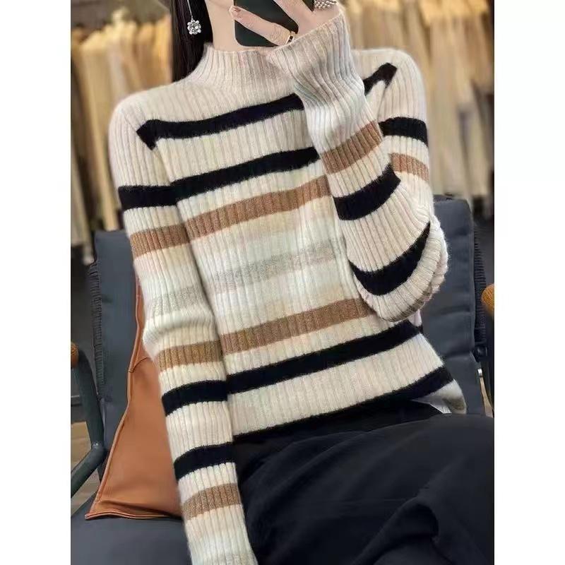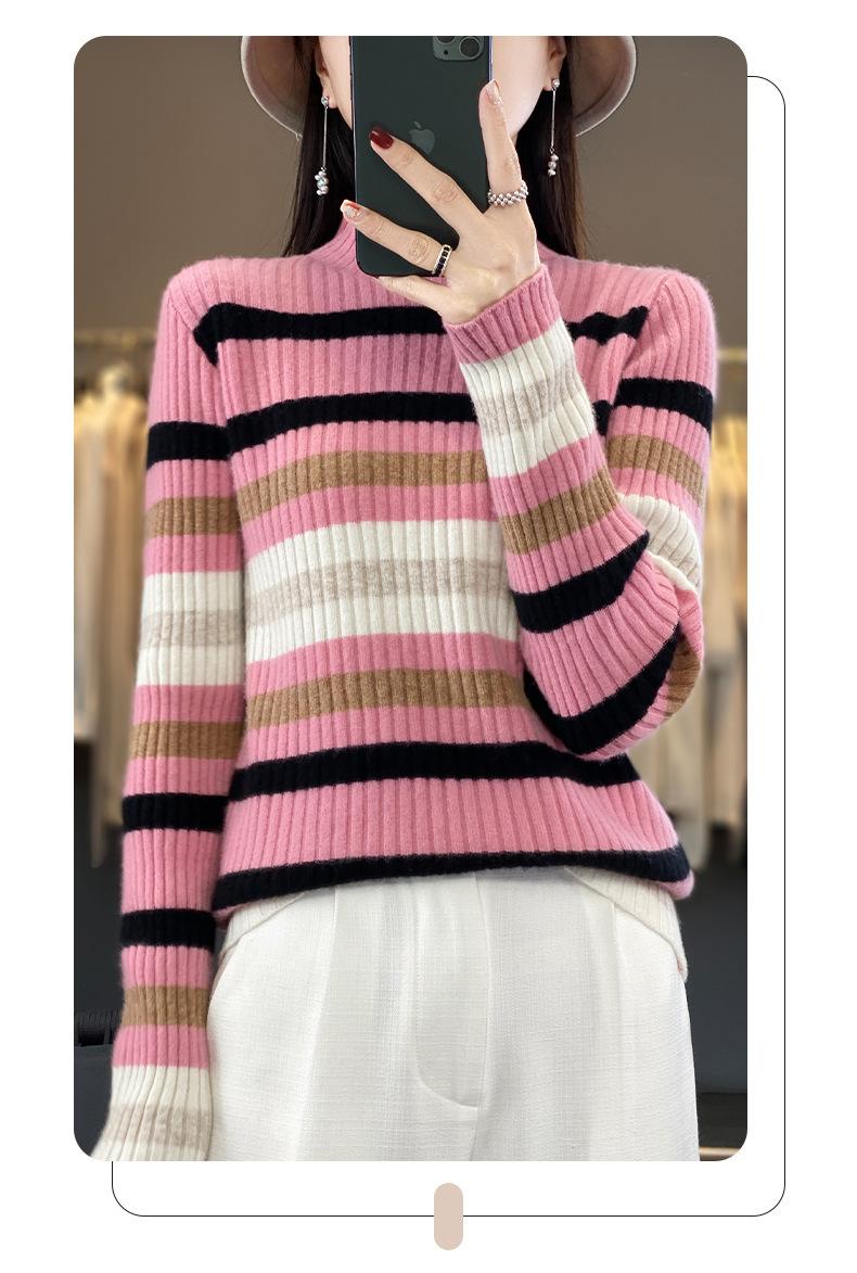 25 Nuevos Tops Jersey de Punto de Cuello Alto Medio a Rayas para Otoño e Invierno para Mujer, Aspecto Adelgazante, Fondo, Punto para Mujer a Rayas