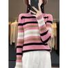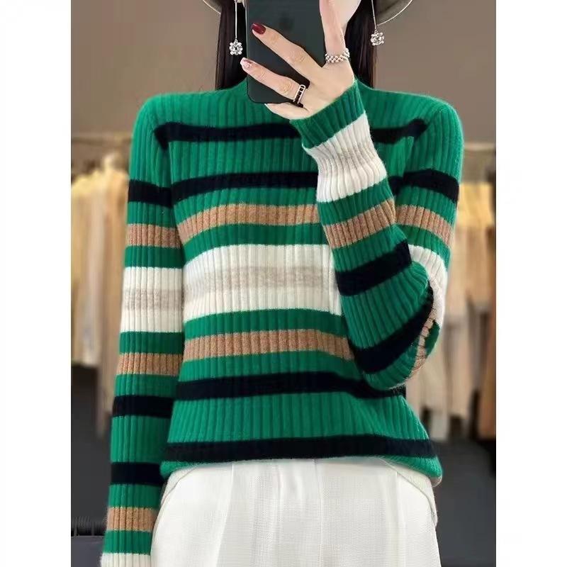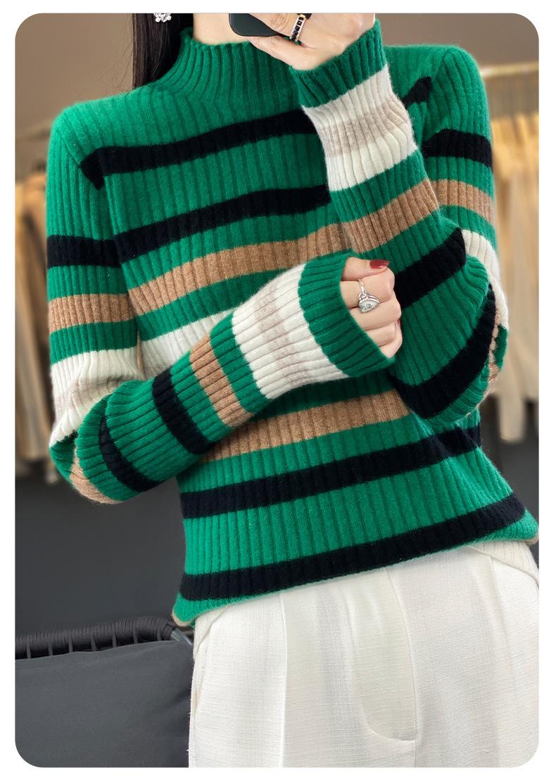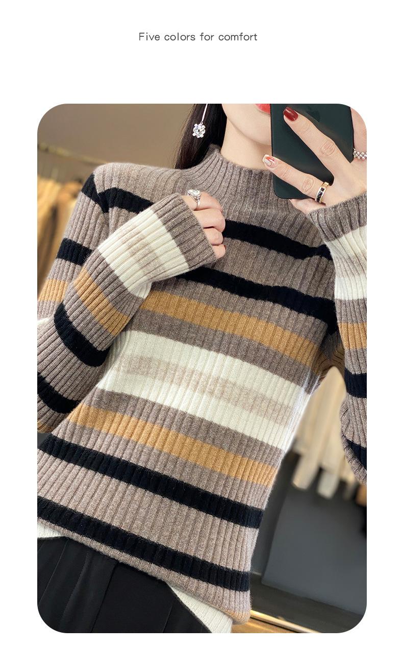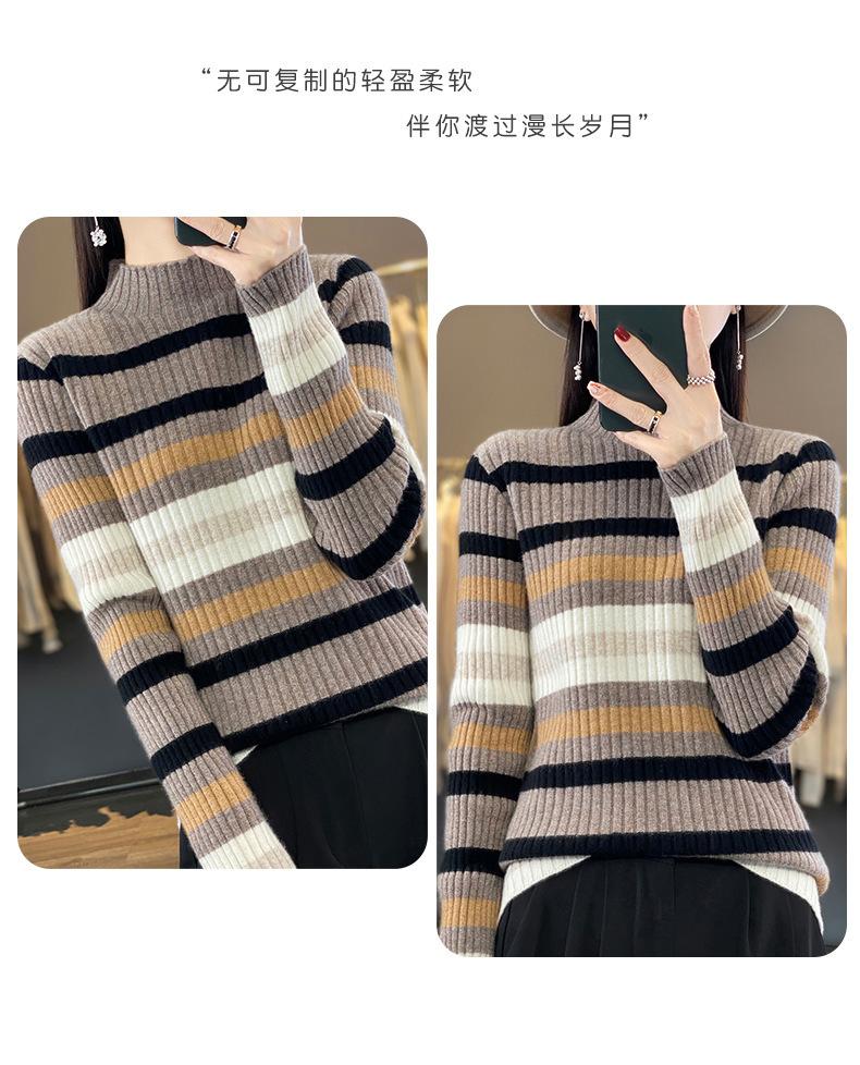 25 Nuevos Tops Jersey de Punto de Cuello Alto Medio a Rayas para Otoño e Invierno para Mujer, Aspecto Adelgazante, Fondo, Punto para Mujer a Rayas