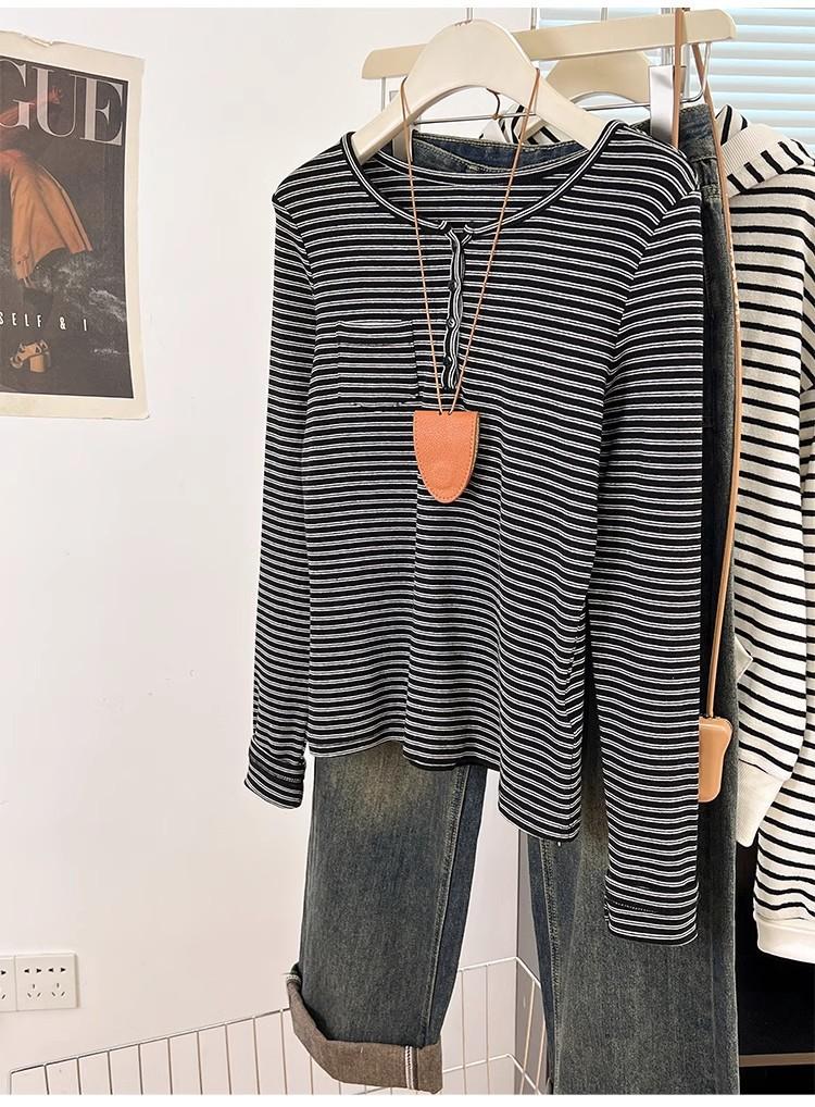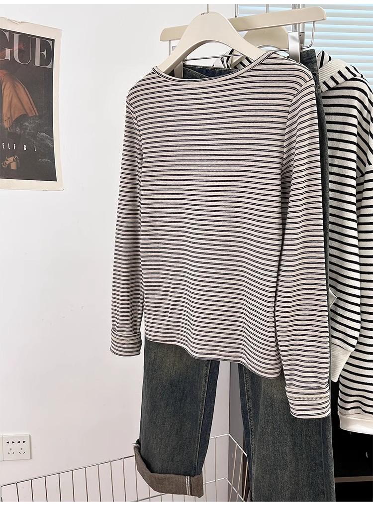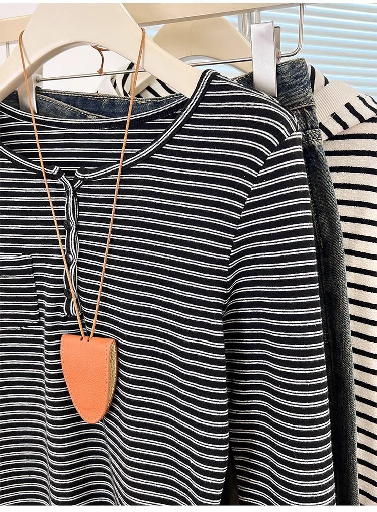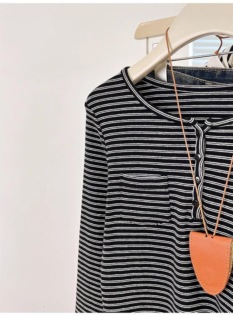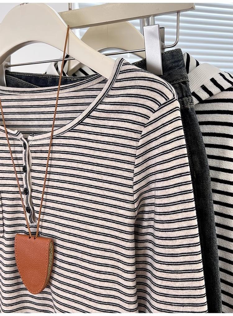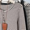 Camiseta de Manga Larga con Hombros y Cuello Medio Abierto a Rayas para Mujer, Diseño Nicho con Sentido de la Moda para Primavera y Otoño, Entallada, Suelta, Básica, Top Interior
