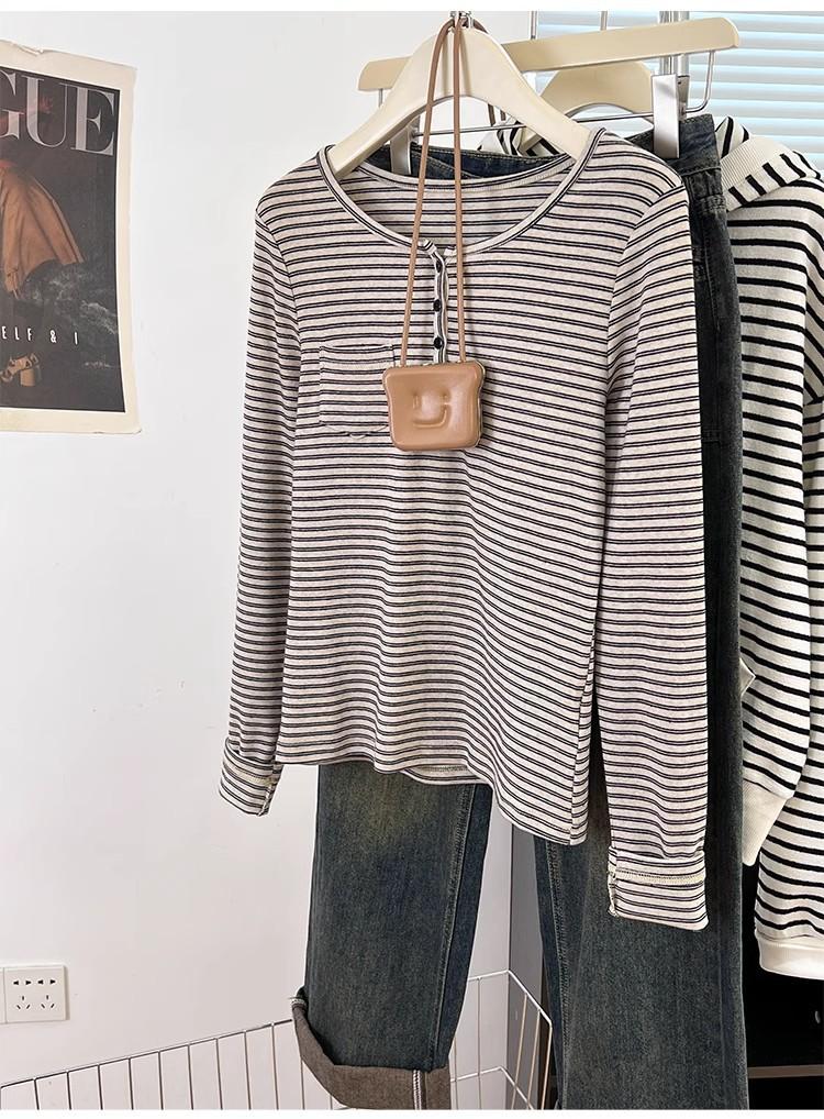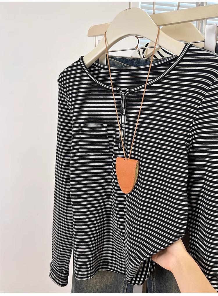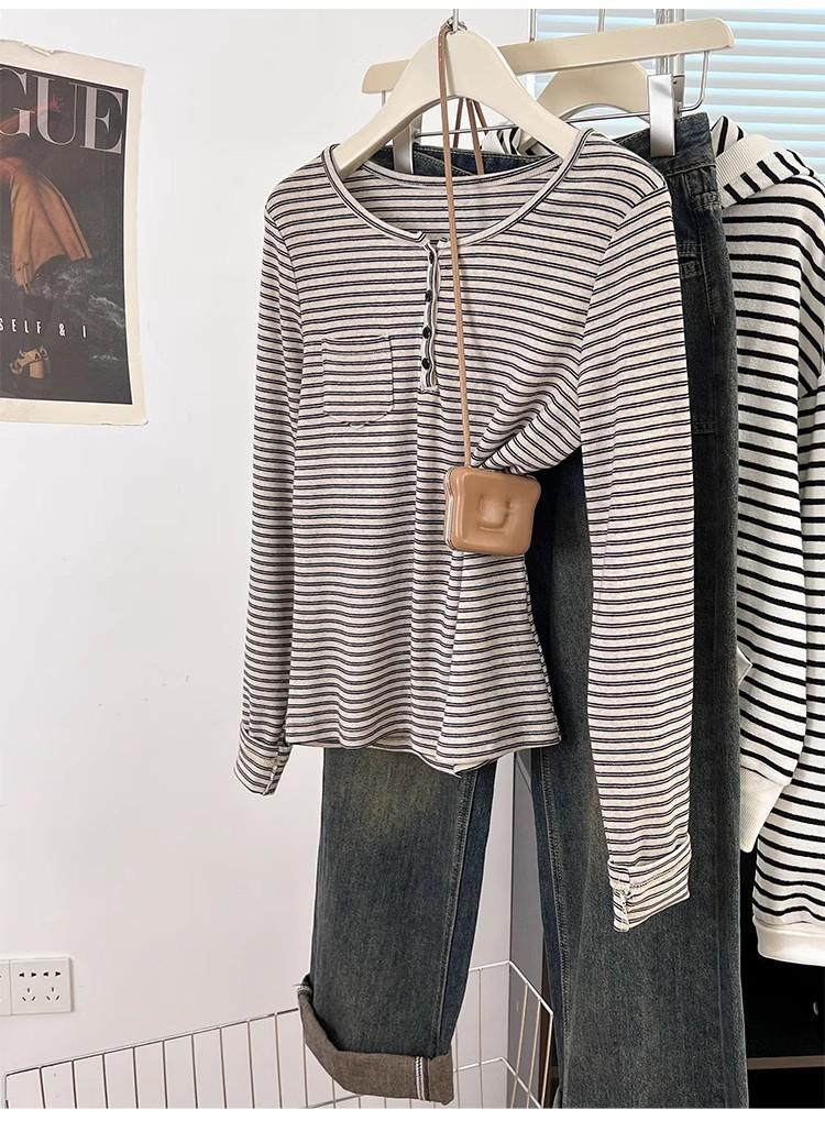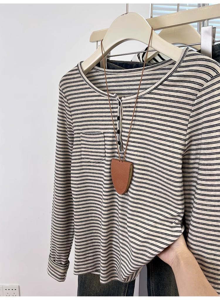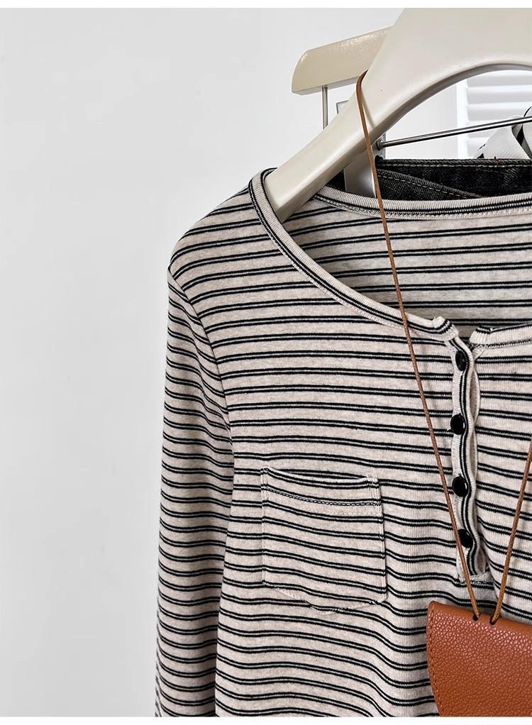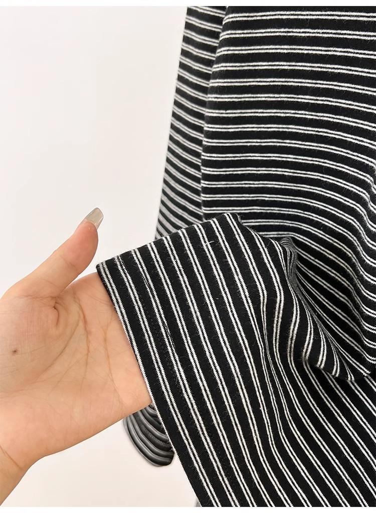 Camiseta de Manga Larga con Hombros y Cuello Medio Abierto a Rayas para Mujer, Diseño Nicho con Sentido de la Moda para Primavera y Otoño, Entallada, Suelta, Básica, Top Interior