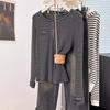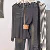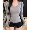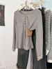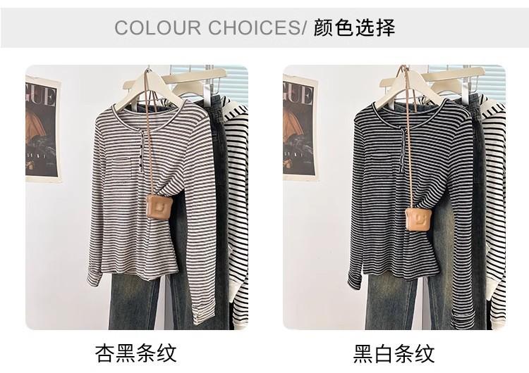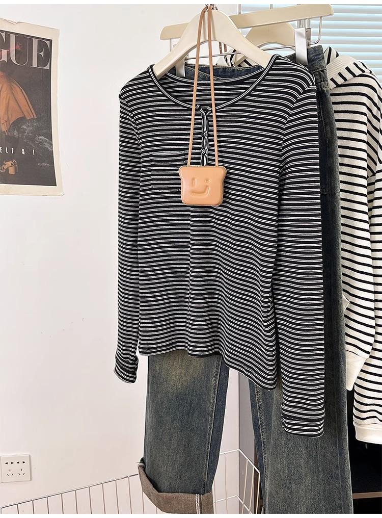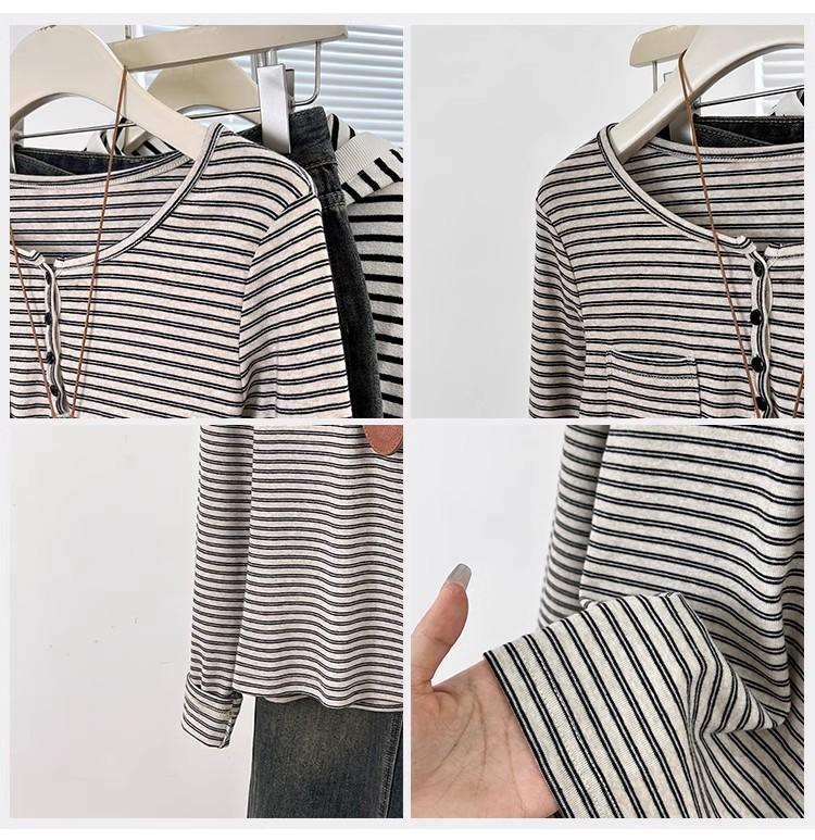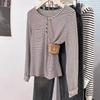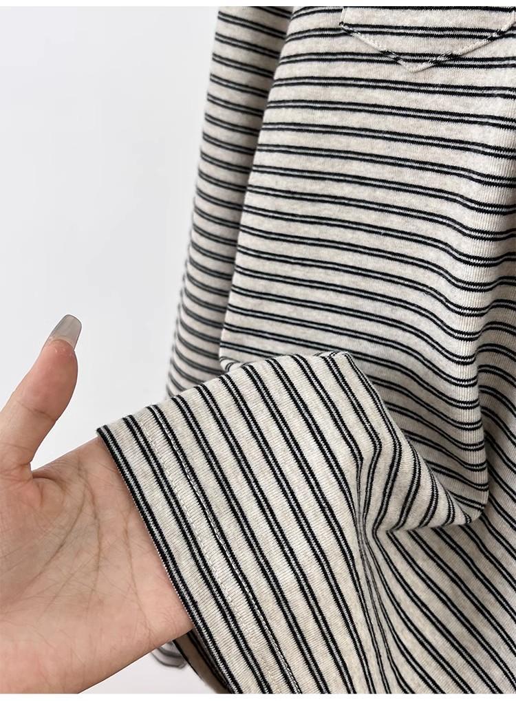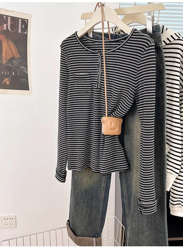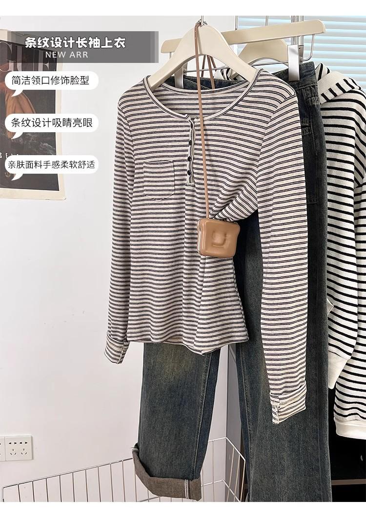 Camiseta de Manga Larga con Hombros y Cuello Medio Abierto a Rayas para Mujer, Diseño Nicho con Sentido de la Moda para Primavera y Otoño, Entallada, Suelta, Básica, Top Interior