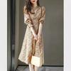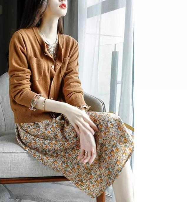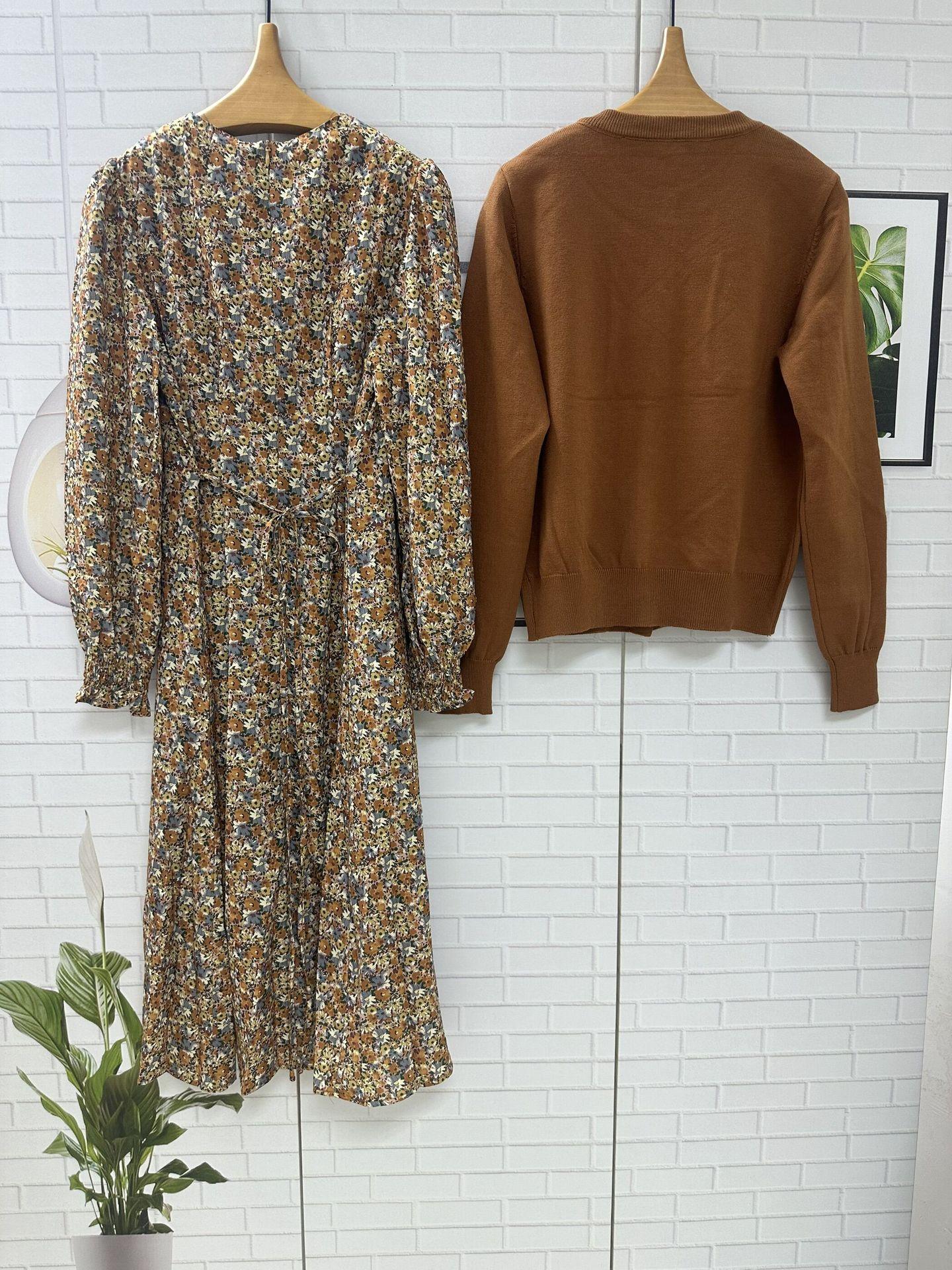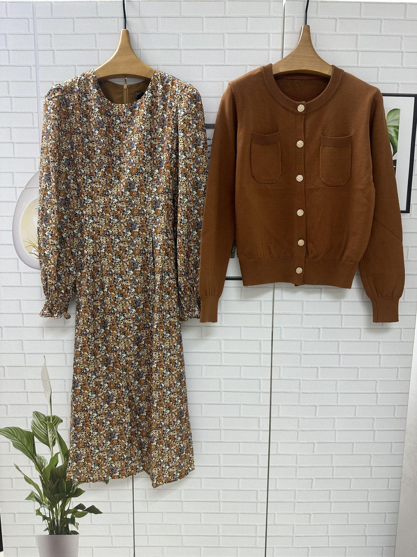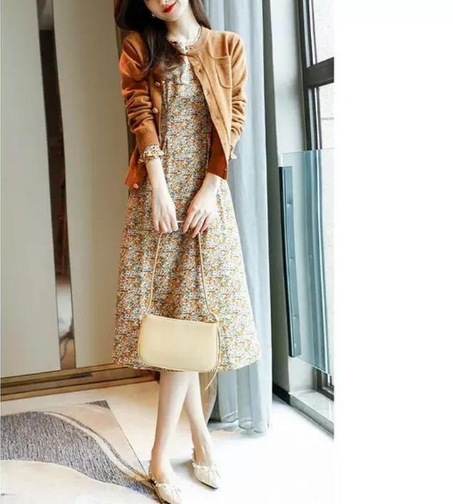 Estación Europea 2025 Primavera y Otoño Vestido Floral de Manga Larga para Mujer Estilo Chic Francés Set de Dos Piezas Cárdigan