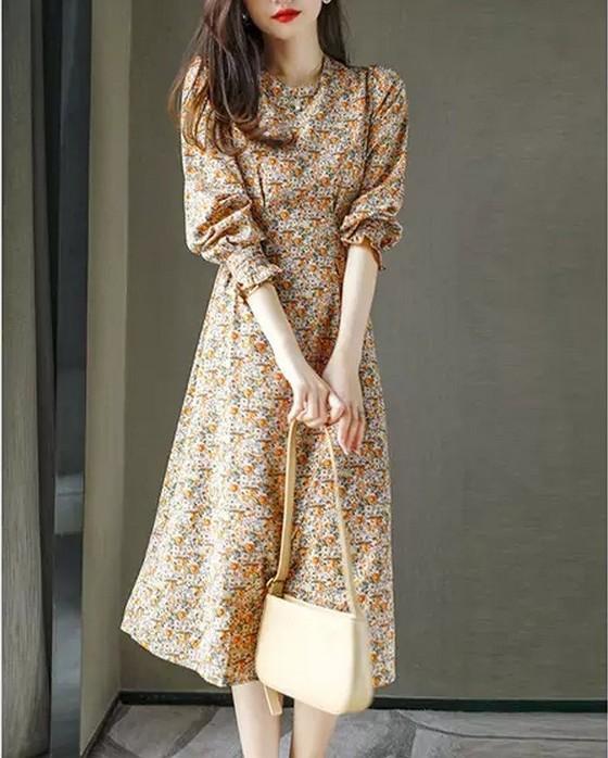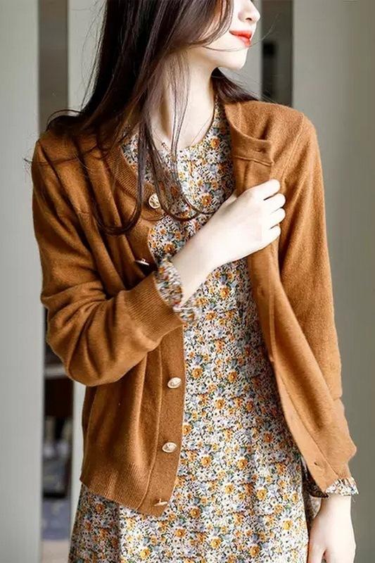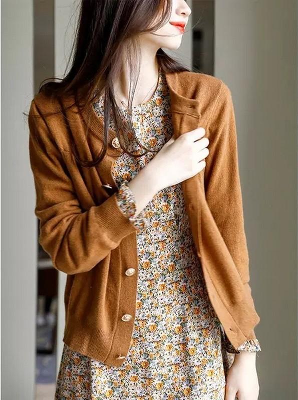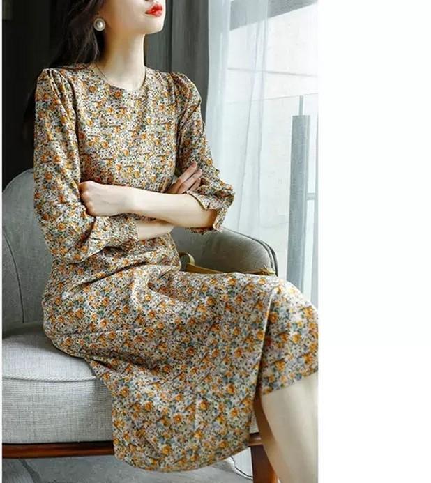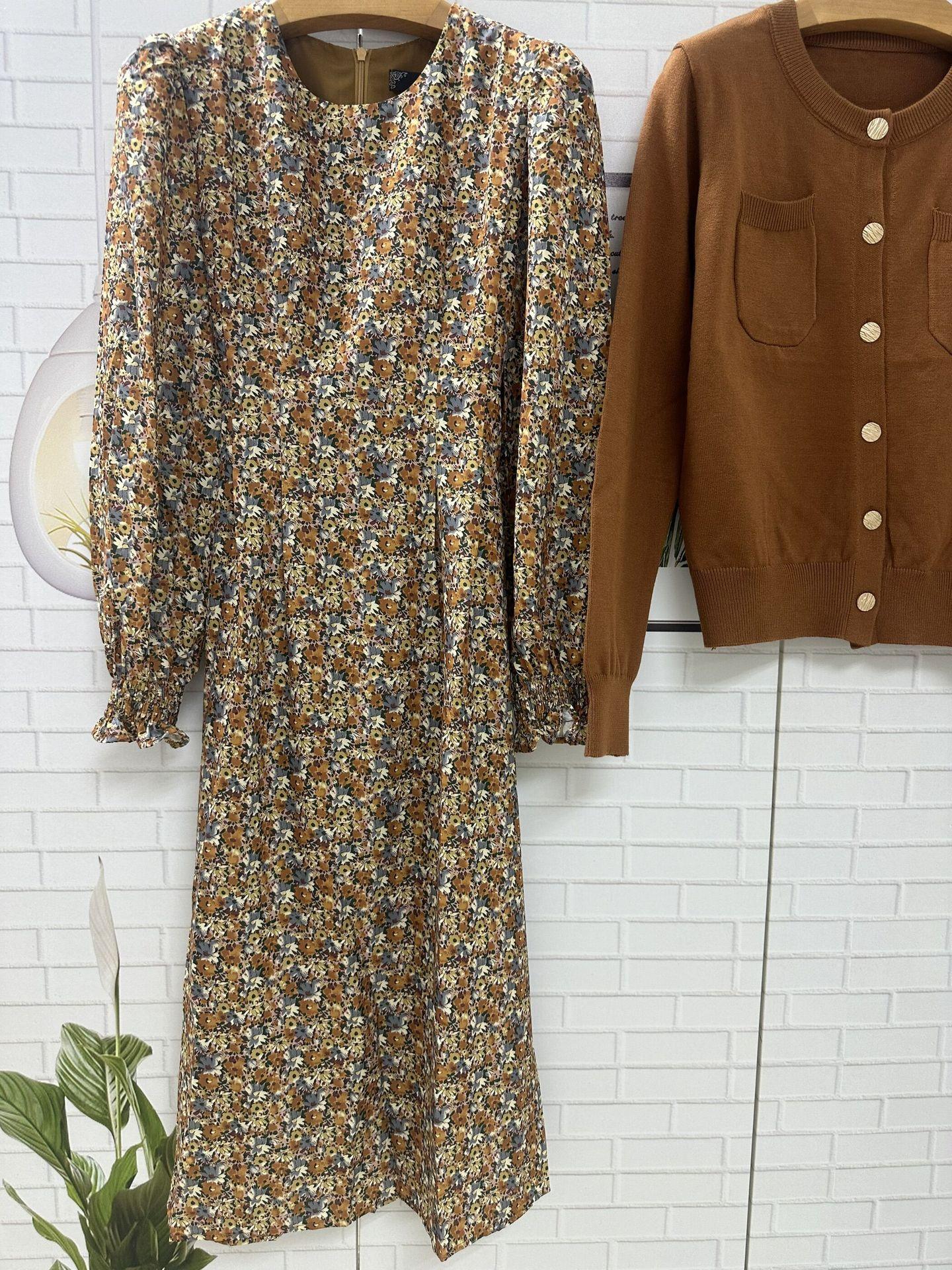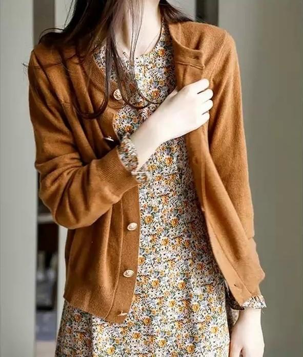 Estación Europea 2025 Primavera y Otoño Vestido Floral de Manga Larga para Mujer Estilo Chic Francés Set de Dos Piezas Cárdigan