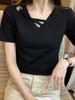 Camiseta de algodón de manga corta con hombros descubiertos para mujer, estilo coreano holgado, estilo occidental, con escote en V cruzado y media manga.