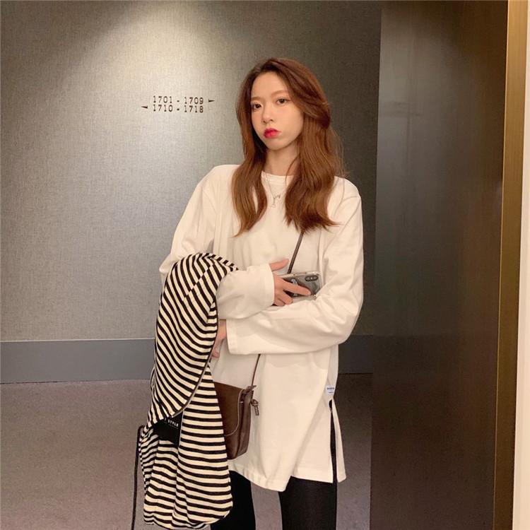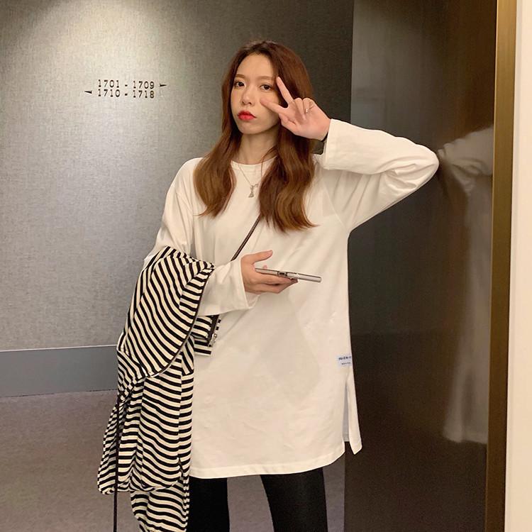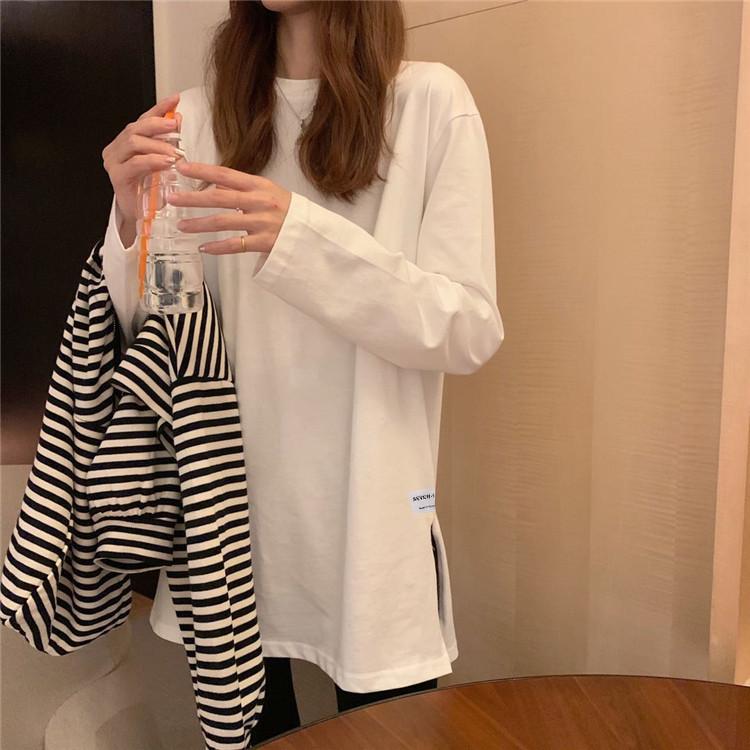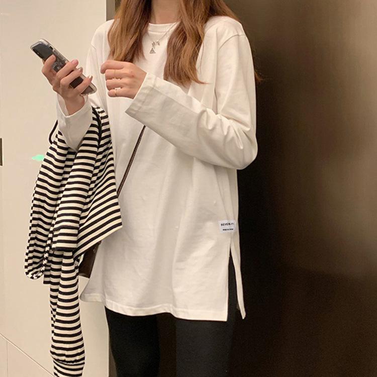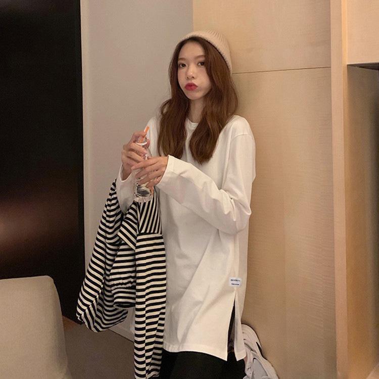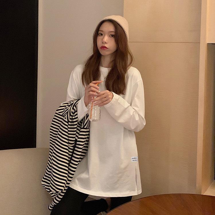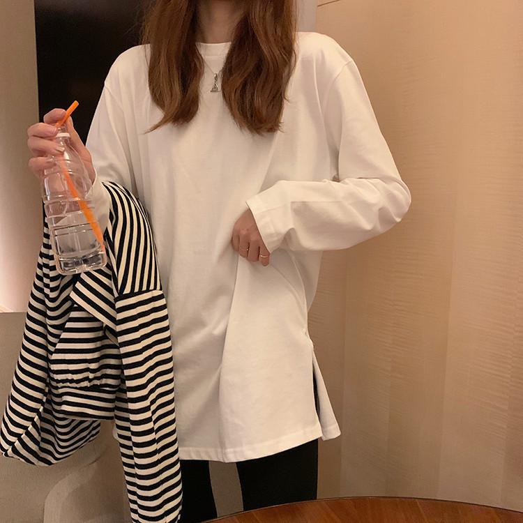 Playera Blanca de Algodón Puro con Abertura de Manga Larga Cuello Redondo Largo Medio Camiseta Base para Mujer con Top de Talla Grande que Cubre el Trasero para Otoño
