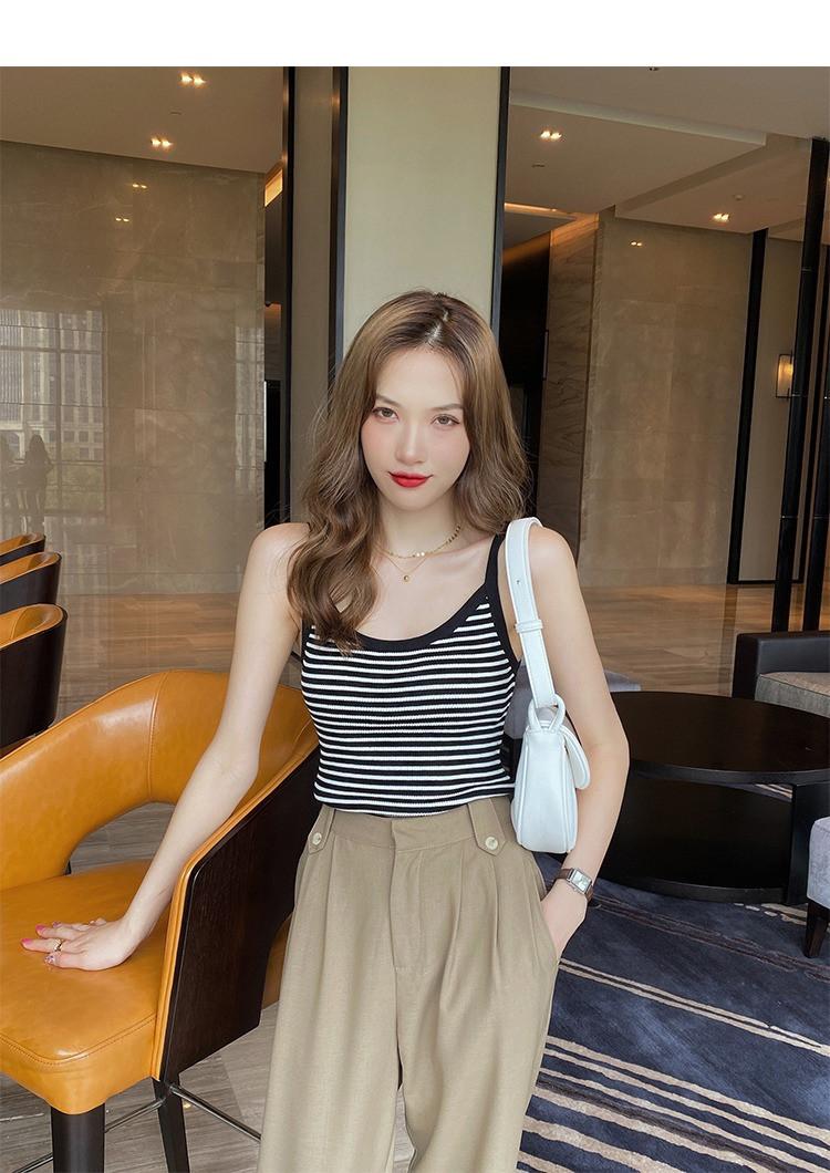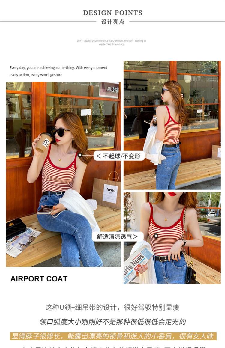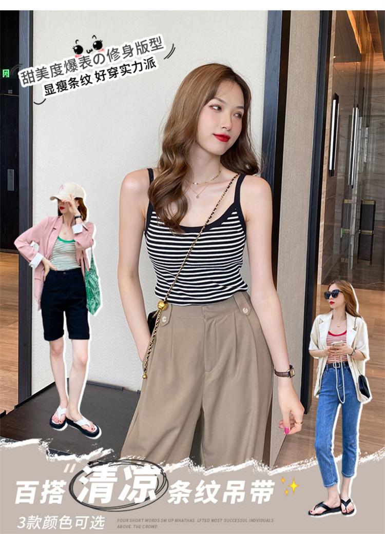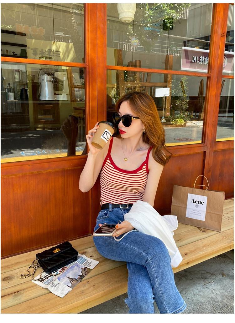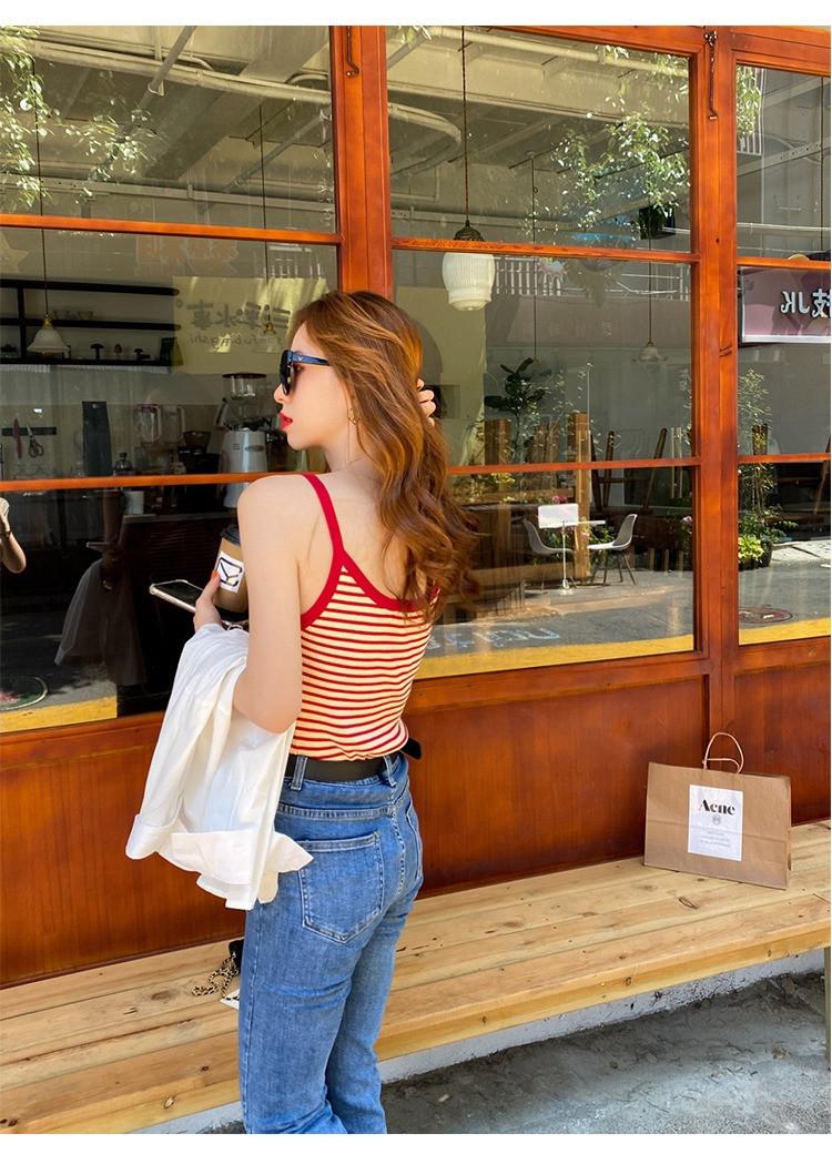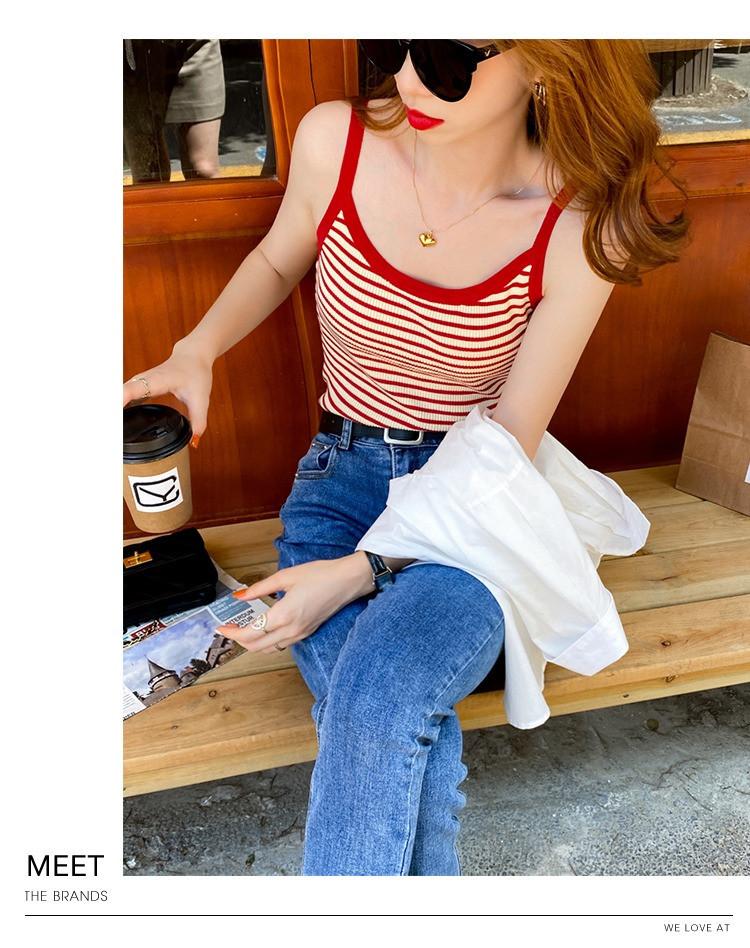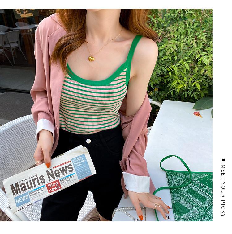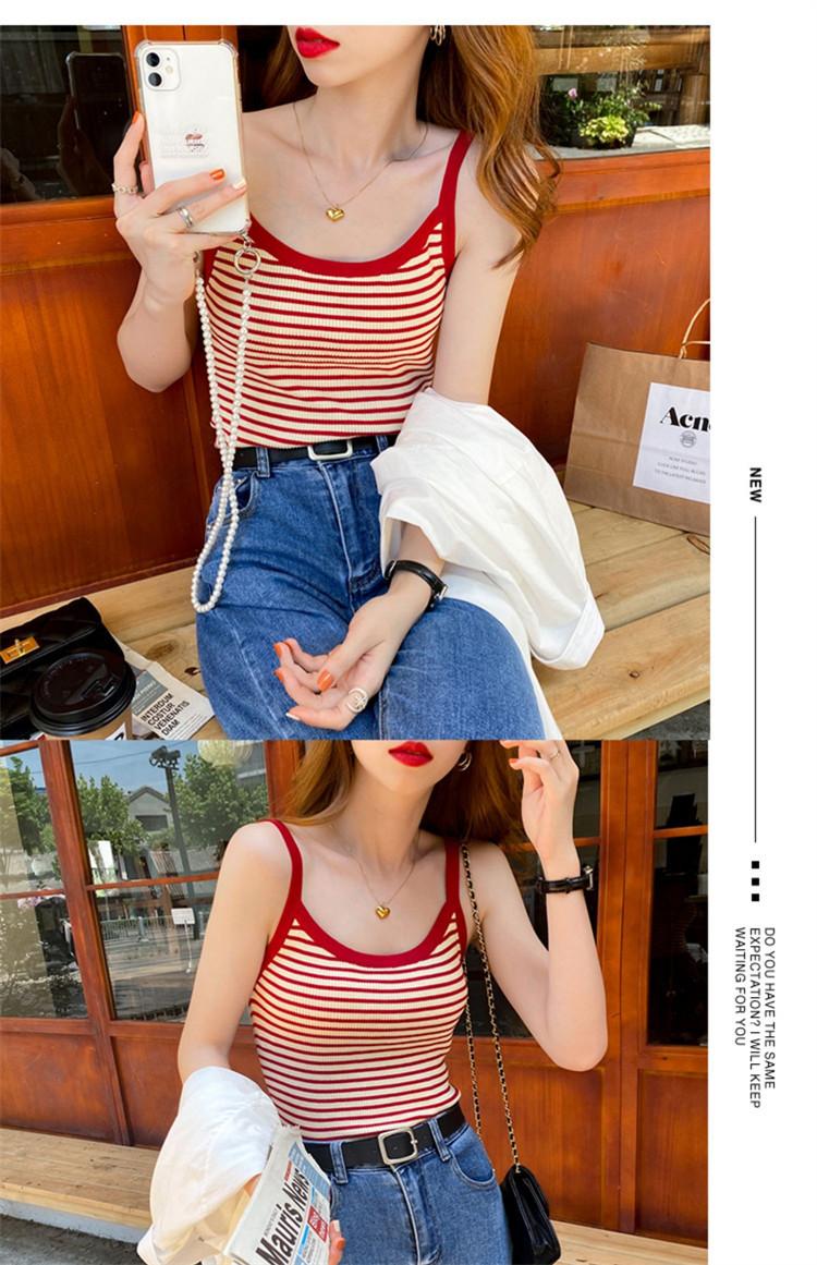 Chaleco exterior corto de seda de hielo de punto a rayas con tirantes pequeños para mujer, base interior de verano, corte entallado, sin mangas, estilo picante.