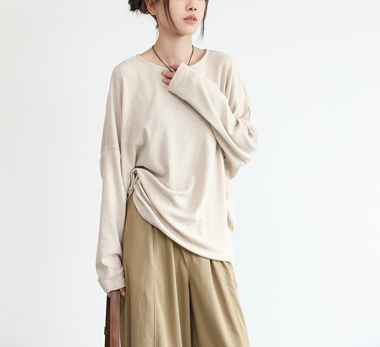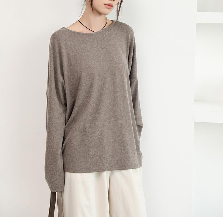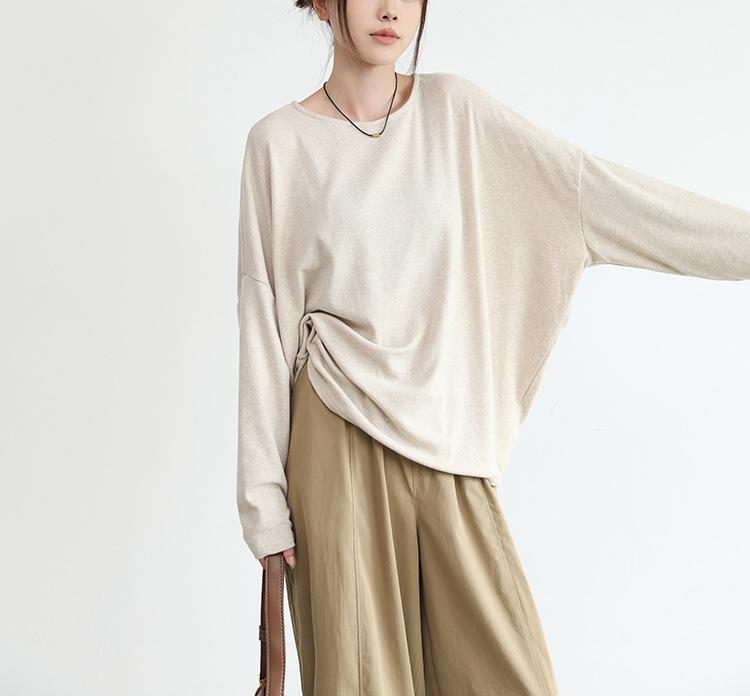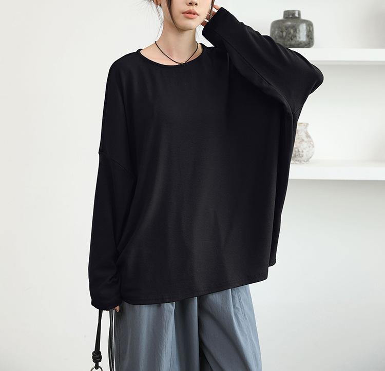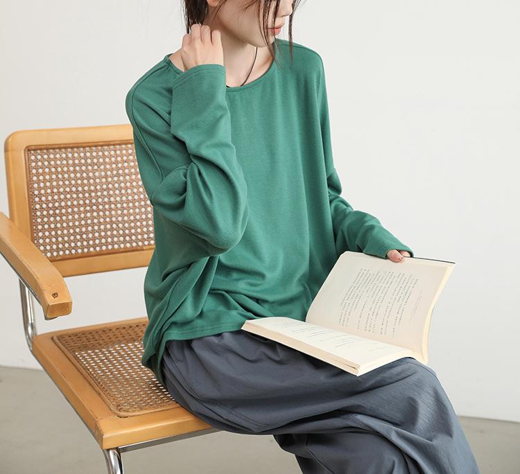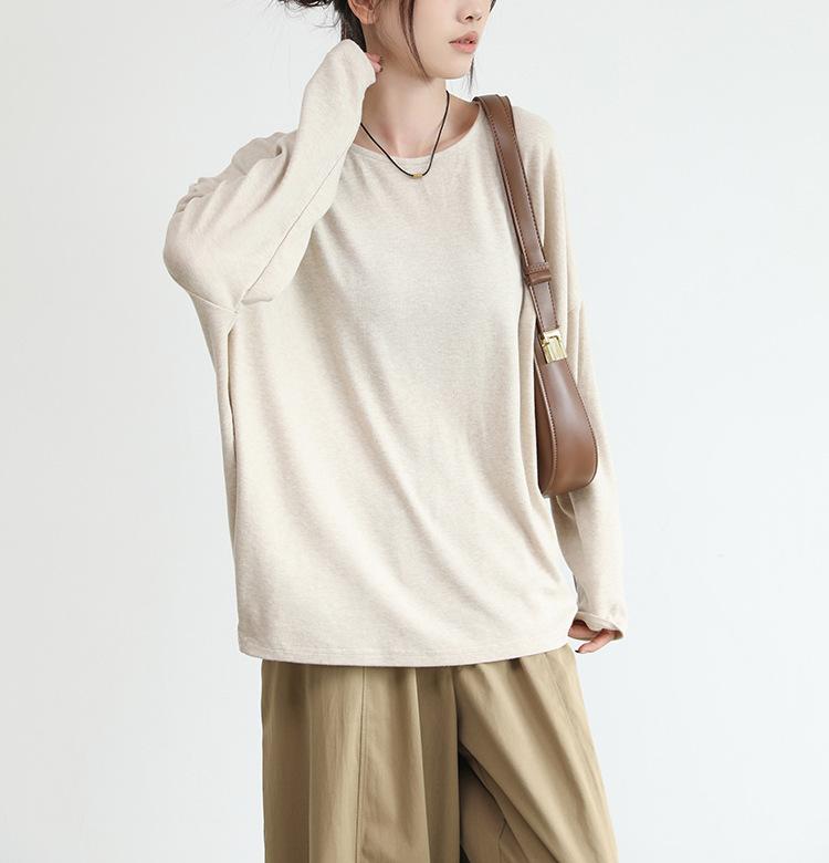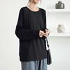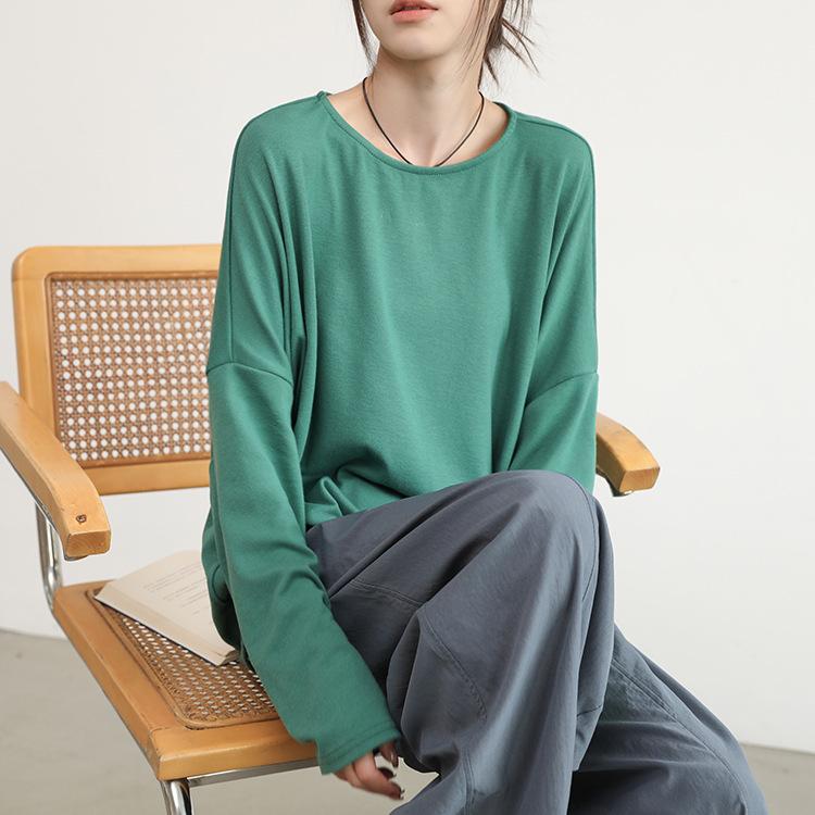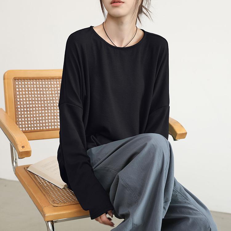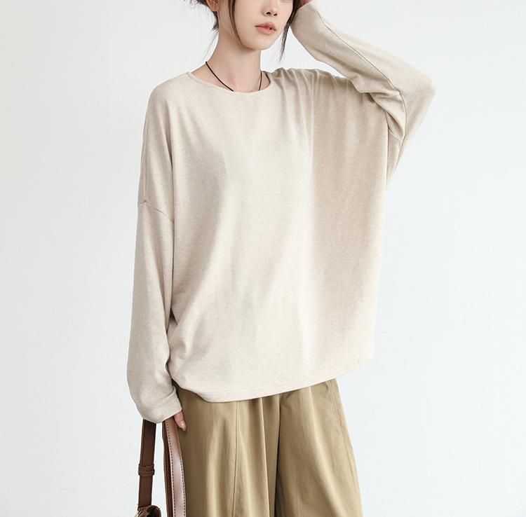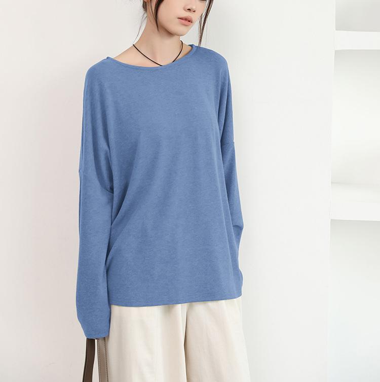 Camiseta japonesa de otoño para mujer, color liso, cuello redondo, manga larga, suelta, básica