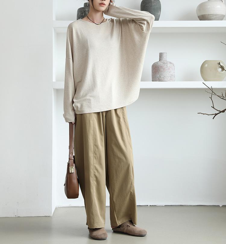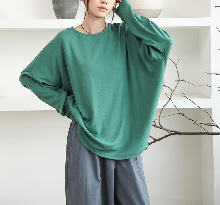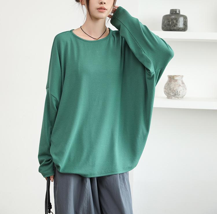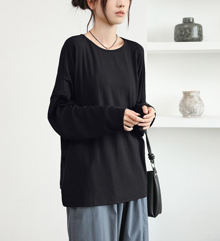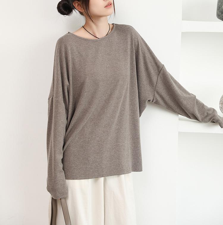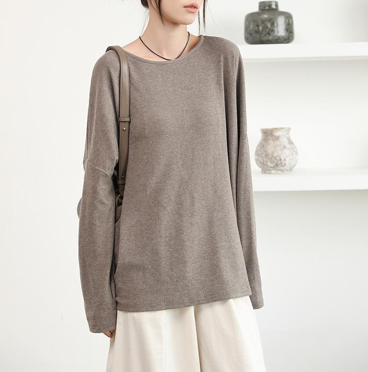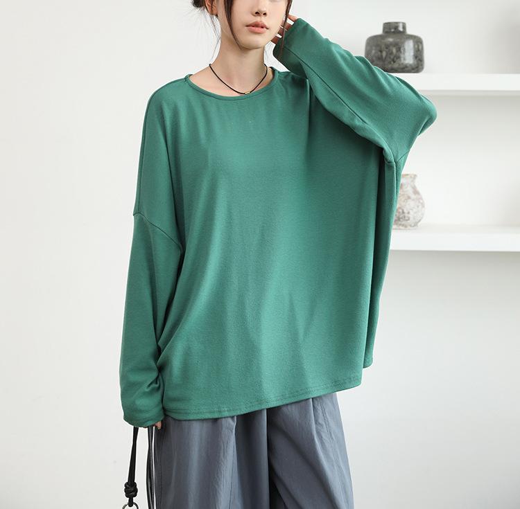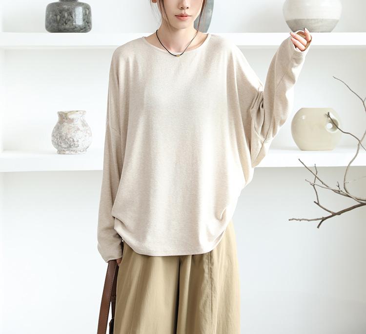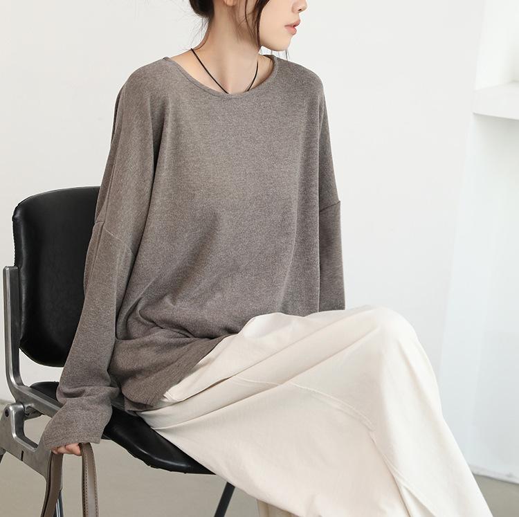 Camiseta japonesa de otoño para mujer, color liso, cuello redondo, manga larga, suelta, básica