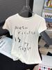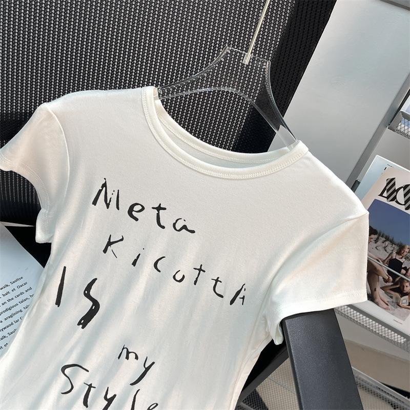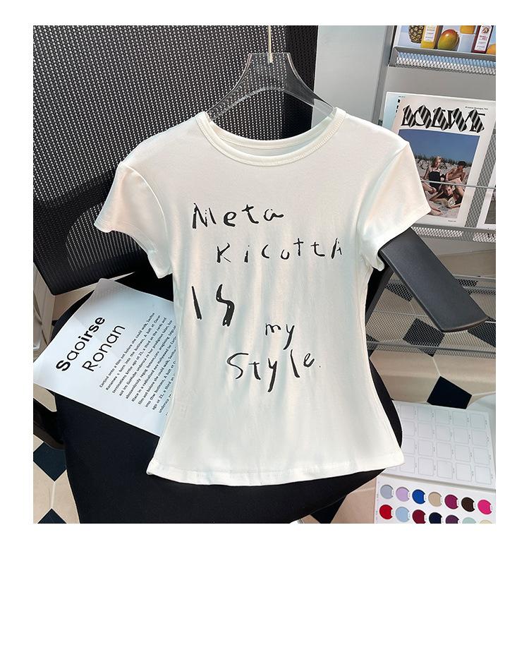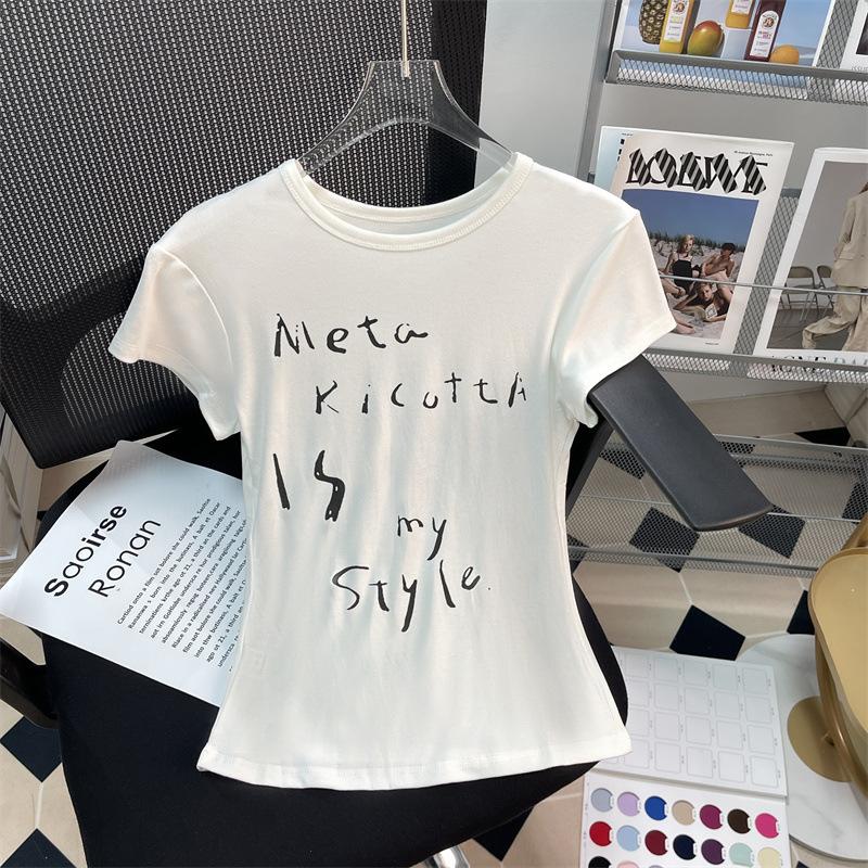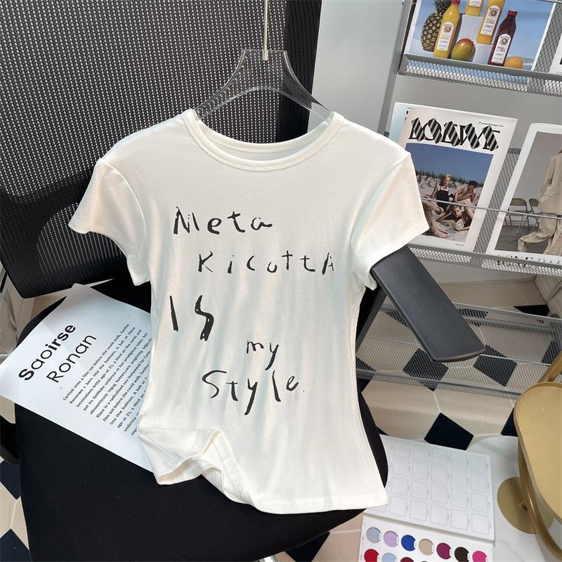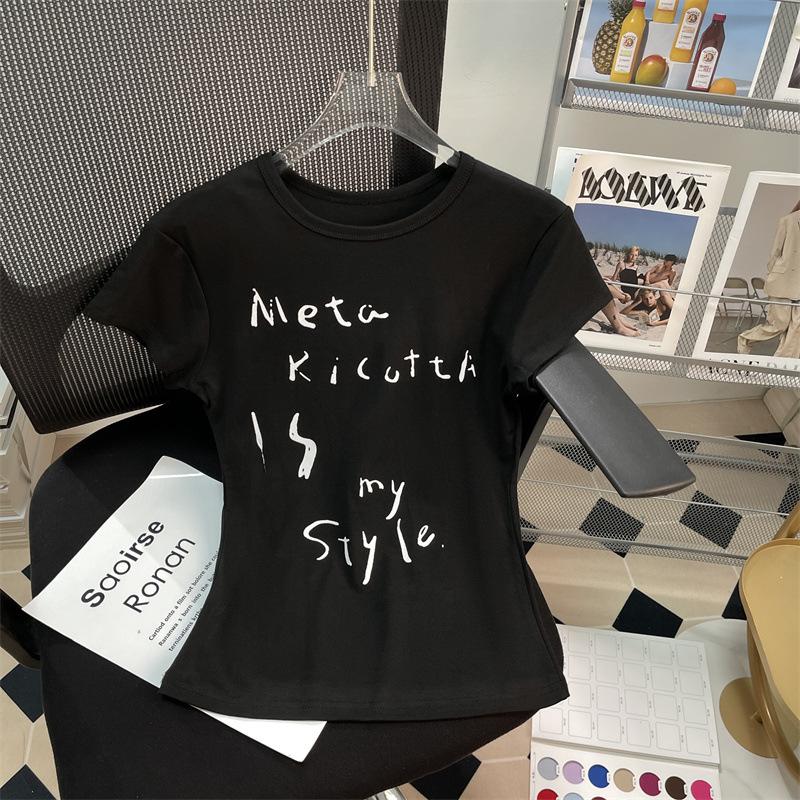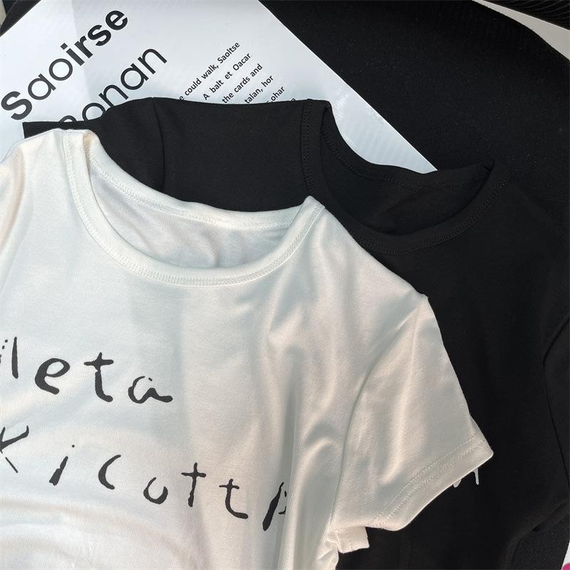 Camiseta de manga corta con estampado de letras chic vintage de estilo americano para mujer, diseño de verano, cintura ajustada, adelgazante y combinable.
