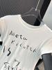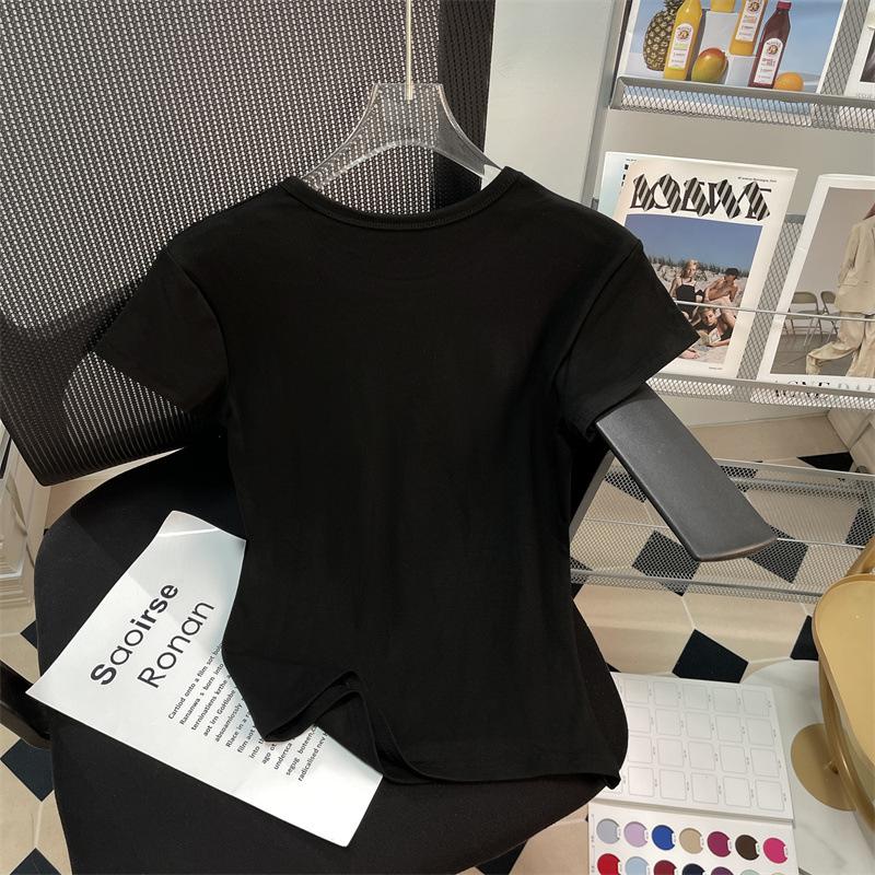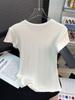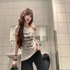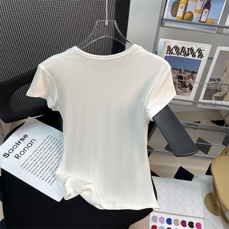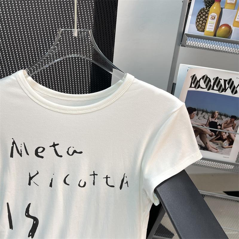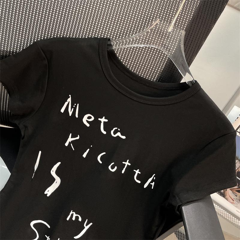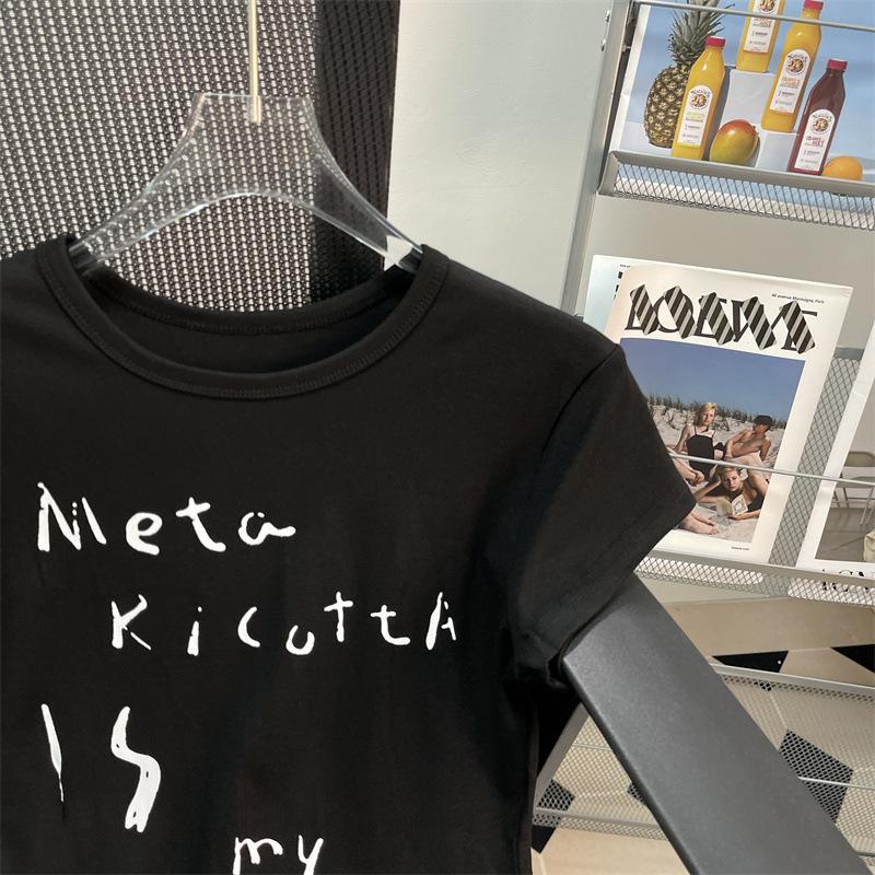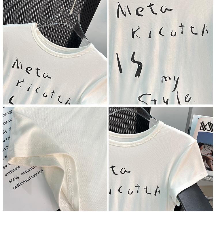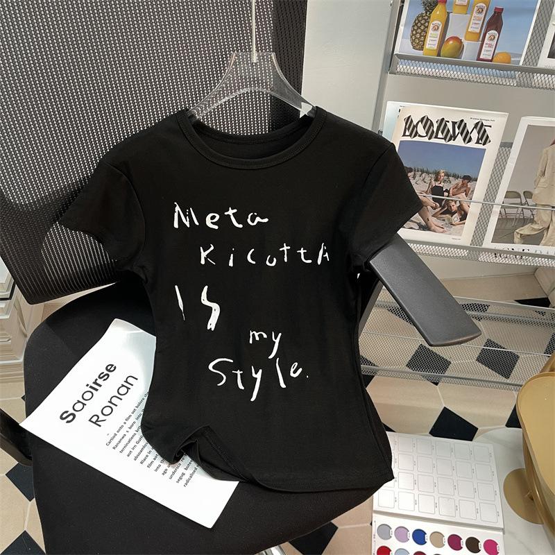 Camiseta de manga corta con estampado de letras chic vintage de estilo americano para mujer, diseño de verano, cintura ajustada, adelgazante y combinable.