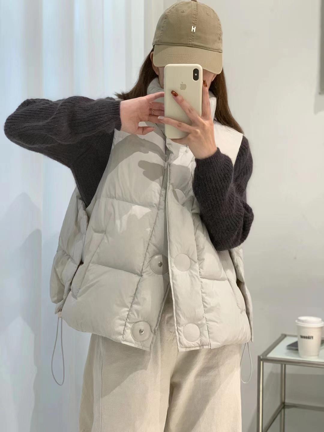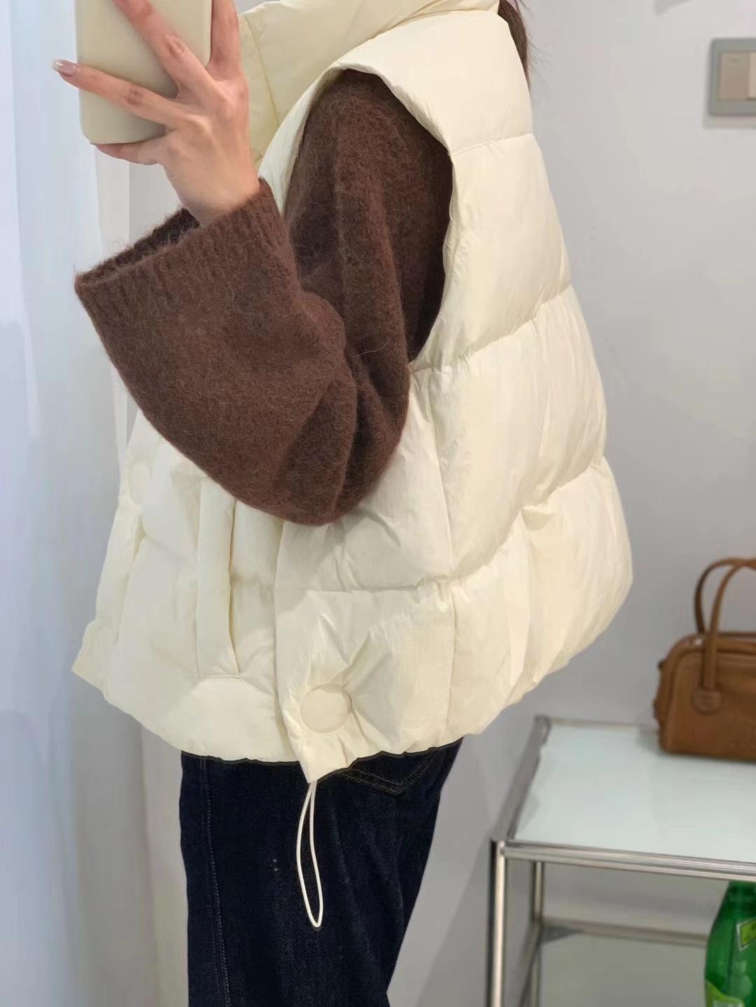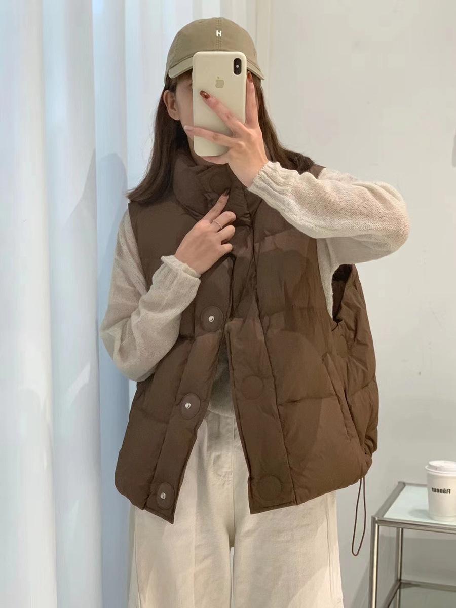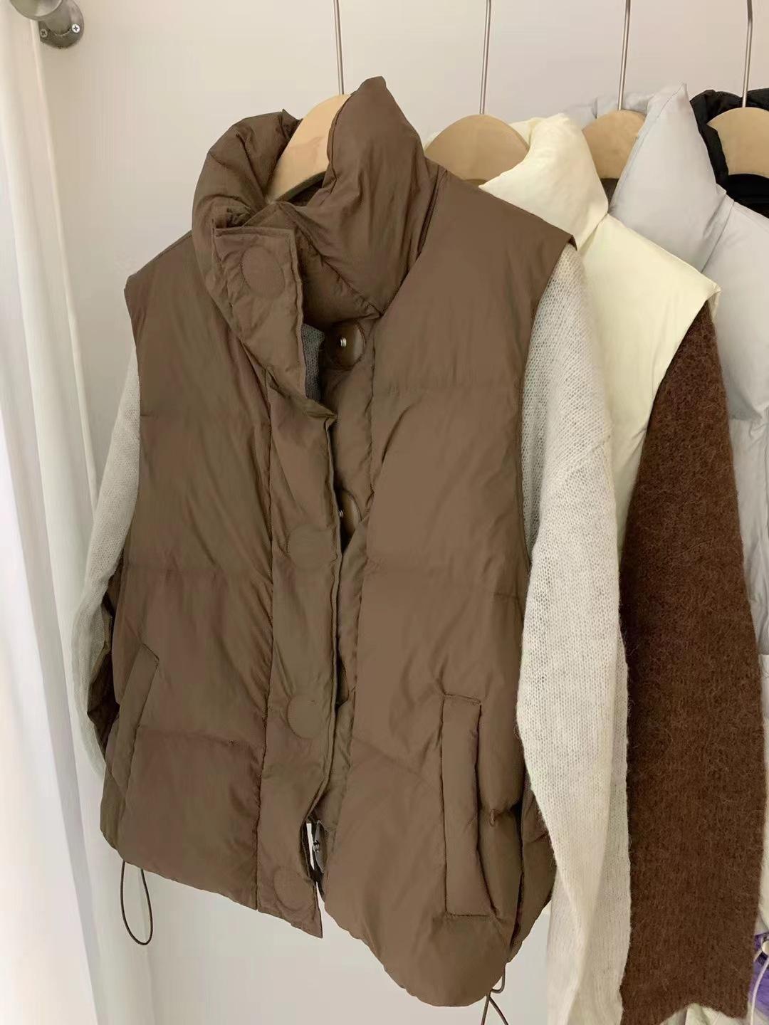Chaleco de plumón de ganso para mujer 2025 Otoño e Invierno Moda Cuello alto con botón de bolsa Ligero Estilo coreano Ropa exterior pequeña Chaleco elegante