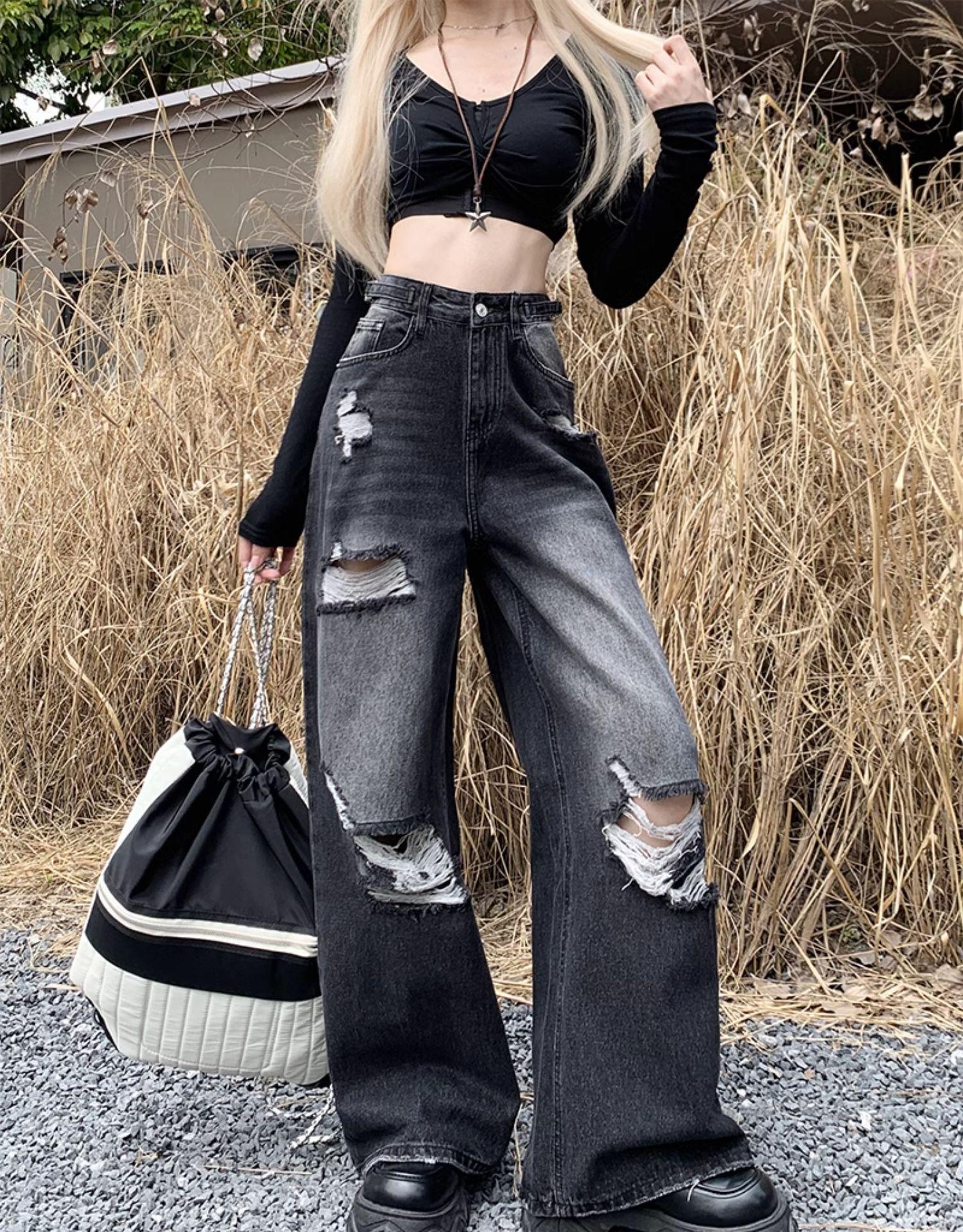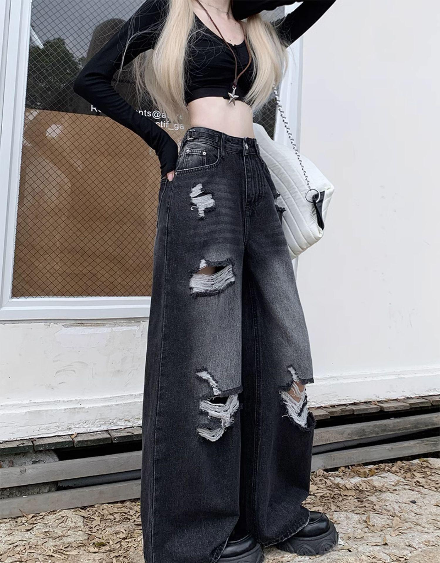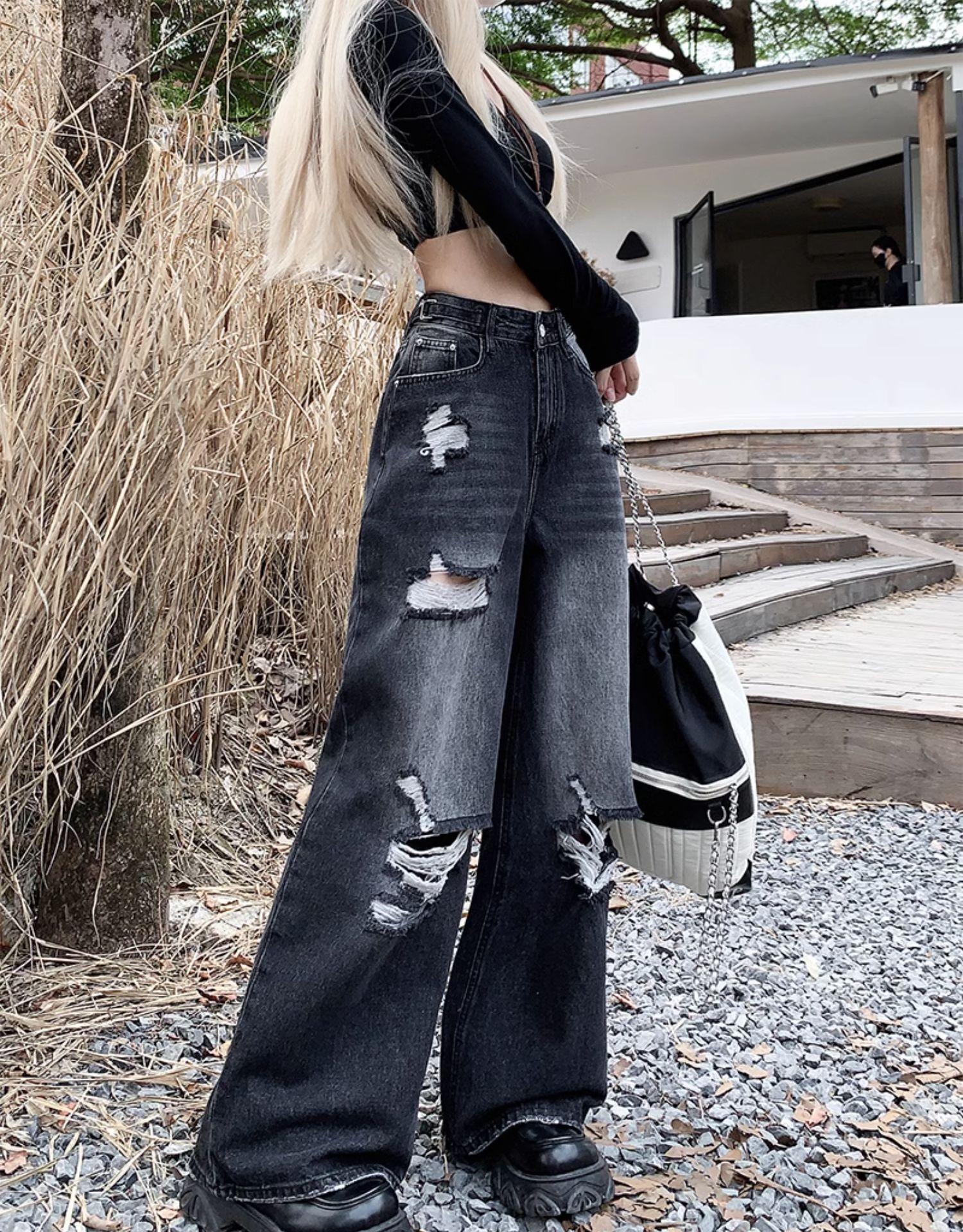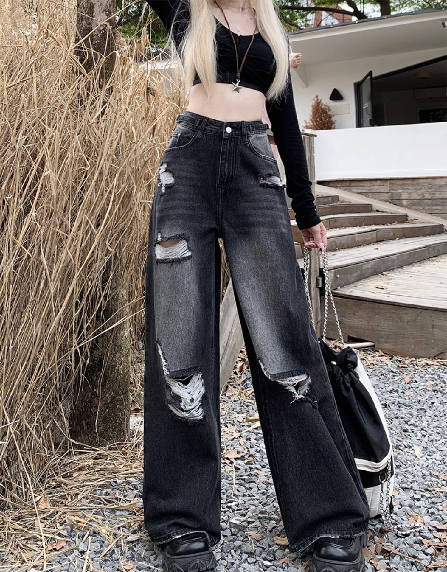 Talla Grande Figura en Forma de Pera Jeans Negros Rotos de Verano para Mujer Cintura Alta Rectos Sueltos Look Slim Pantalones Pierna Ancha