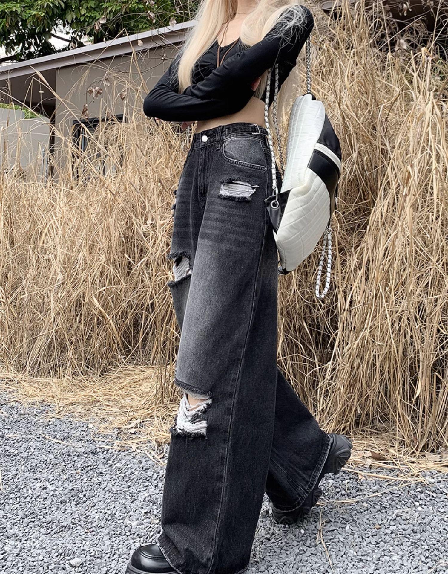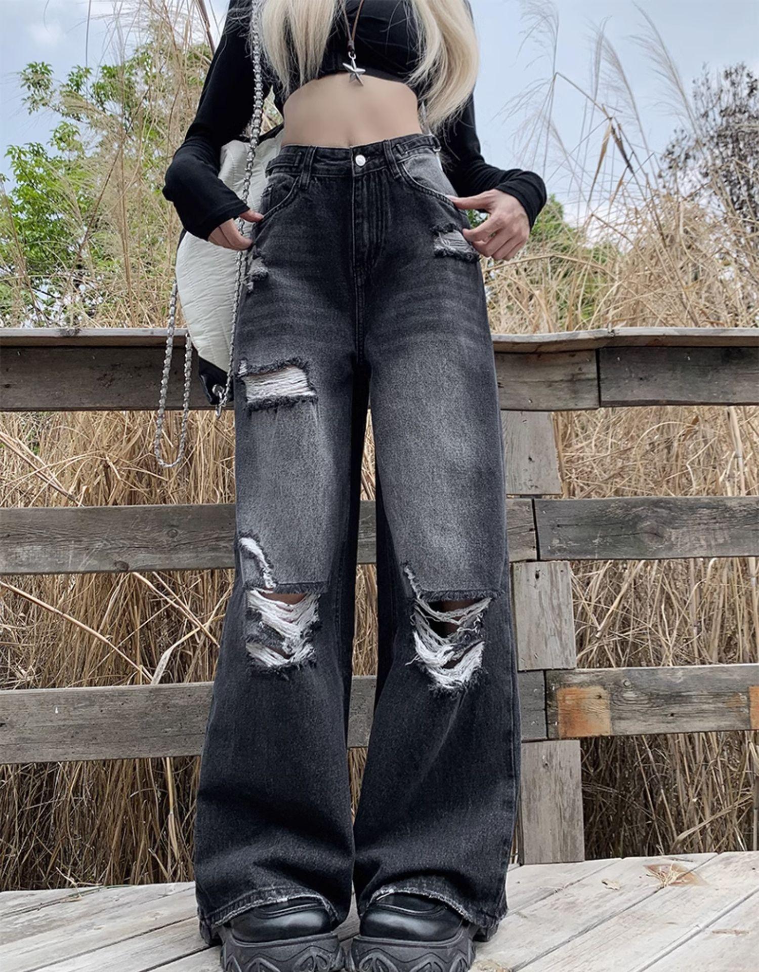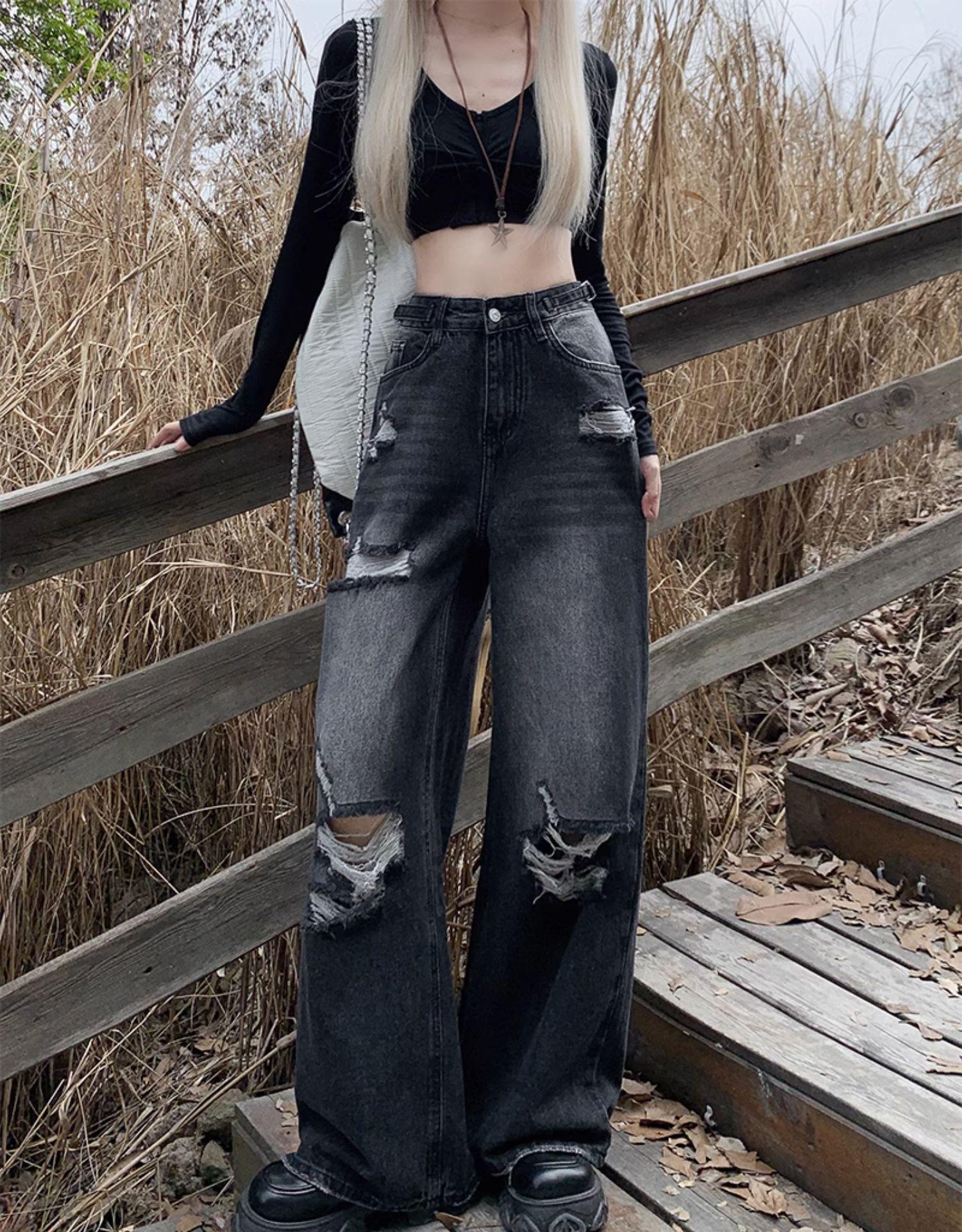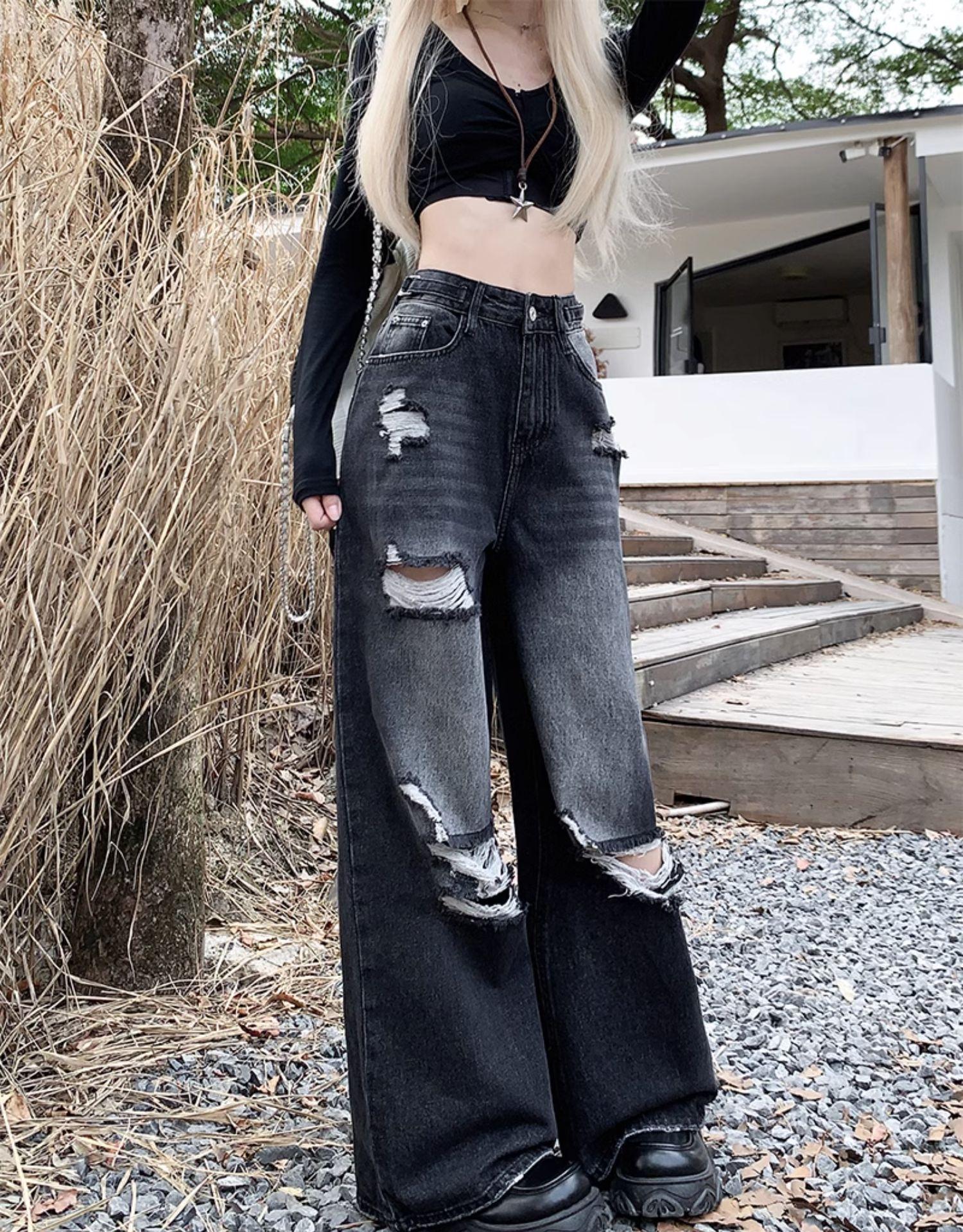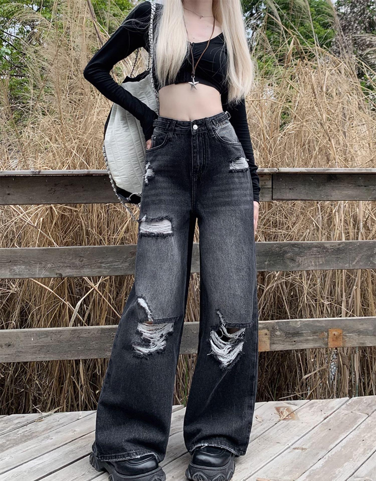 Talla Grande Figura en Forma de Pera Jeans Negros Rotos de Verano para Mujer Cintura Alta Rectos Sueltos Look Slim Pantalones Pierna Ancha