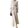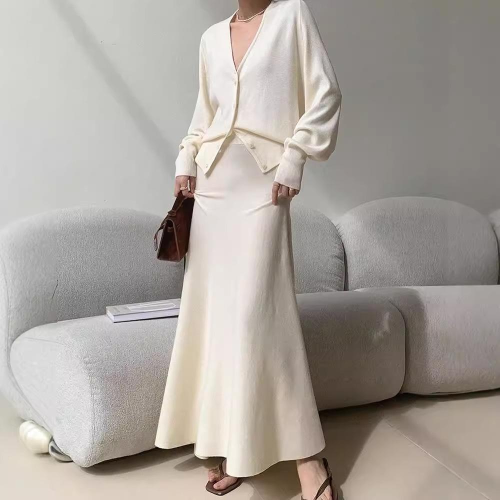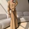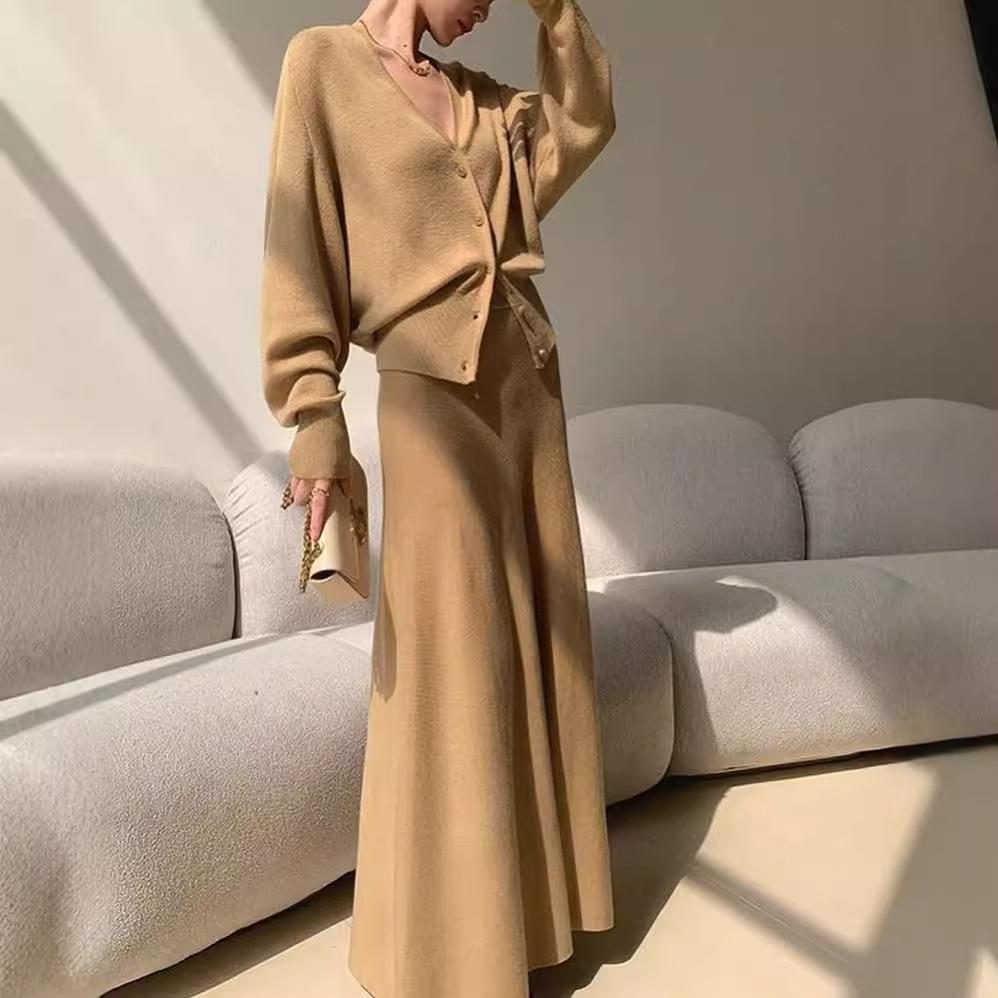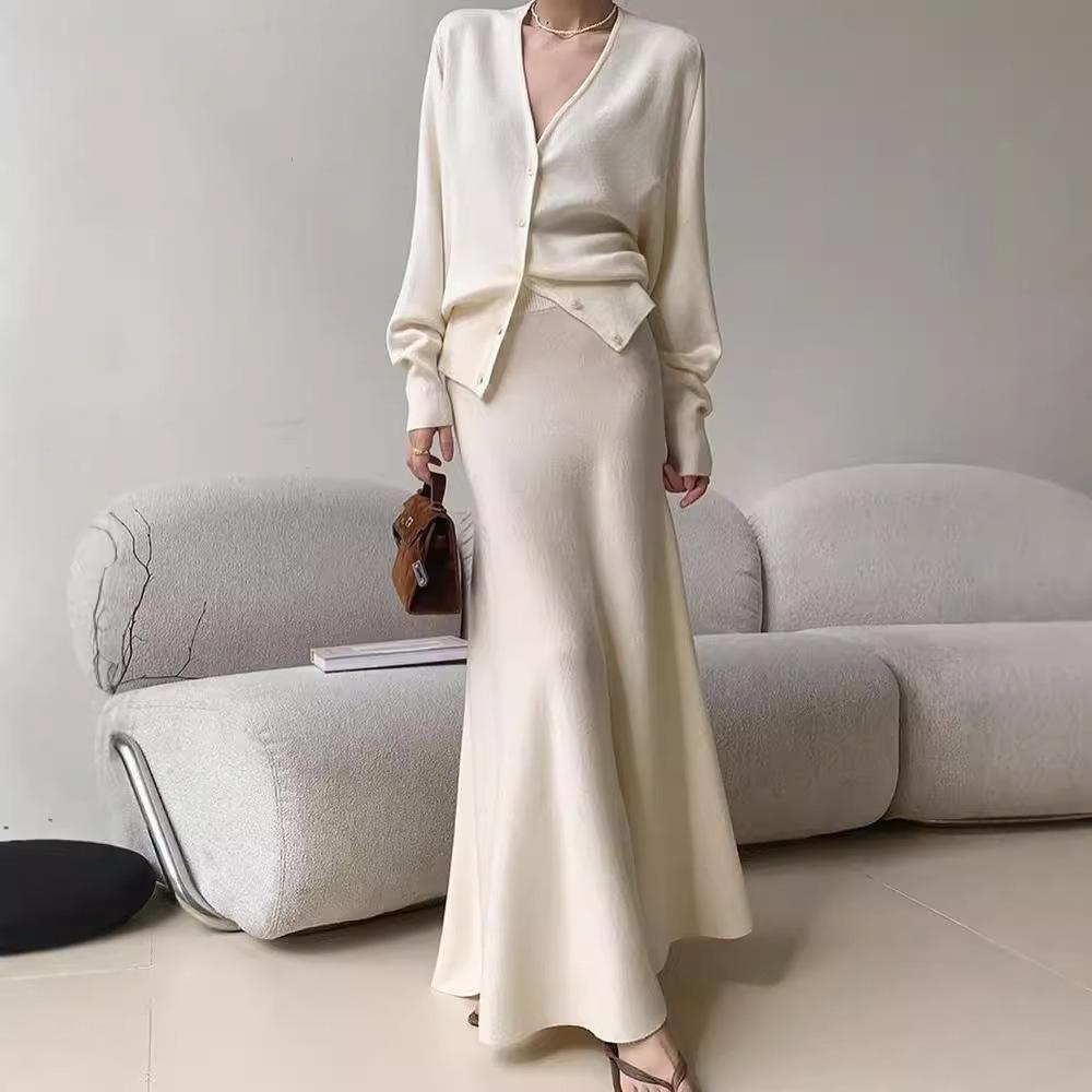 Otoño 2024 Nuevo Conjunto de Dos Piezas Europeo y Americano Amazon Transfronterizo para Mujer de Color Sólido Cuello en V Top Corto Ajustado Falda Línea A
