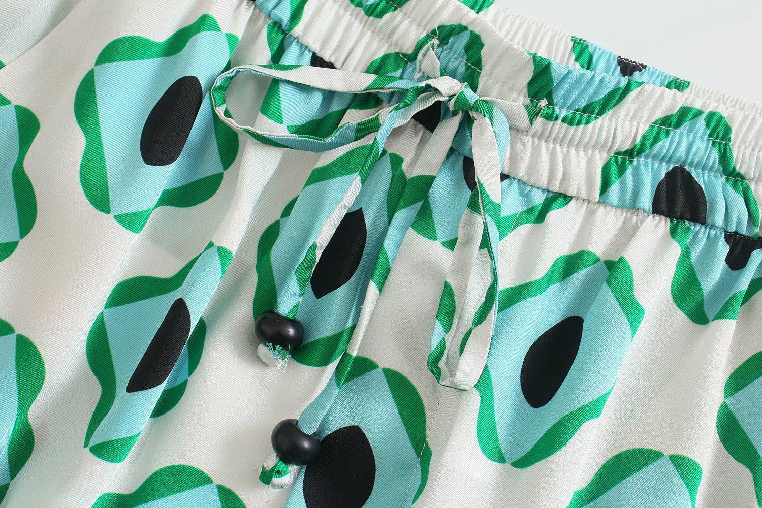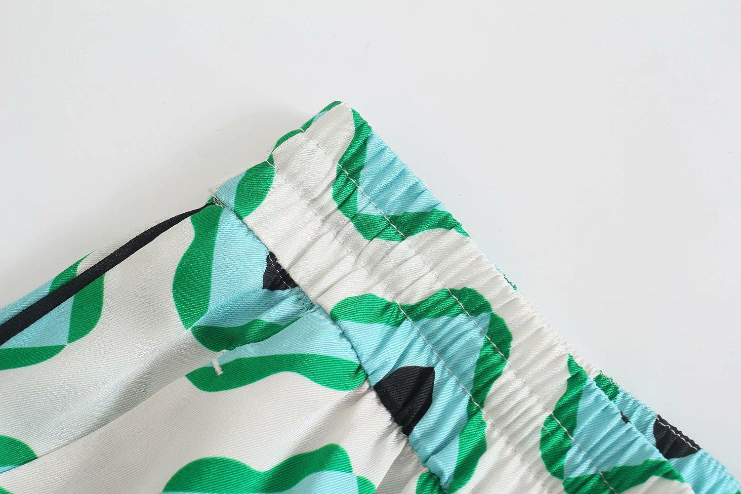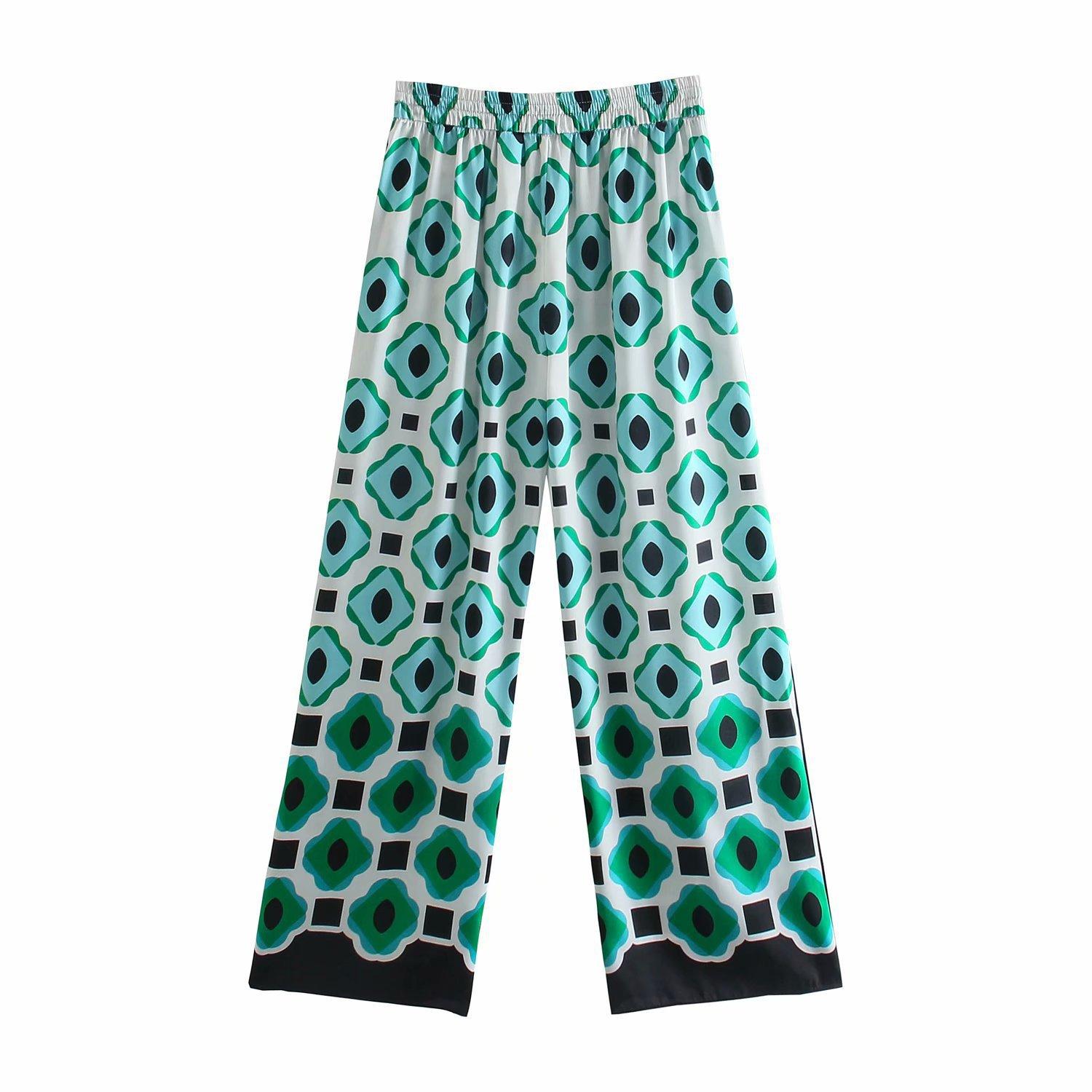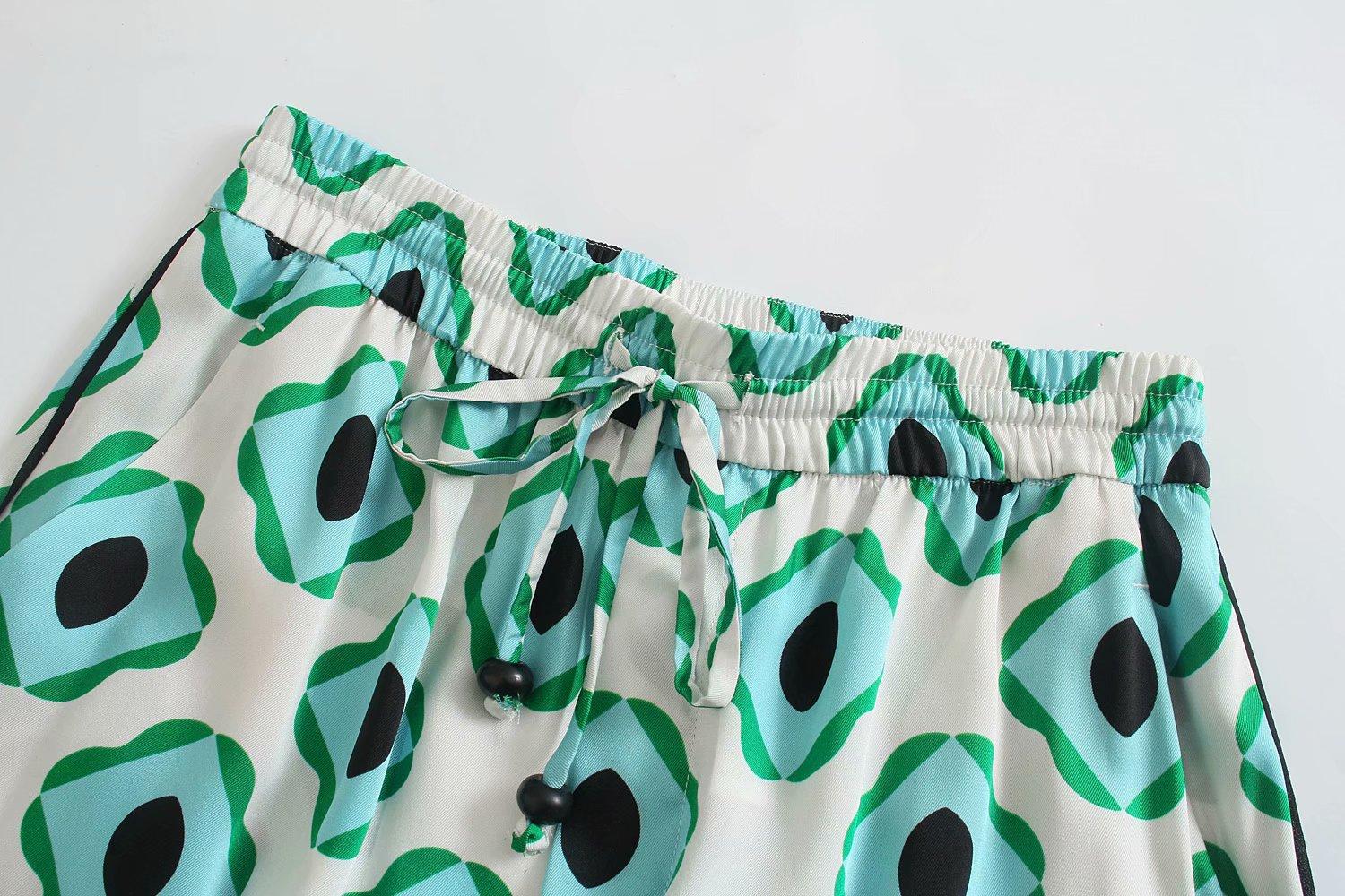 2628 Verano Nuevo Ropa de Mujer Europeo y Americano Solapa Manga Larga Camisa + Cintura Alta Cordones Estampado Geométrico Conjunto de Pantalones Casuales