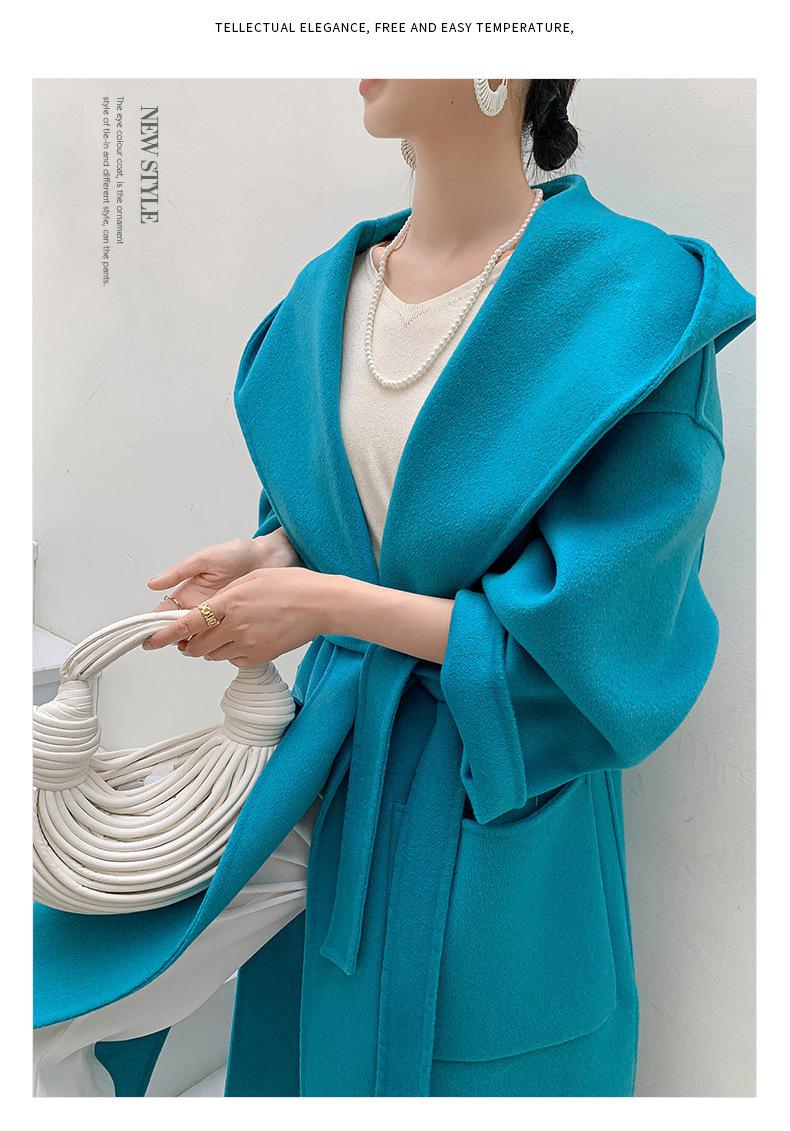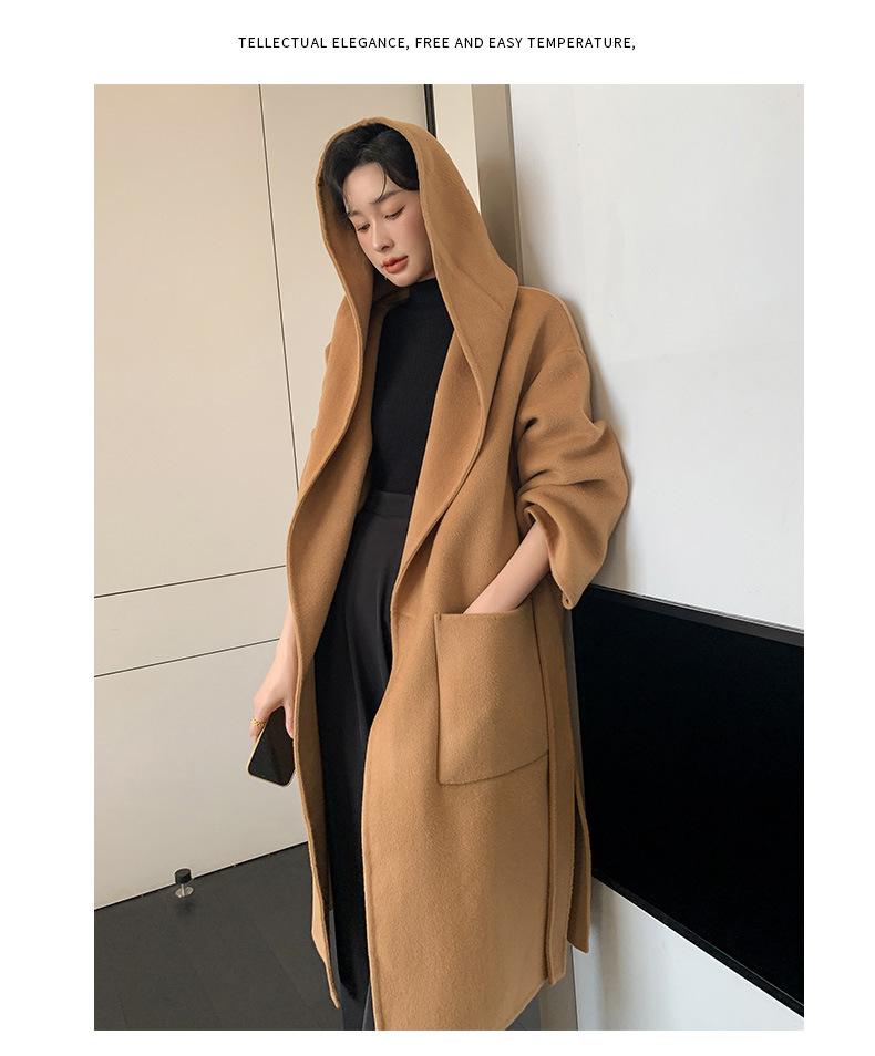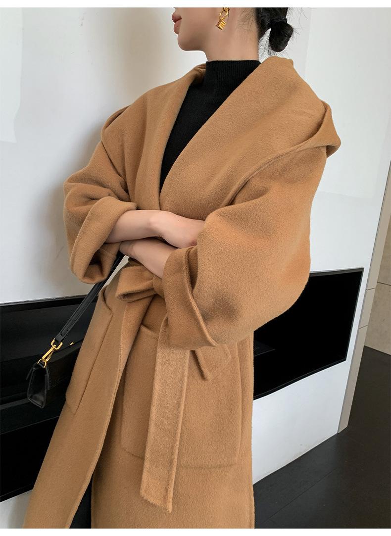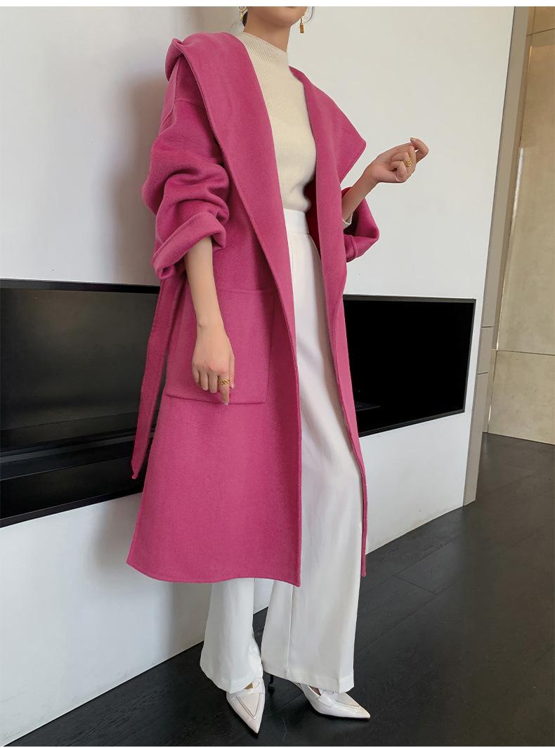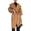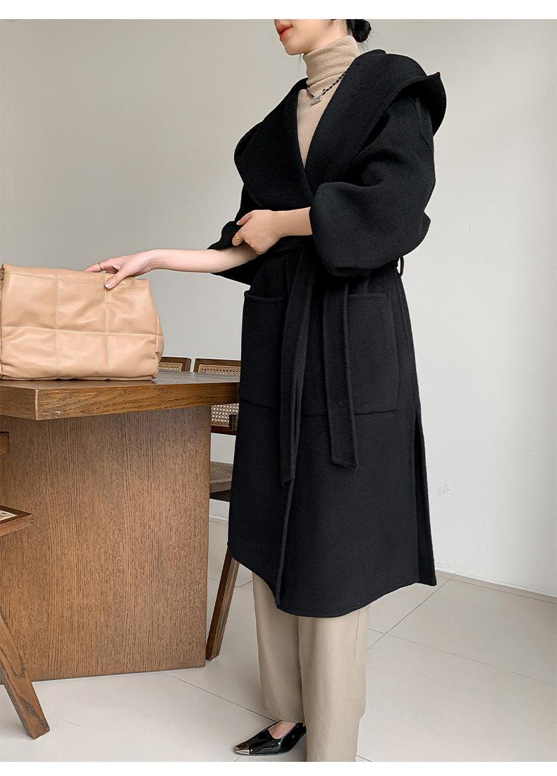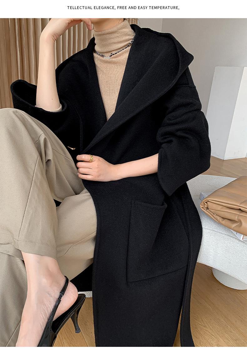 Abrigo de Lana Pura Tejido con Capucha para Mujer, Moderno, Holgado, Elegante, Sencillo, de Manga Larga, Color Sólido, con Cordones, de Lana a Doble Cara, con Bolsillo