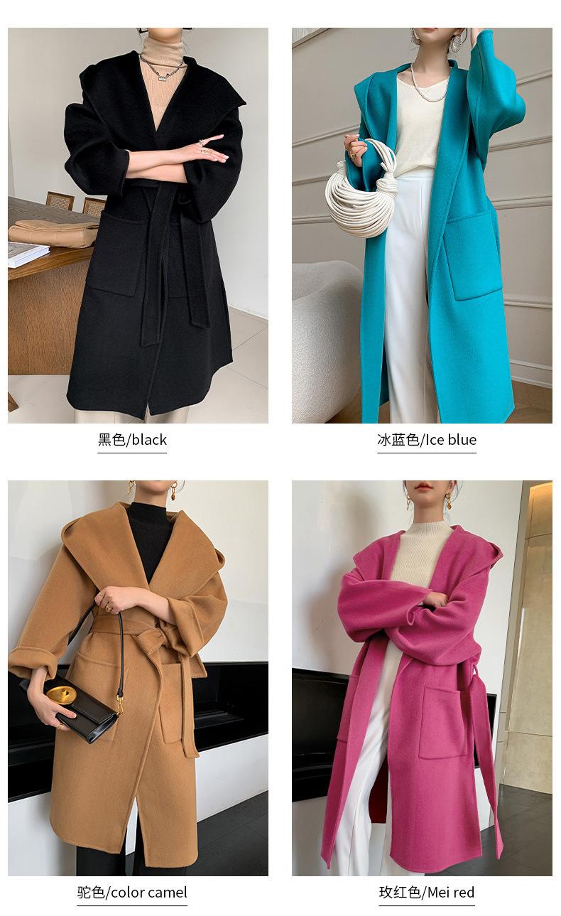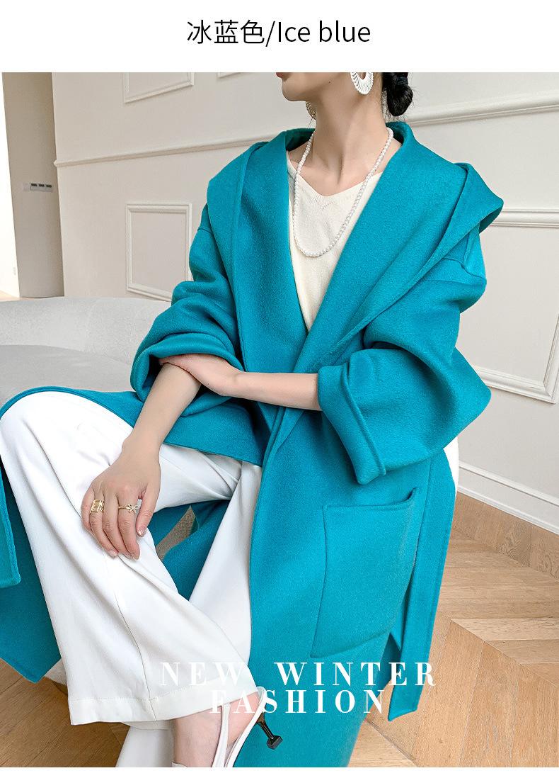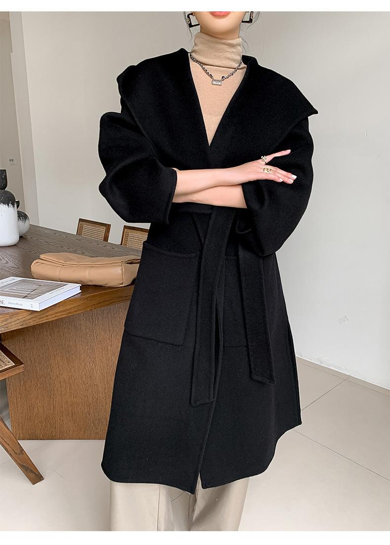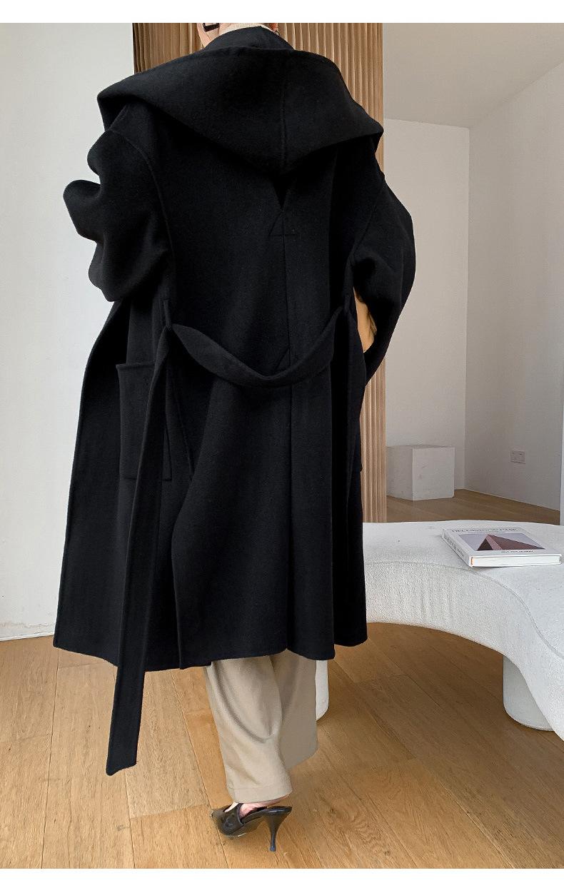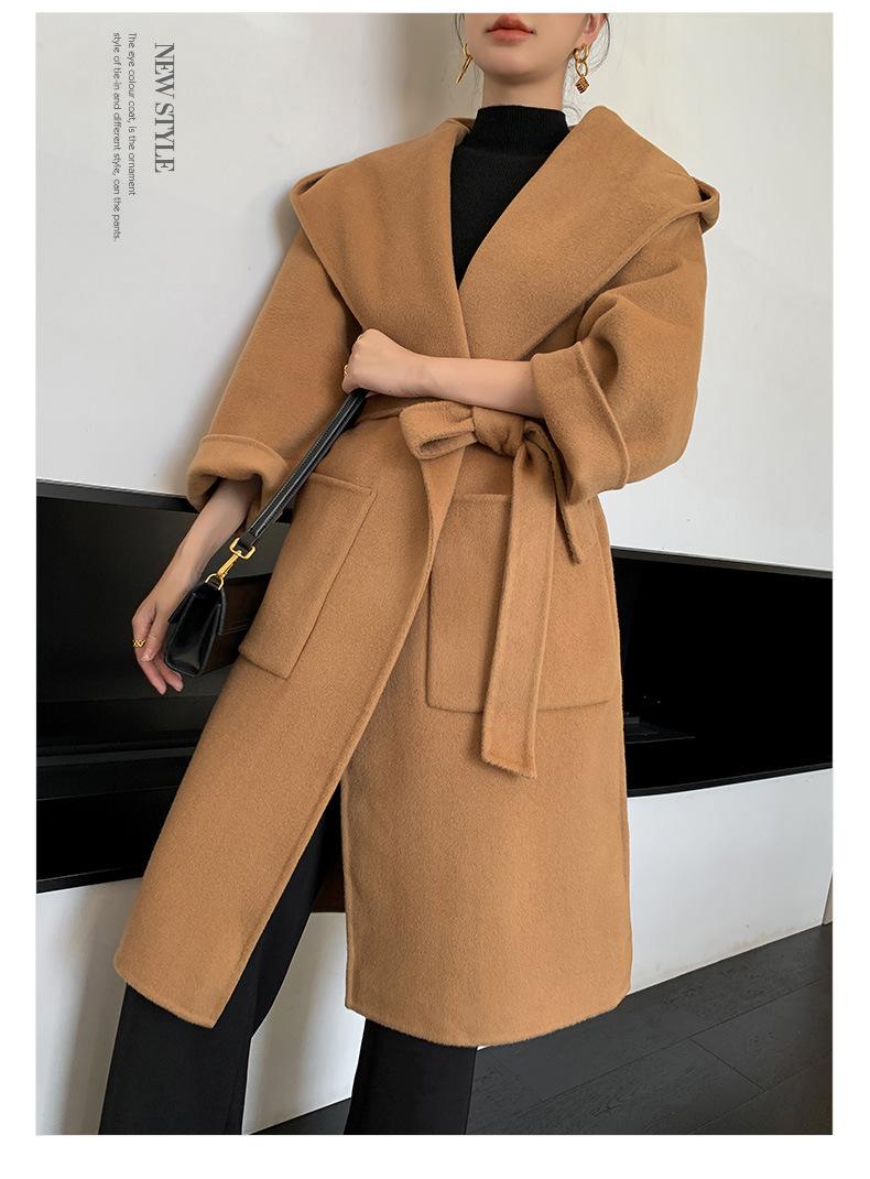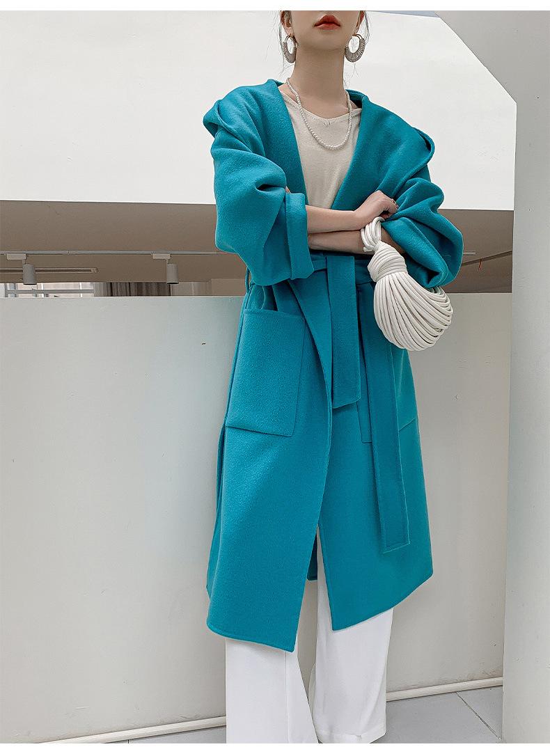 Abrigo de Lana Pura Tejido con Capucha para Mujer, Moderno, Holgado, Elegante, Sencillo, de Manga Larga, Color Sólido, con Cordones, de Lana a Doble Cara, con Bolsillo