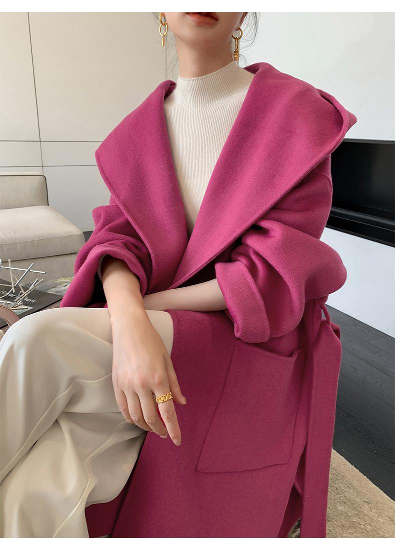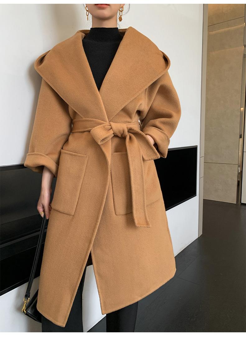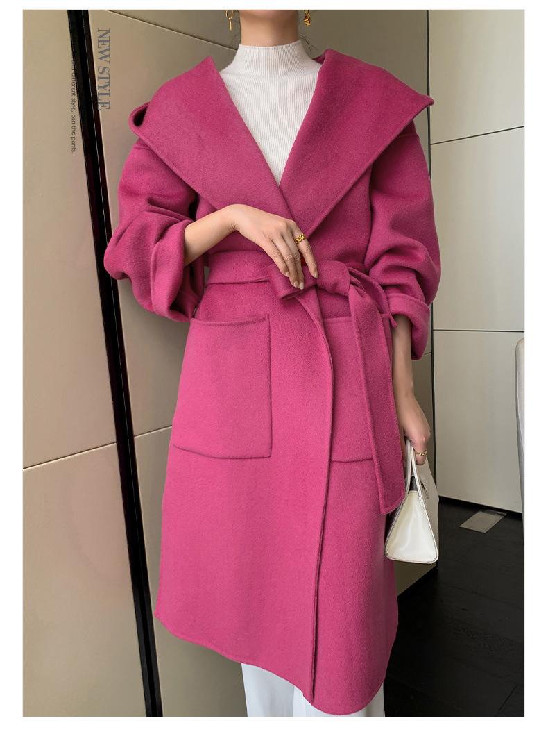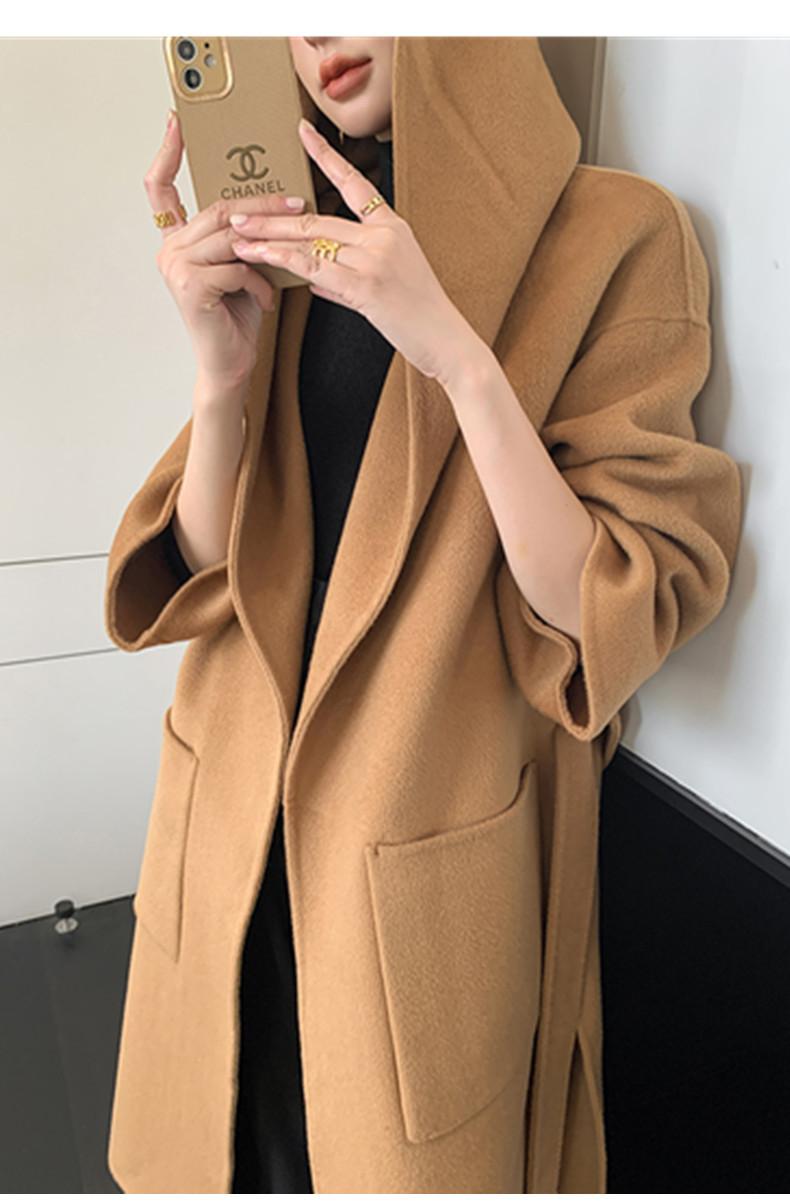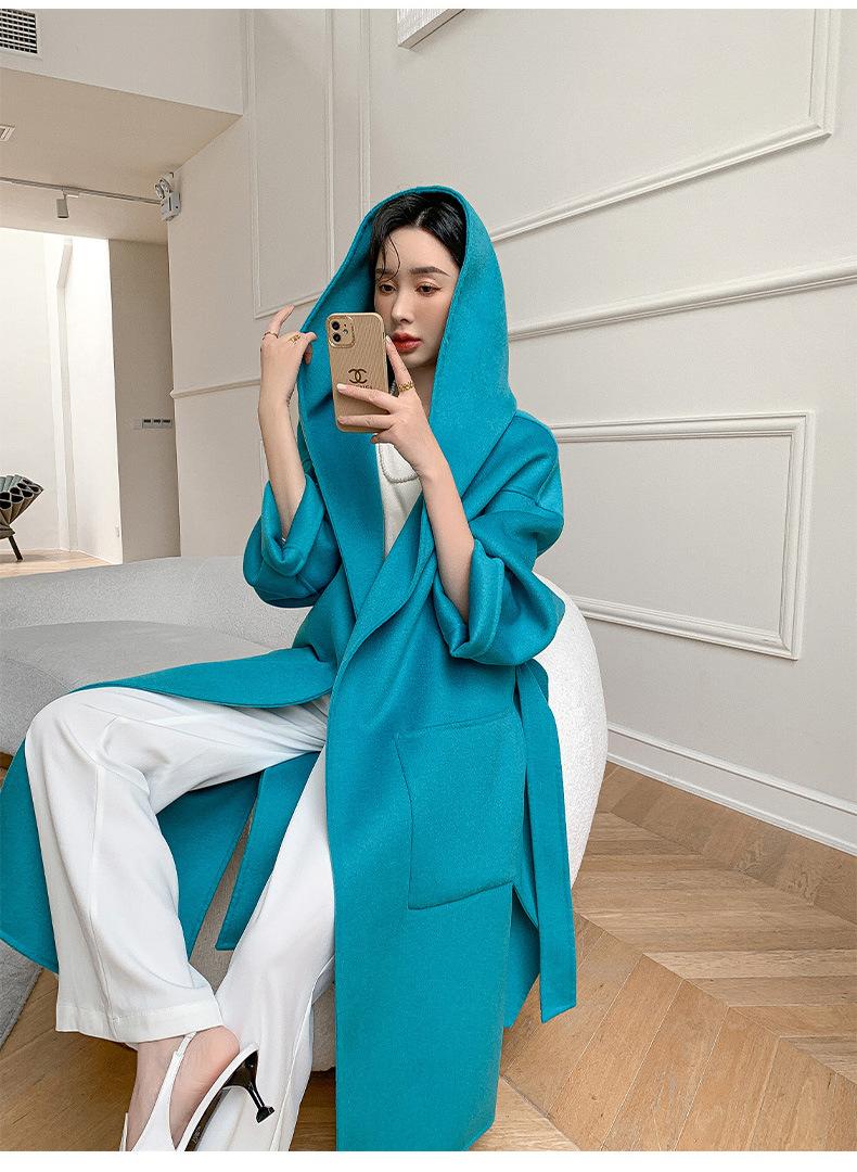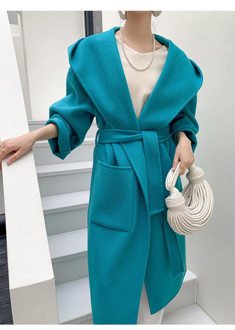 Abrigo de Lana Pura Tejido con Capucha para Mujer, Moderno, Holgado, Elegante, Sencillo, de Manga Larga, Color Sólido, con Cordones, de Lana a Doble Cara, con Bolsillo