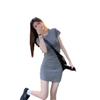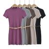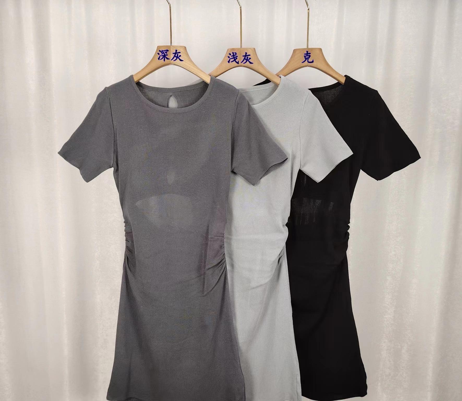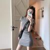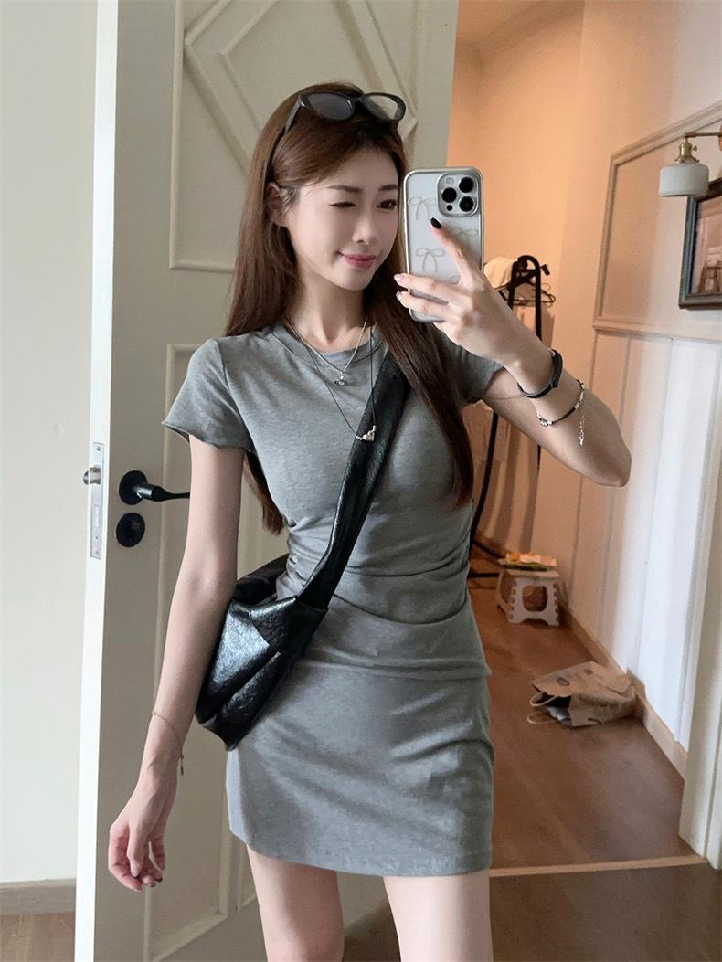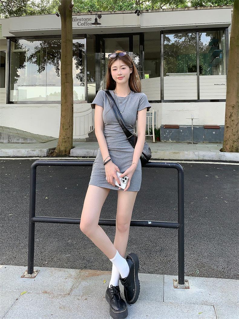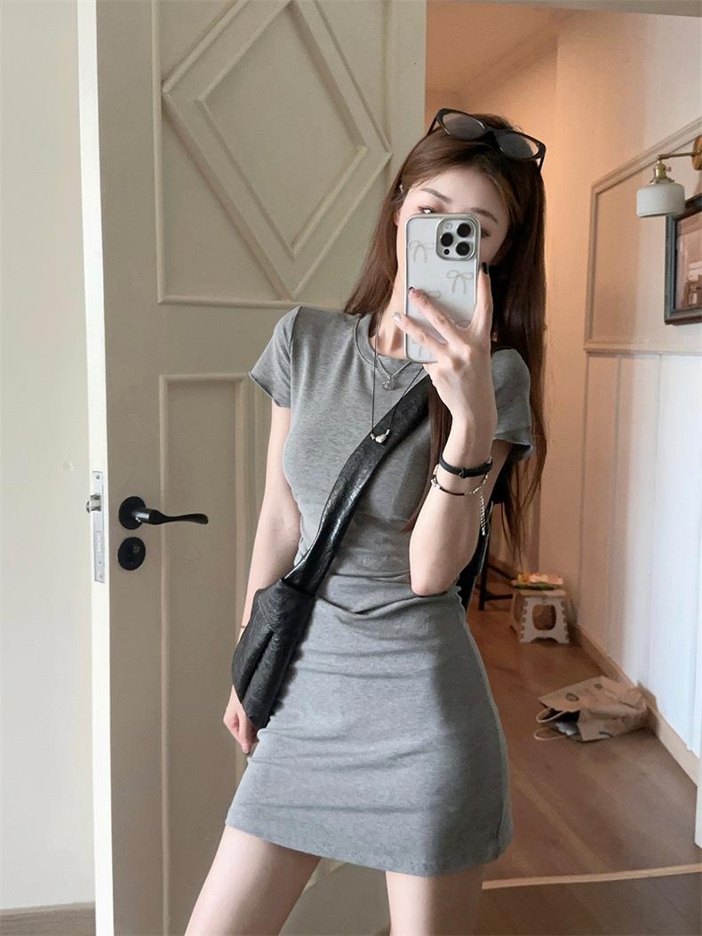 Vestido de verano nuevo de manga corta con cuello redondo, espalda descubierta y abertura en la espalda. Pure Spice Girl, cintura ajustada, falda corta gris ajustada.