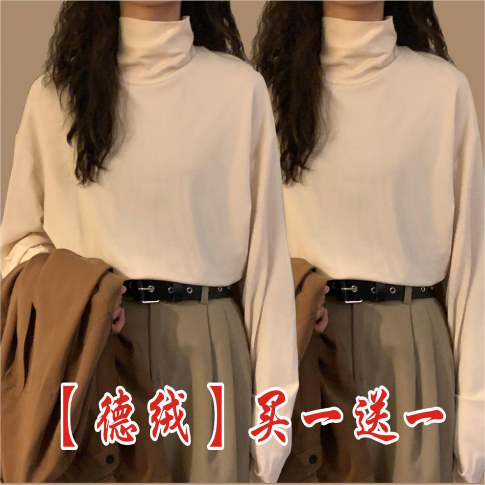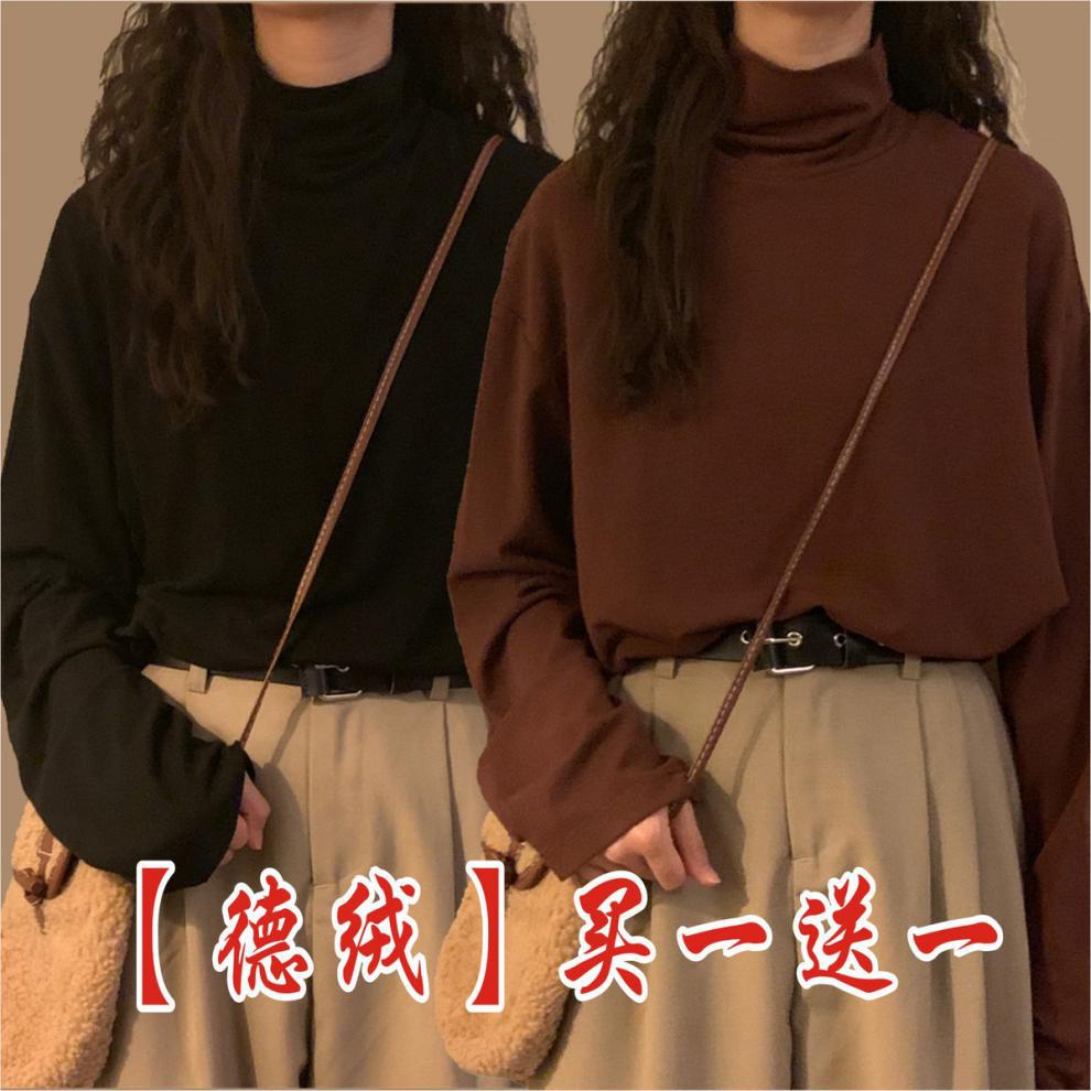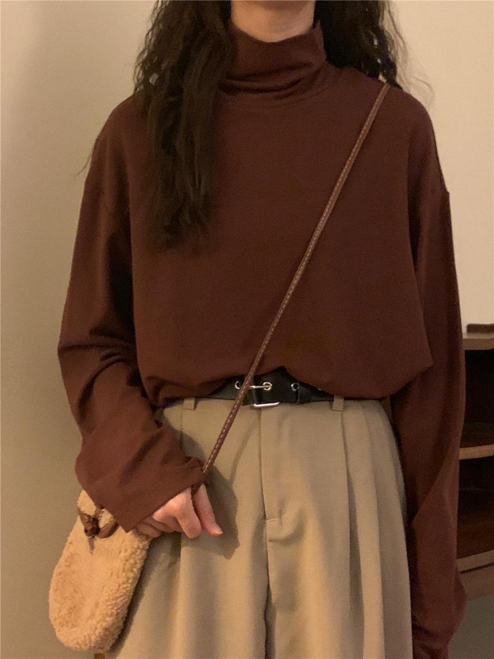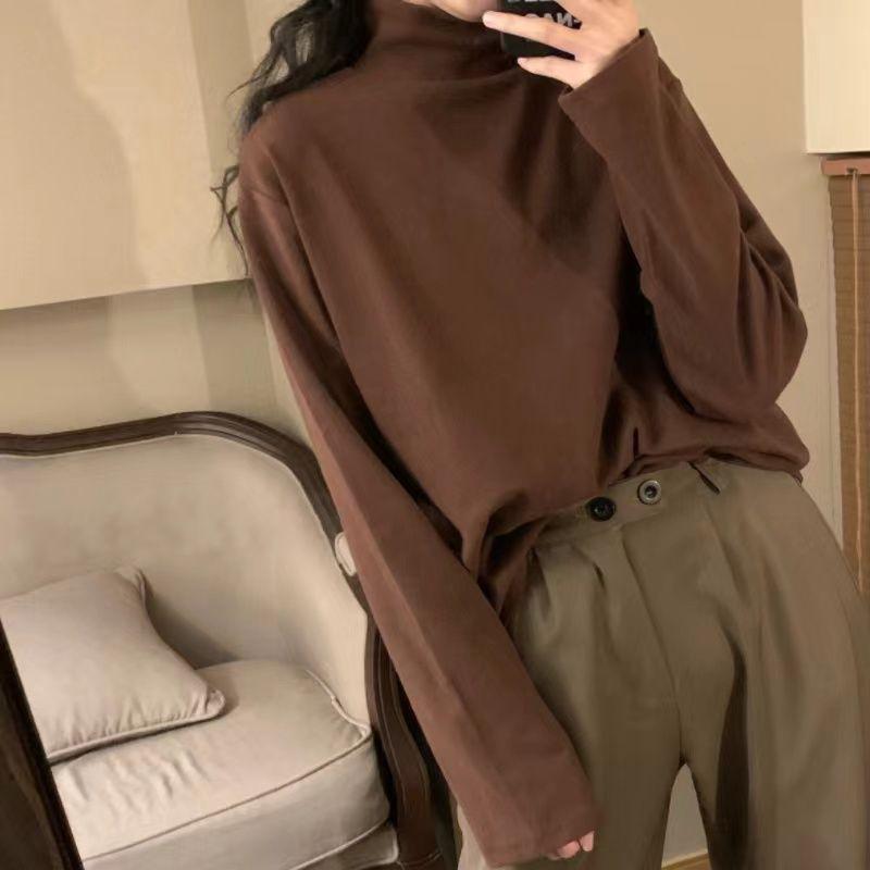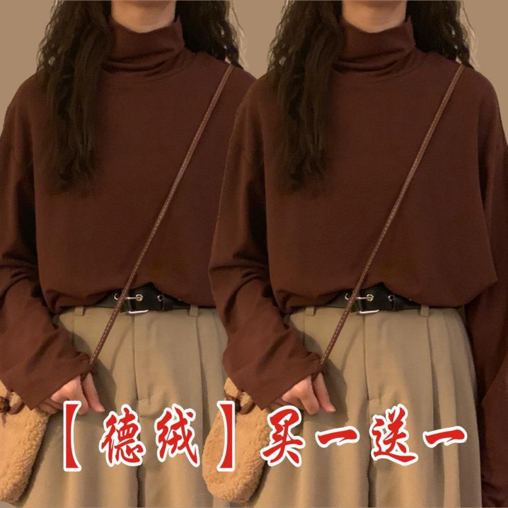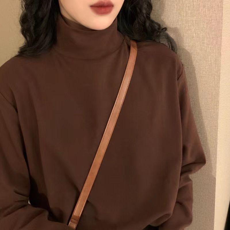 Camiseta de manga larga con cuello alto grueso y cepillado de terciopelo de estilo extranjero de otoño e invierno, camisa base para mujer con top ajustado coreano de color sólido